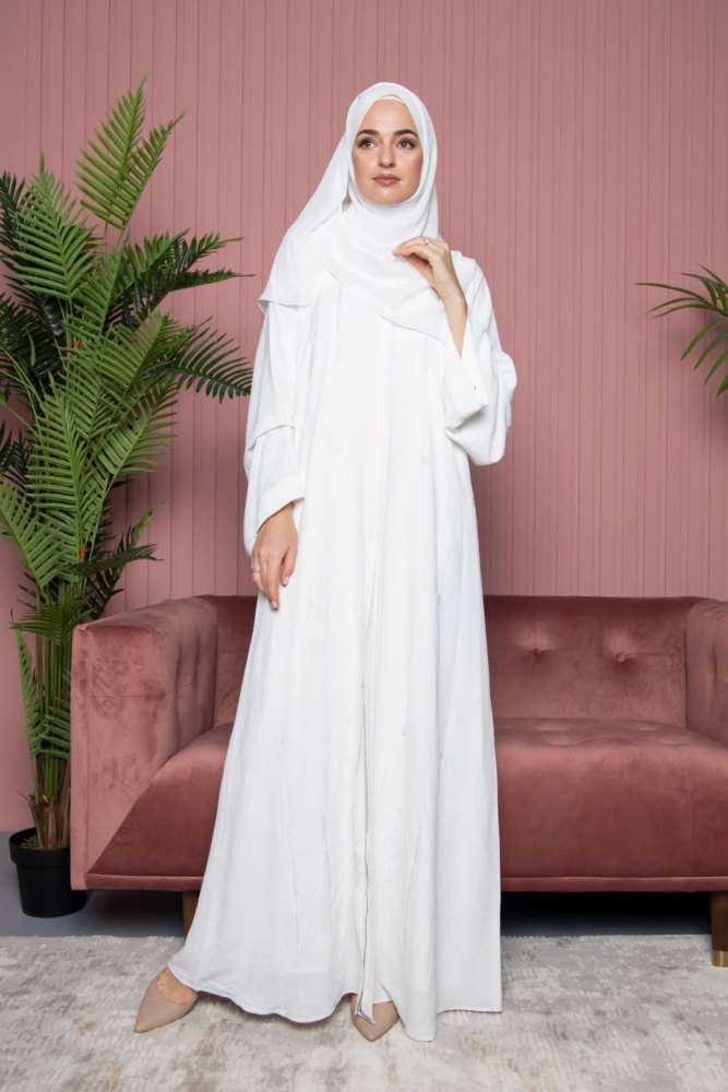 Beautiful Handmade Beads Abaya Eid 2021 Collection. This abaya is embellished with simple lines and sophisticated, sparkly handmade beads.