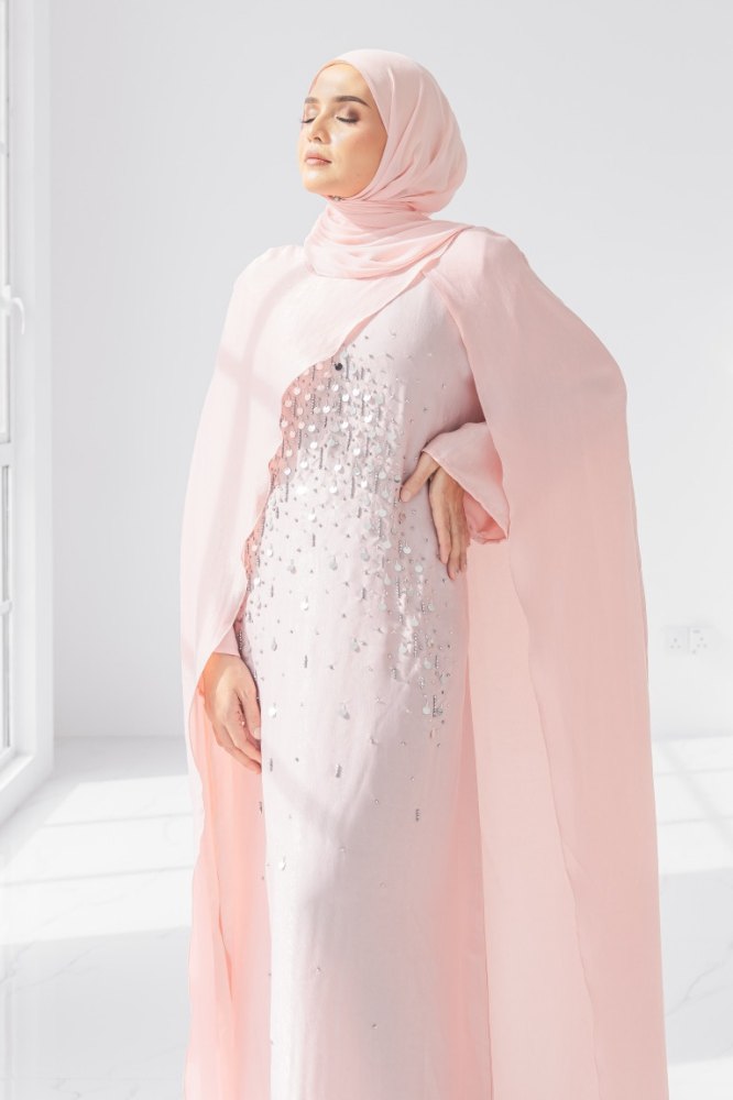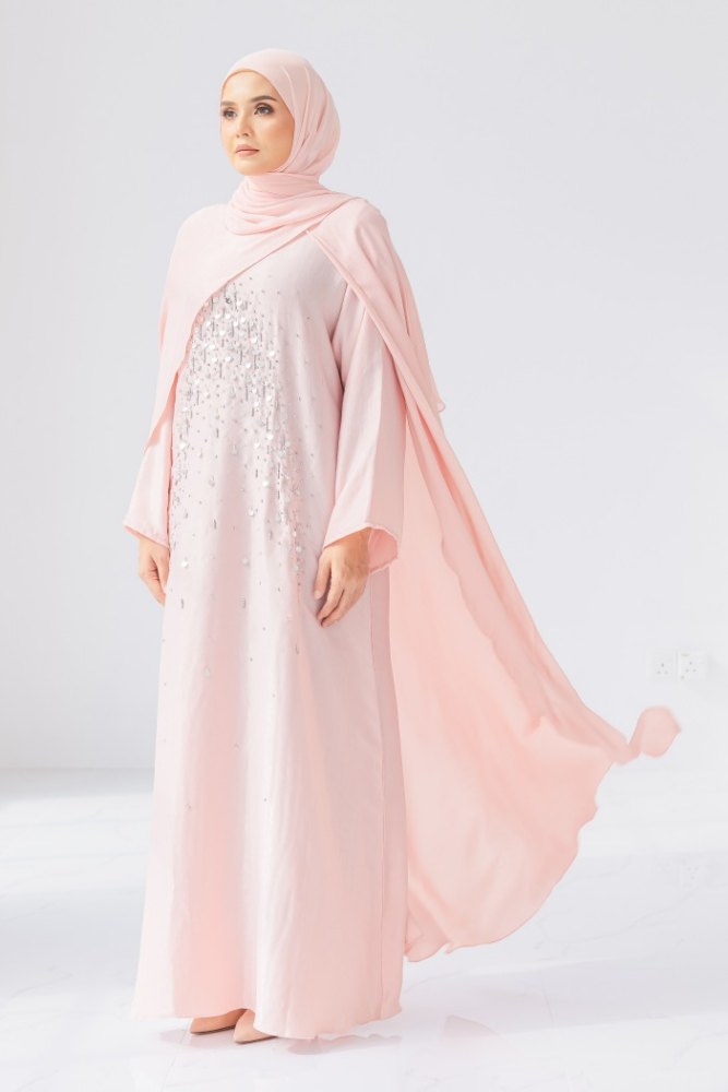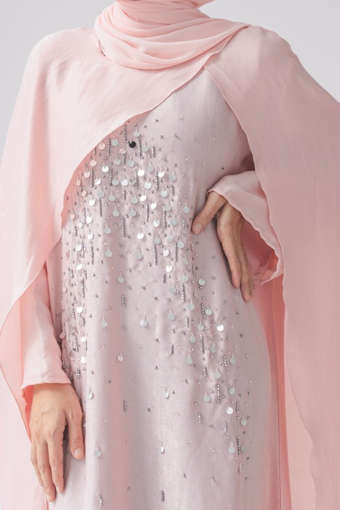 What looks more regal and elegant other than a beautiful, soft and flowy cape falling down your shoulders? Radiate your royal princess and queenly look in our latest Luxe Collection – Ridaa Abaya. Not just the cape, this abaya is embellished with splendacious and sparkly sequins and beads around the middle of the garment. Definitely the most perfect abaya you must wear on your most special occasion!