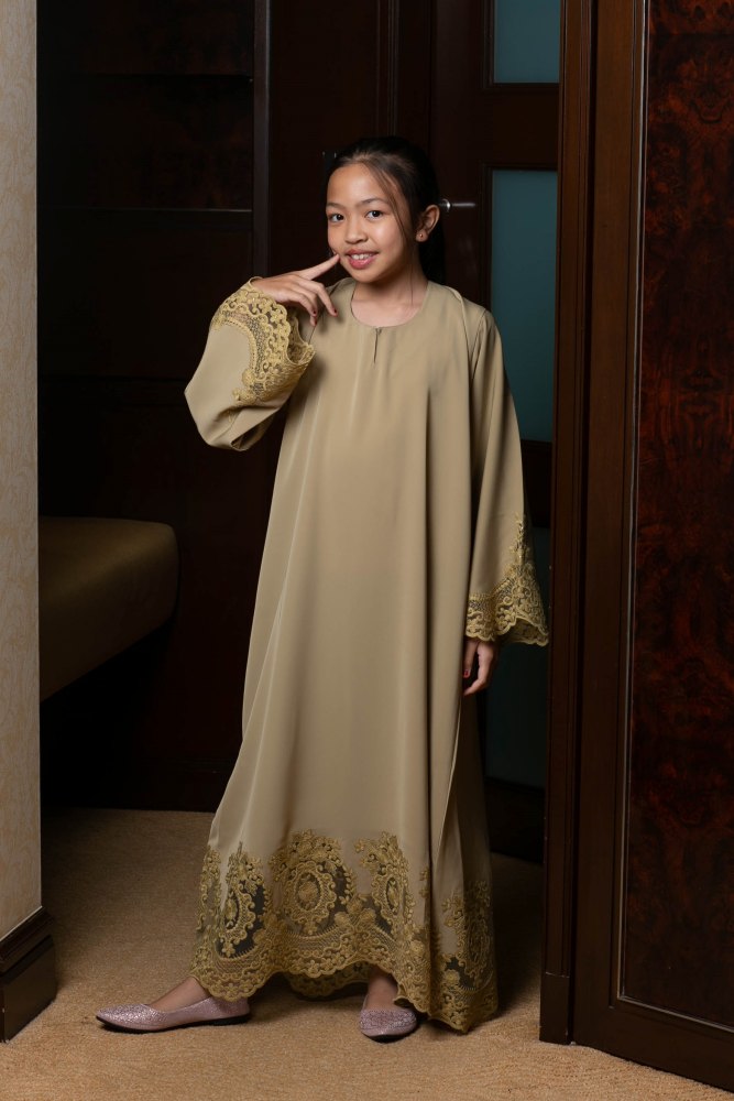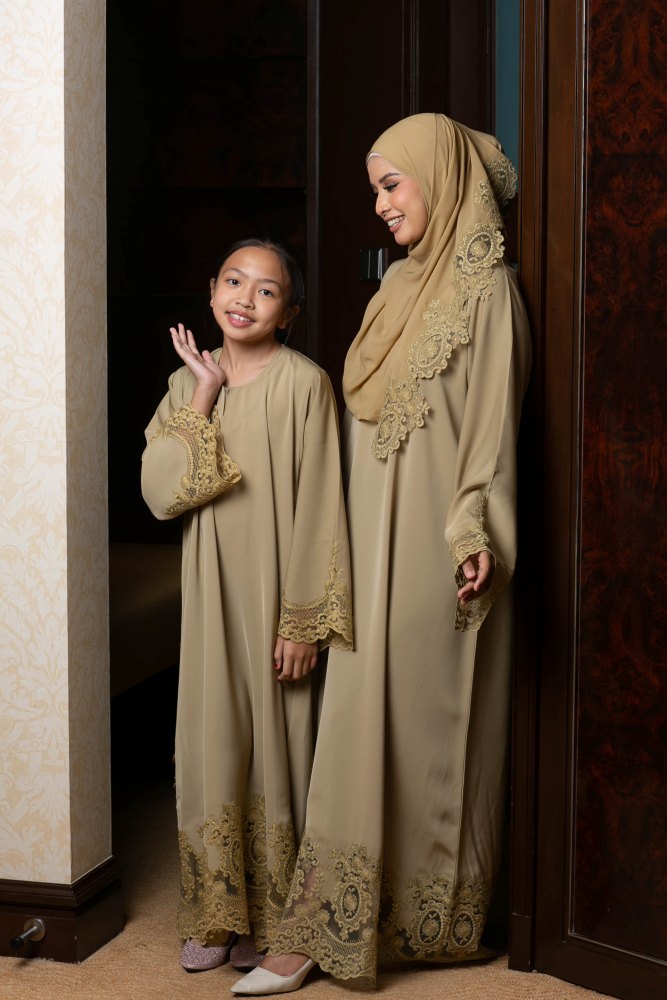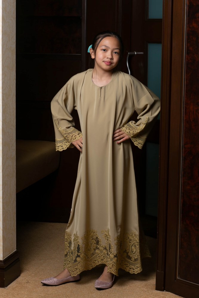 Glow in this simple yet elegant Suri Abaya! This abaya is adorned with beautiful and intricate lace around the lower sleeves and hemline. It also comes with a matching lacy shawl that is perfect for any occassions.