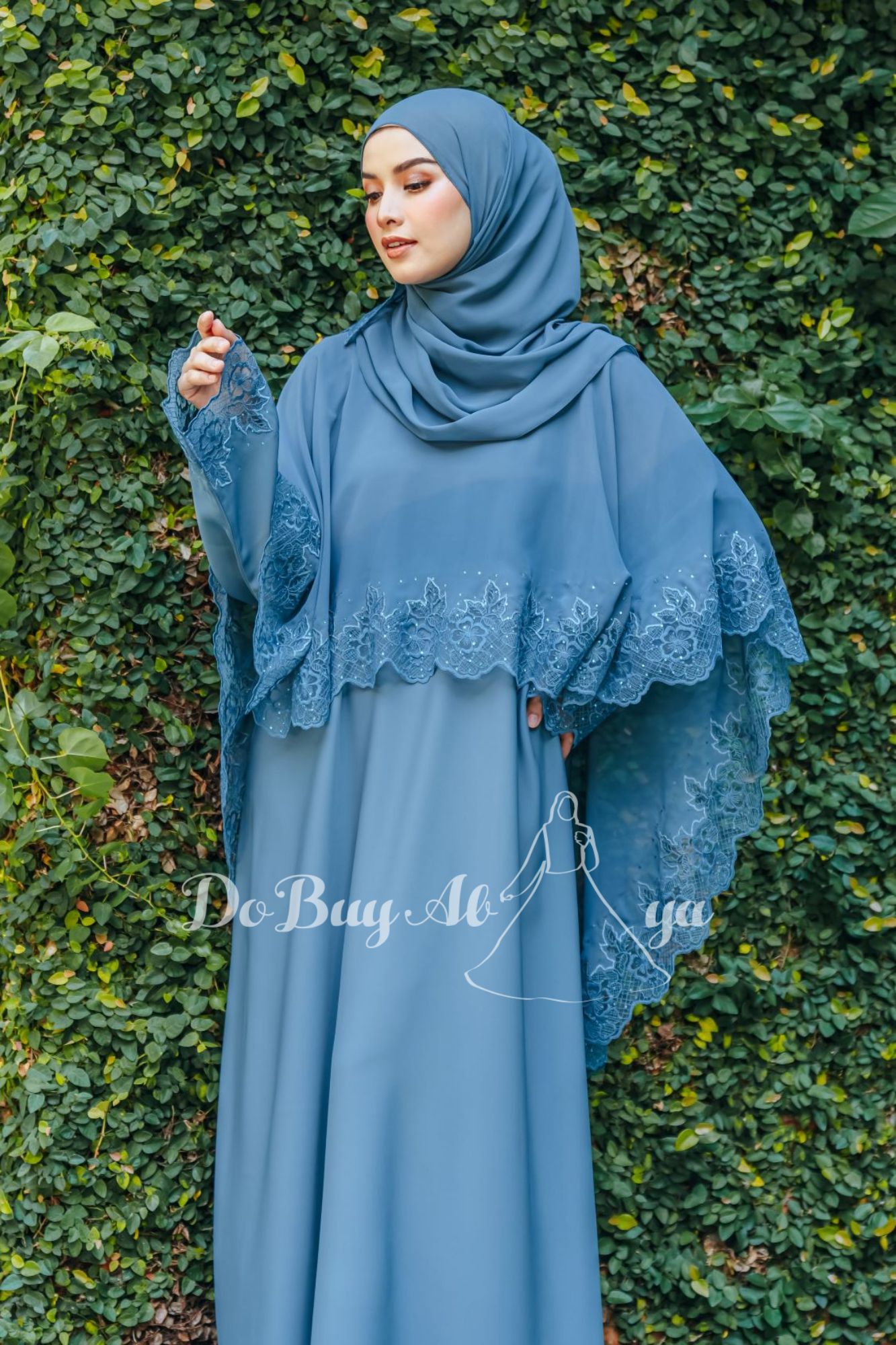 Eid Adha Collection 2023 – Zehra Cape Abaya. One can never go wrong with cape. Cape is back in this latest collection! But with beautiful flowery lace and sparkly stones around the hems of the cape and sleeves! This abaya is made of two different fabrics: Nida for the inner layer and flowy Chiffon for the outer. This abaya comes with a matching shawl to complete your eid look!