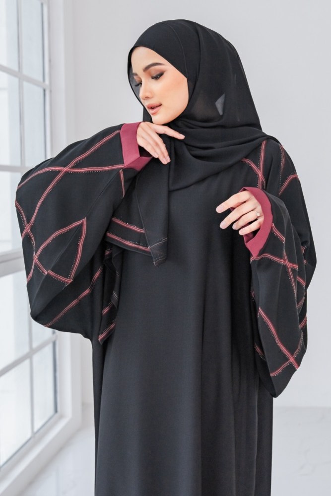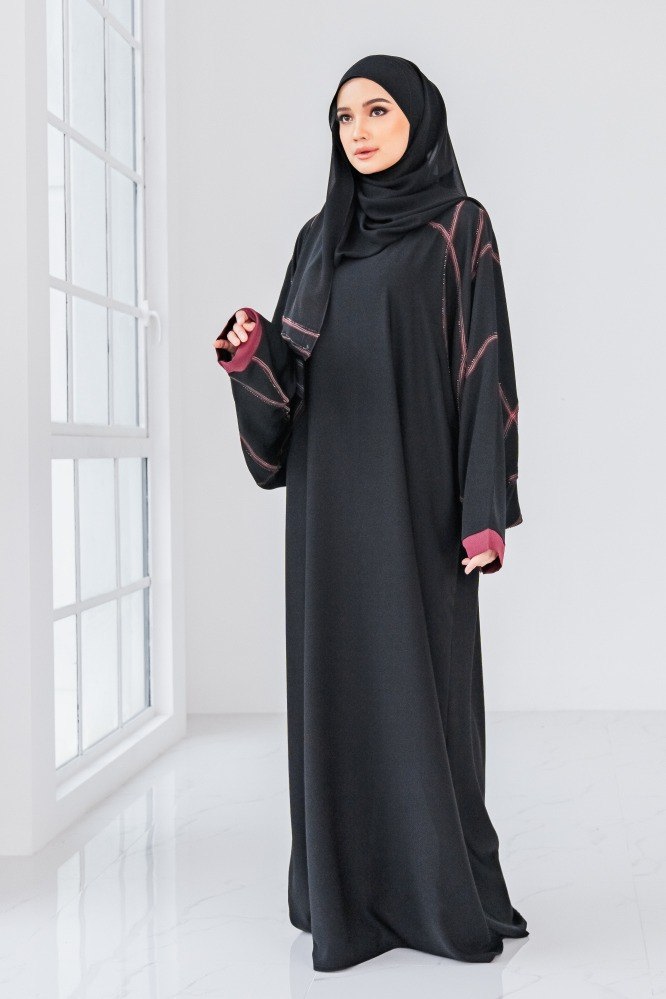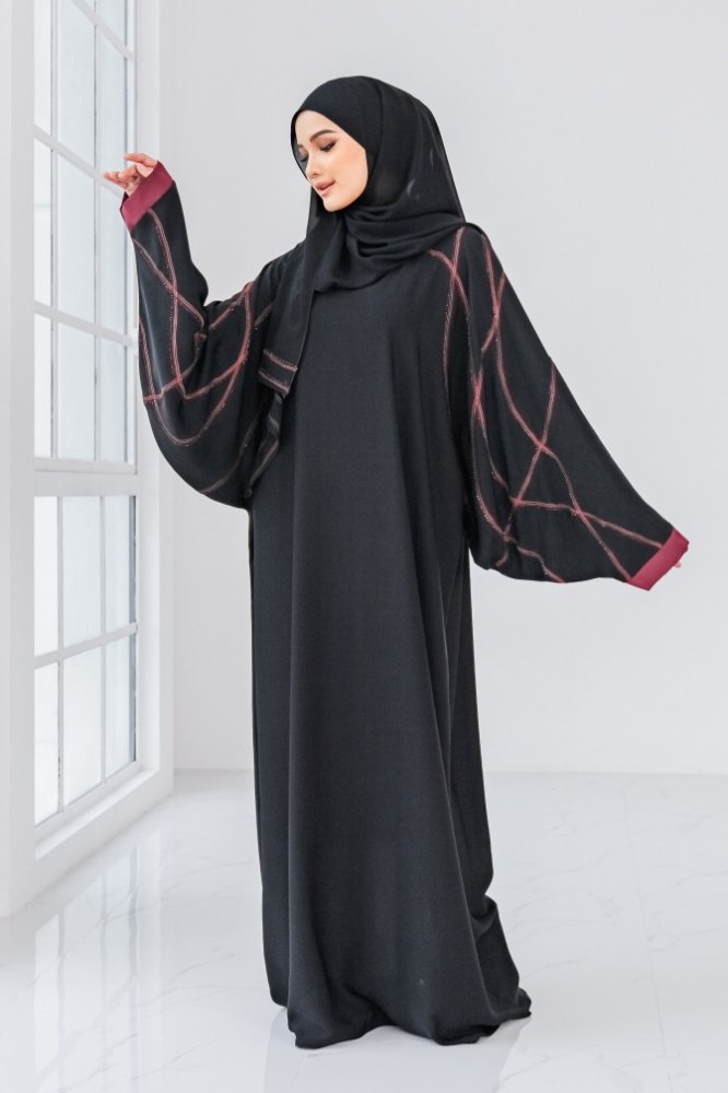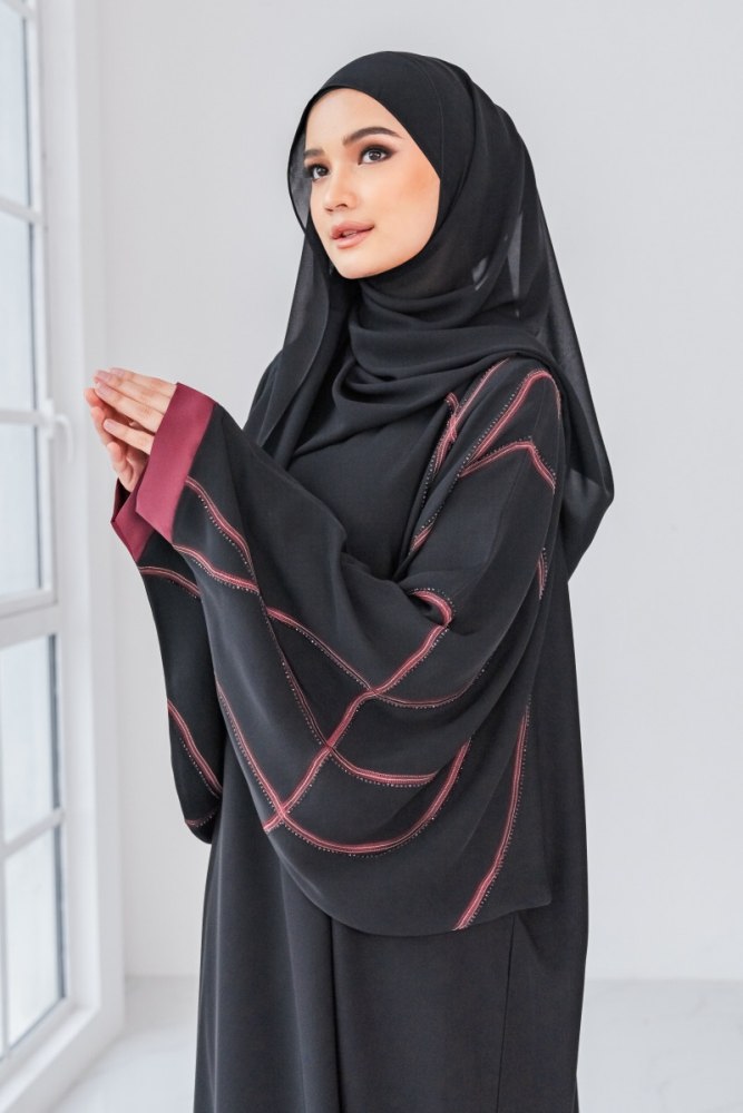 Latest in our collection is – Emilia Abaya. It is the epitome of modern, suave and fashion-forward abaya which will bring your look to the next level! Simple yet stunning with its sleek red coloured embroidery lines with sparkly black stones. Its batwing styled sleeves add a stylish flair to the abaya and provide an extra detail to make you stand out in it. Perfect for casual, raya and any festivity celebrations.