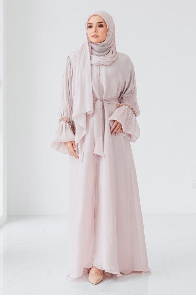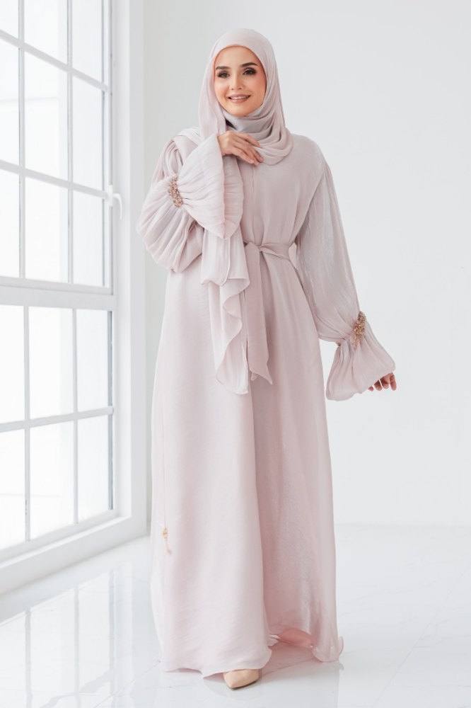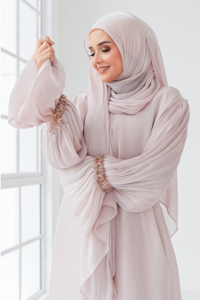 Incorporate soft shimmers into your daily look with this new variation of Maya Abaya – Maya Crystal. This abaya is made from a lightweight and sheer Rose Organza fabric that is delicate, graceful and comfortable to wear. Its bishop-poet sleeves are embellished with beautiful sparkly crystal beads around the arm. For this Rose Gold coloured abaya, its crystal are in soft multicoloured beads. Perfect for this eid, special occassions and any festivity celebrations!