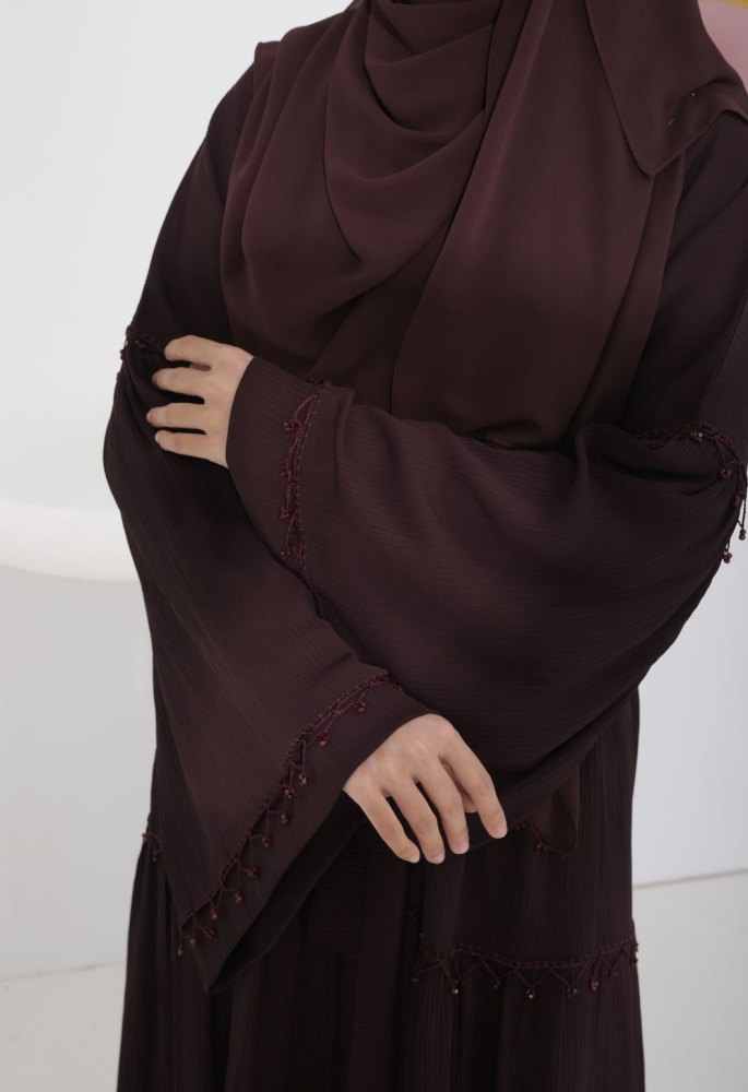 Flare abaya with 3 level pleated layers of handmade beadings .  3 layer matching drape beads front and back . Beautiful and mesmerising !