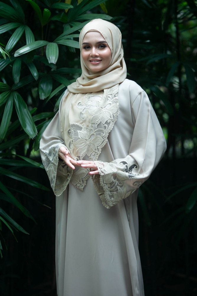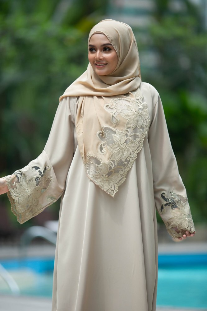 Beauty in simplicity! Glow in this elegant Lotus Abaya. This abaya is adorned with beautiful and intricate lace in lotus flower motif around the sleeves and hemline. It is simple yet graceful enough for any special occasions. This abaya comes with a matching shawl.