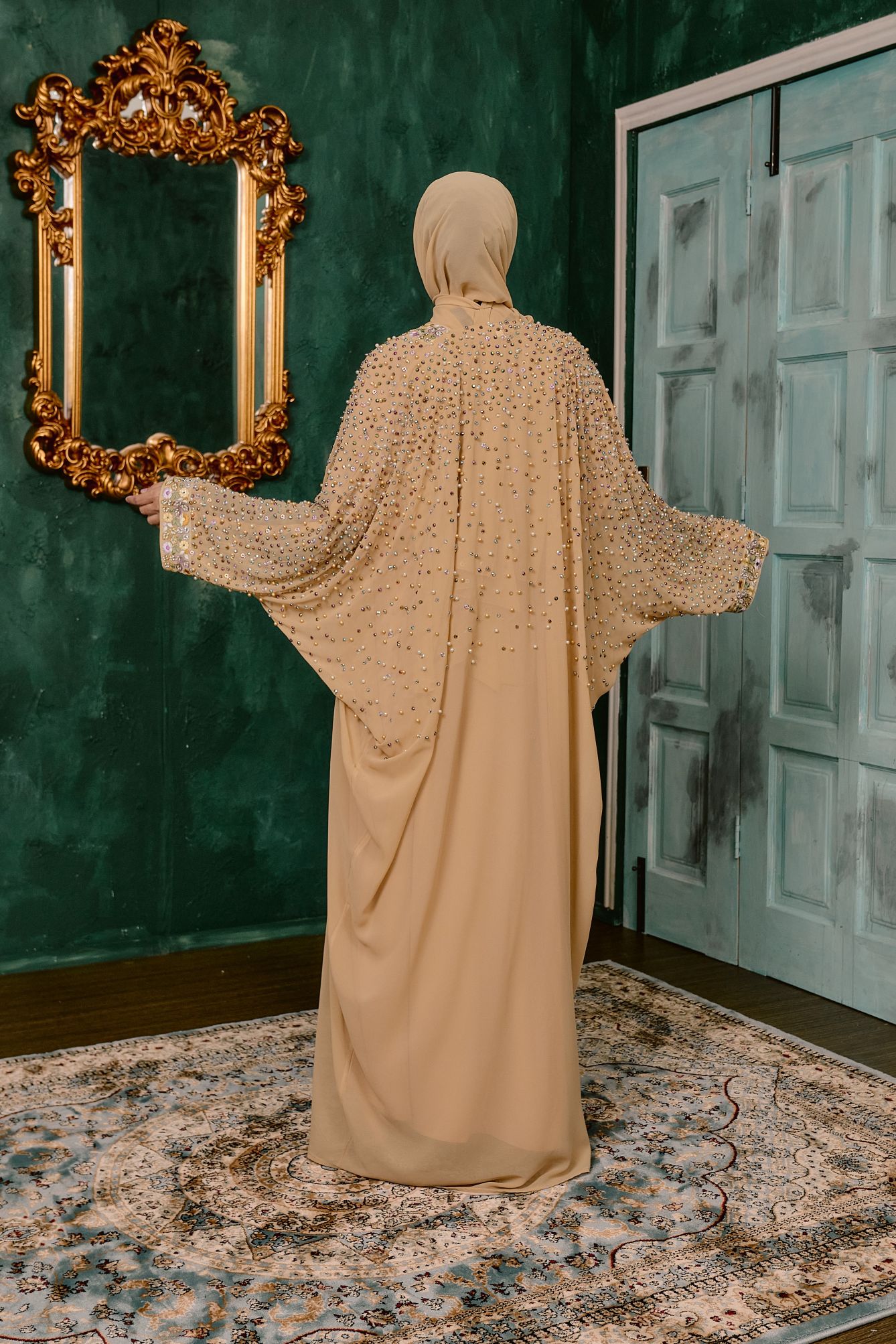 This elegant abaya features a flowing Farasha cut that creates a soft, graceful silhouette with effortless movement. Designed with a smooth nida inner layer and a lightweight chiffon outer, it offers both comfort and a delicate, airy finish. The front panel and cuffs are beautifully detailed with floral embroidery lace, adding a refined and feminine touch. Scattered stones and pearl embellishments shimmer subtly across the chiffon, giving the piece a luxurious sparkle without overpowering its elegance. Perfect for special occasions, this abaya combines timeless sophistication with intricate craftsmanship.