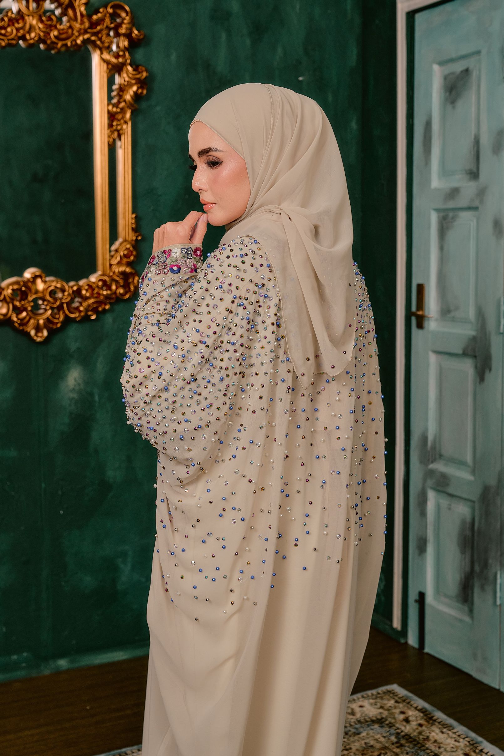 This elegant abaya features a flowing Farasha cut that creates a soft, graceful silhouette with effortless movement. Designed with a smooth nida inner layer and a lightweight chiffon outer, it offers both comfort and a delicate, airy finish. The front panel and cuffs are beautifully detailed with floral embroidery lace, adding a refined and feminine touch. Scattered stones and pearl embellishments shimmer subtly across the chiffon, giving the piece a luxurious sparkle without overpowering its elegance. Perfect for special occasions, this abaya combines timeless sophistication with intricate craftsmanship.