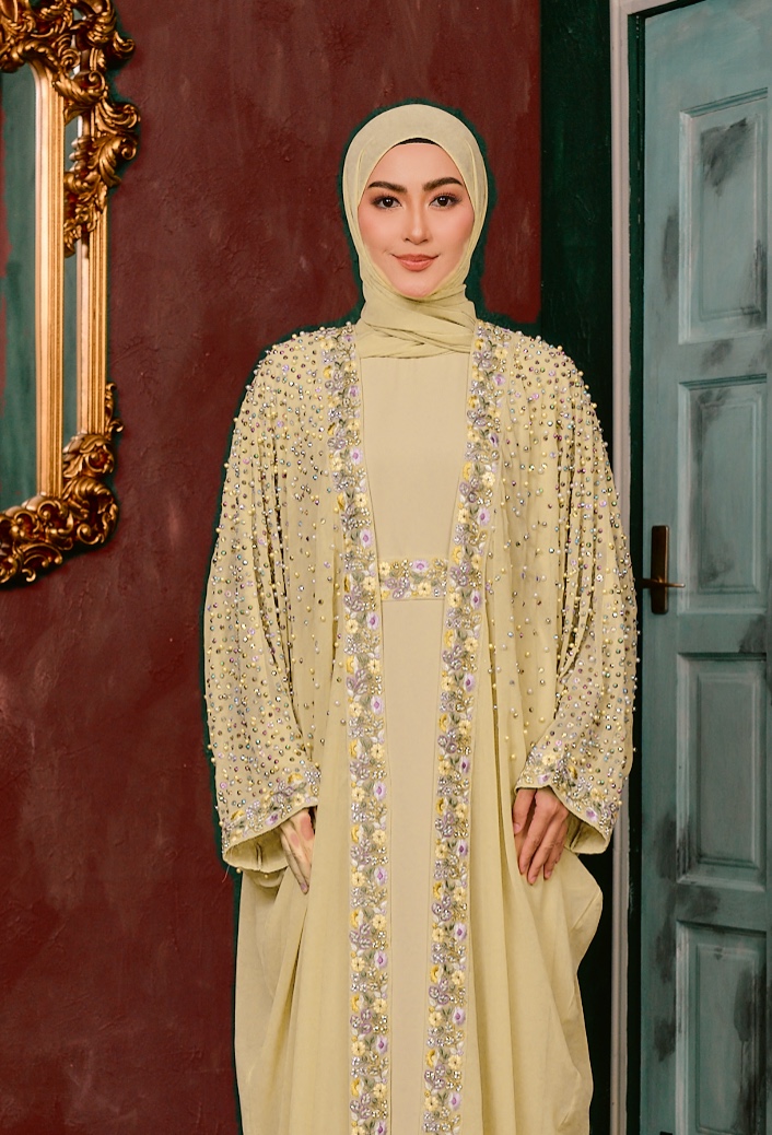This elegant abaya features a flowing Farasha cut that creates a soft, graceful silhouette with effortless movement. Designed with a smooth nida inner layer and a lightweight chiffon outer, it offers both comfort and a delicate, airy finish. The front panel and cuffs are beautifully detailed with floral embroidery lace, adding a refined and feminine touch. Scattered stones and pearl embellishments shimmer subtly across the chiffon, giving the piece a luxurious sparkle without overpowering its elegance. Perfect for special occasions, this abaya combines timeless sophistication with intricate craftsmanship.