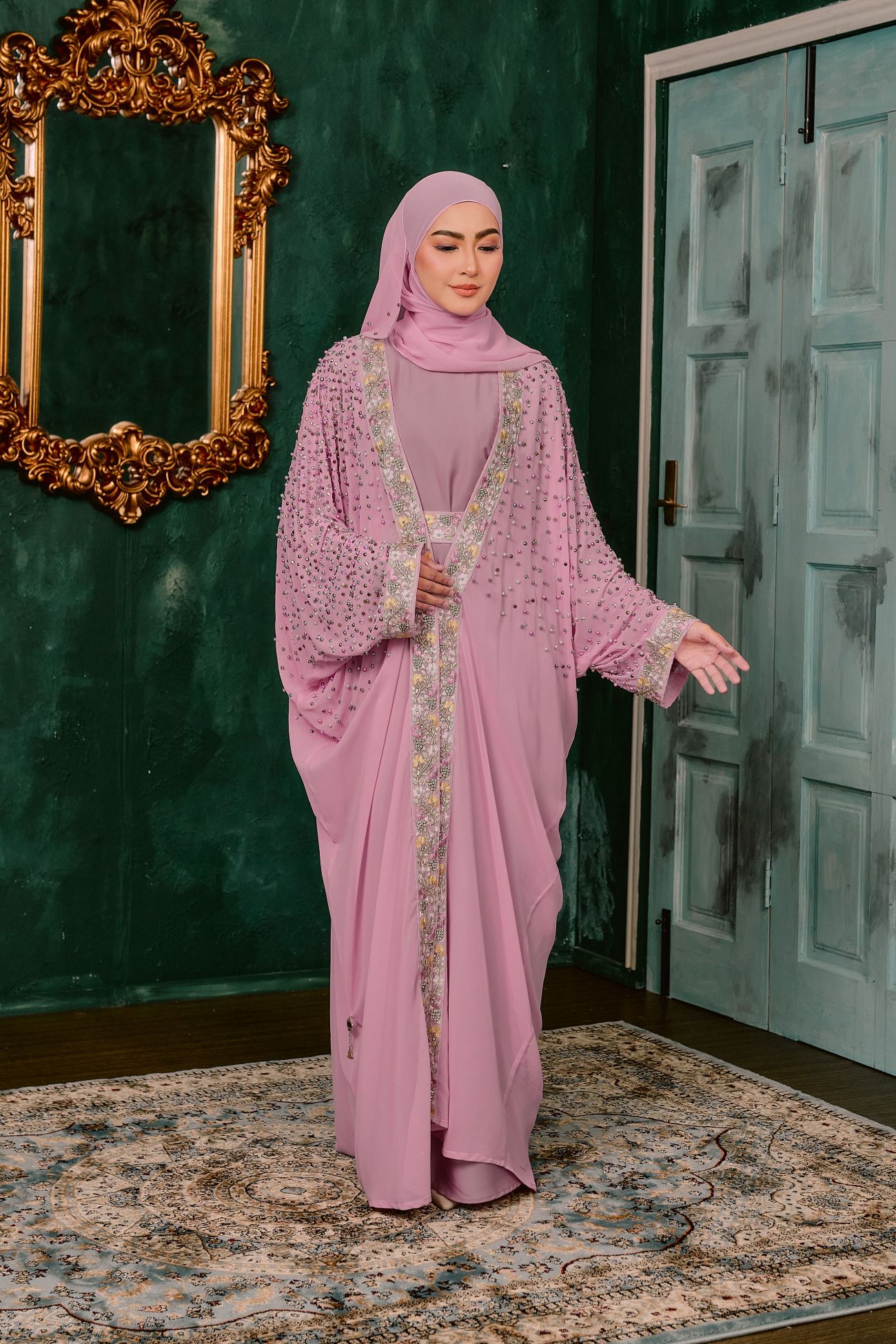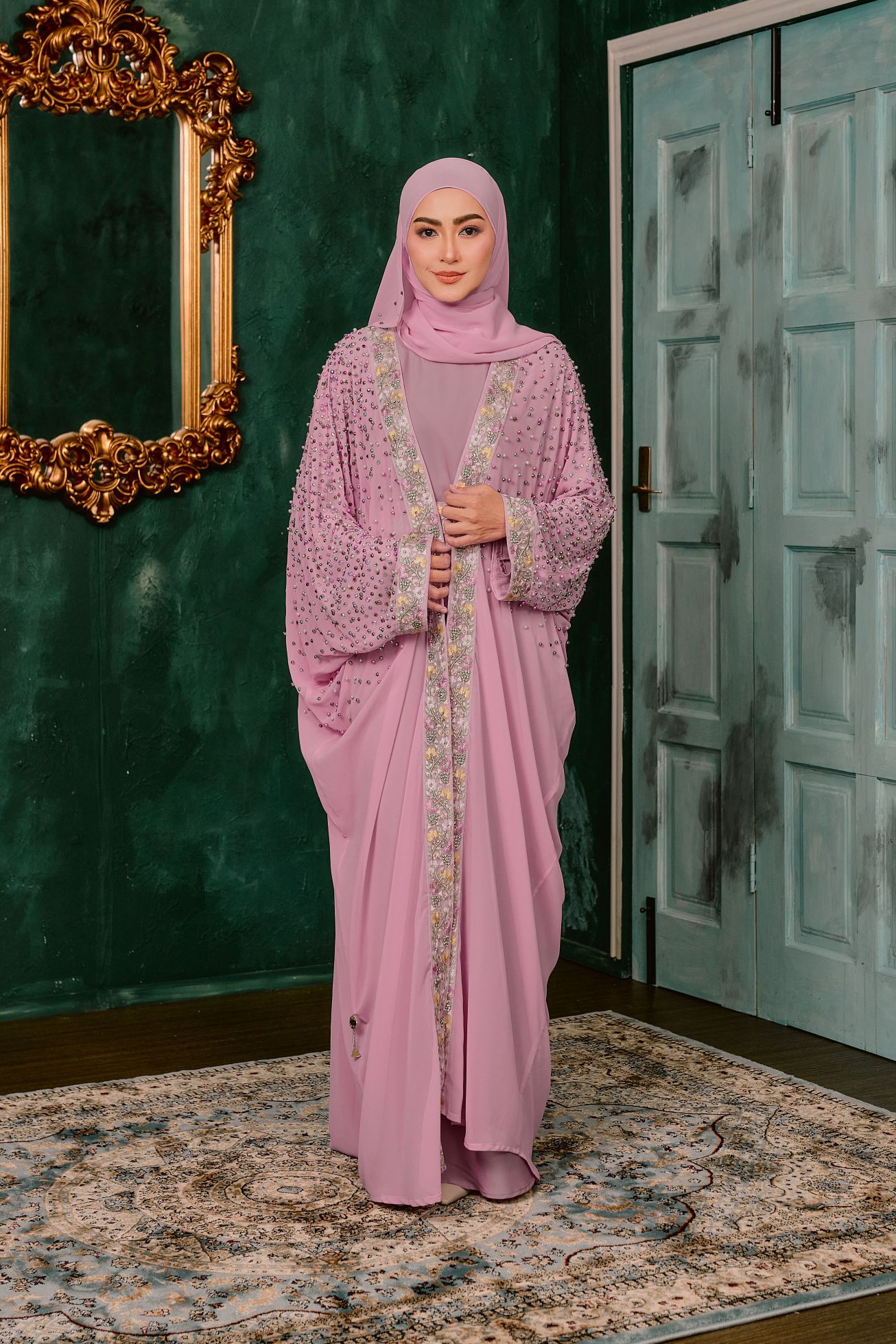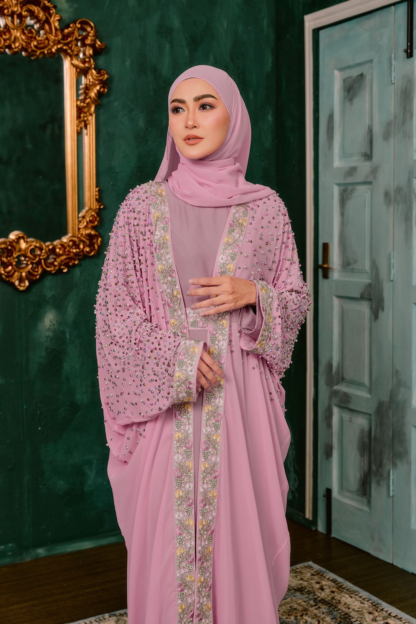 This elegant abaya features a flowing Farasha cut that creates a soft, graceful silhouette with effortless movement. Designed with a smooth nida inner layer and a lightweight chiffon outer, it offers both comfort and a delicate, airy finish. The front panel and cuffs are beautifully detailed with floral embroidery lace, adding a refined and feminine touch. Scattered stones and pearl embellishments shimmer subtly across the chiffon, giving the piece a luxurious sparkle without overpowering its elegance. Perfect for special occasions, this abaya combines timeless sophistication with intricate craftsmanship.