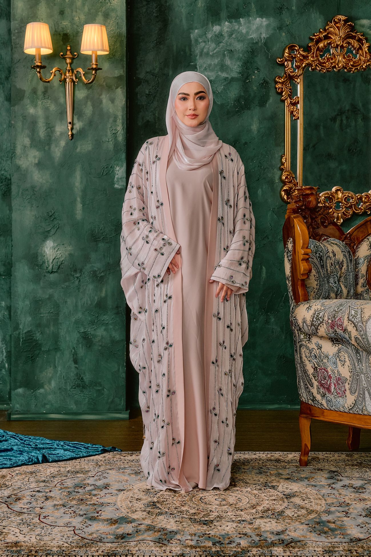 This elegant farasha-cut abaya is crafted from a luxurious blend of nida and rose organza fabrics, creating a graceful silhouette with a soft, flowing drape. The airy organza overlay adds a delicate, ethereal touch, while the nida base ensures comfort and structure. Intricately adorned with shimmering stone embellishments, the design features refined floral and vine-like motifs that cascade subtly across the fabric, catching the light with every movement. The wide, fluid sleeves enhance the timeless farasha style, making this abaya a perfect choice for sophisticated occasions where understated glamour is key.