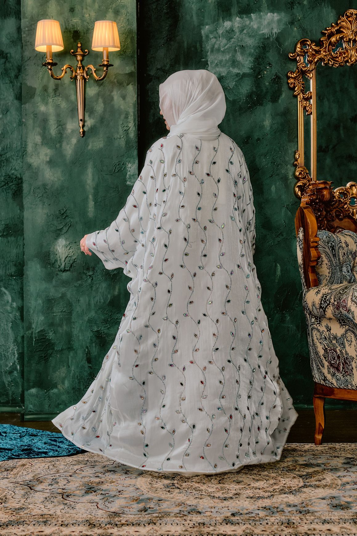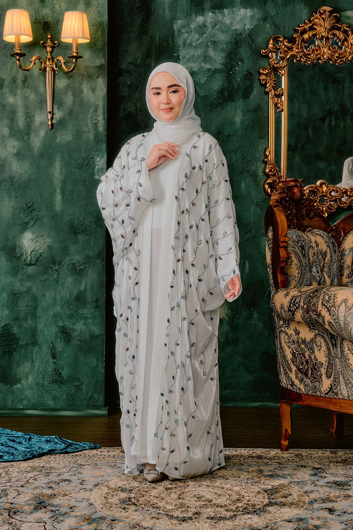 This graceful abaya is designed in a flowing Farasha cut, creating a soft, billowing silhouette that drapes beautifully with every step. Crafted with a smooth nida inner for comfort and a sheer, lightweight outer layer, it exudes an elegant, ethereal charm. The outer layer is adorned with delicate stone embellishments arranged in a scattered vine-like motif, adding a subtle shimmer and refined detail throughout the piece. The wide, airy sleeves enhance its fluid movement, making it perfect for both formal occasions and understated luxury wear.