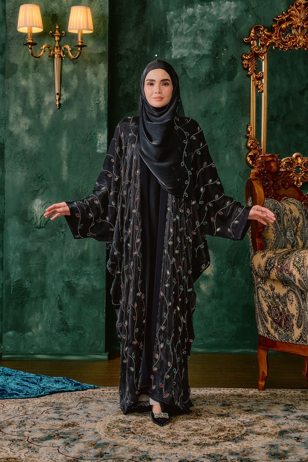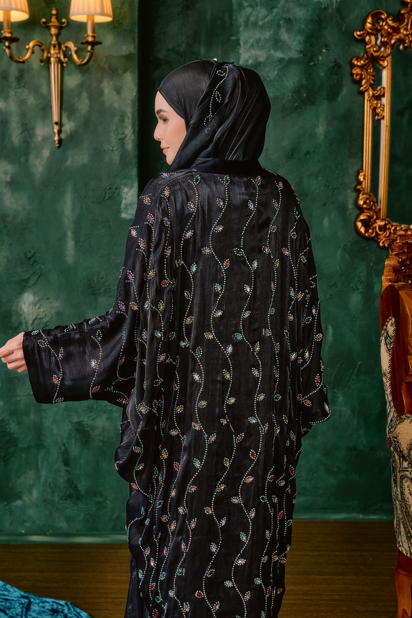 This graceful abaya is designed in a flowing Farasha cut, creating a soft, billowing silhouette that drapes beautifully with every step. Crafted with a smooth nida inner for comfort and a sheer, lightweight outer layer, it exudes an elegant, ethereal charm. The outer layer is adorned with delicate stone embellishments arranged in a scattered vine-like motif, adding a subtle shimmer and refined detail throughout the piece. The wide, airy sleeves enhance its fluid movement, making it perfect for both formal occasions and understated luxury wear.