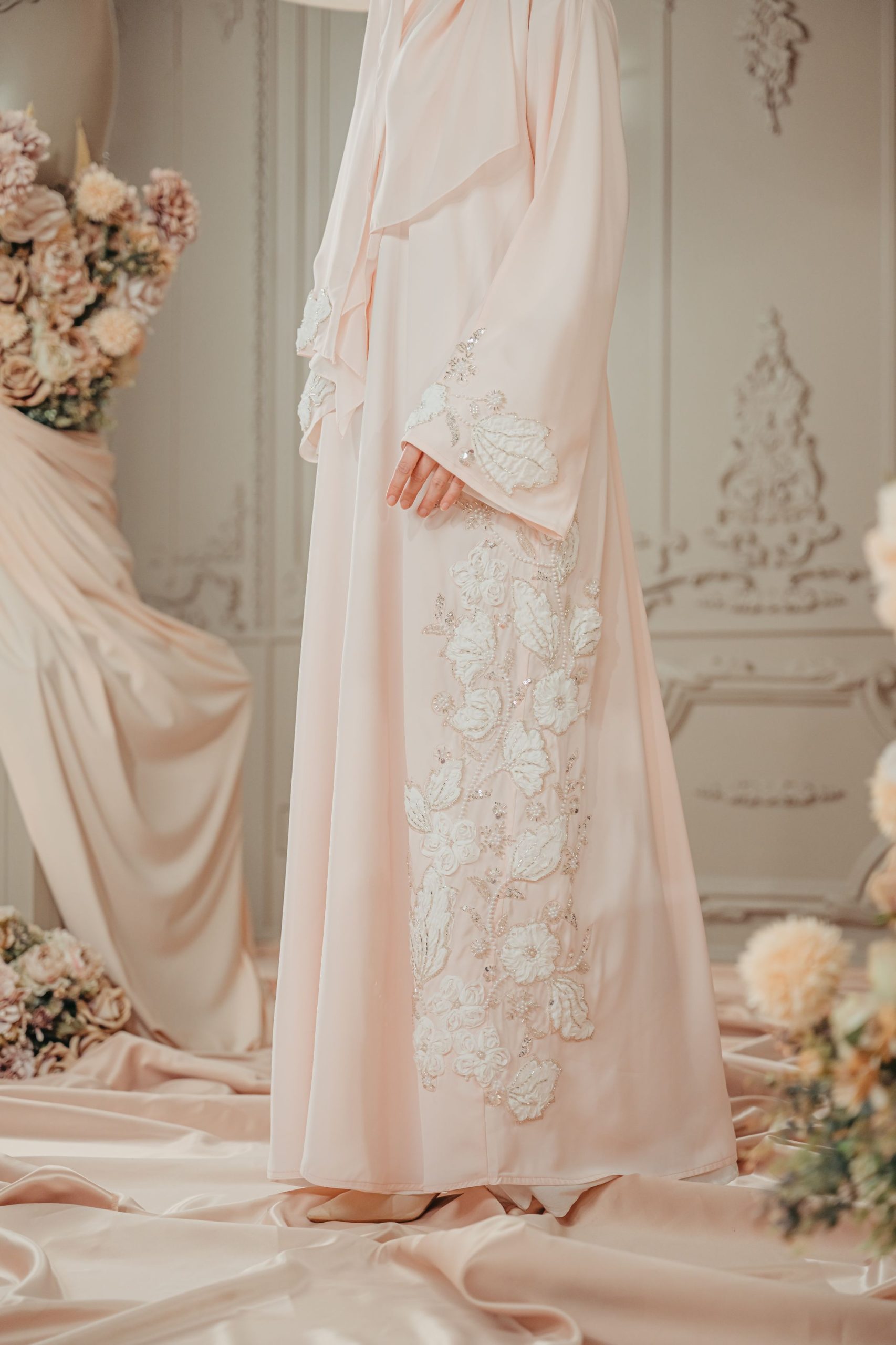 This elegant Opalite abaya is adorned with beautifully detailed appliqué work that cascades gracefully along the side and sleeves, creating a luxurious and refined look. Crafted with a soft nida fabric, it offers both comfort and effortless drape. The intricate floral appliques, enhanced with subtle handmade beads detailing, add depth and sophistication, making this piece perfect for special occasions or elevated daily wear. A timeless abaya that combines modesty, elegance, and delicate craftsmanship in every stitch.