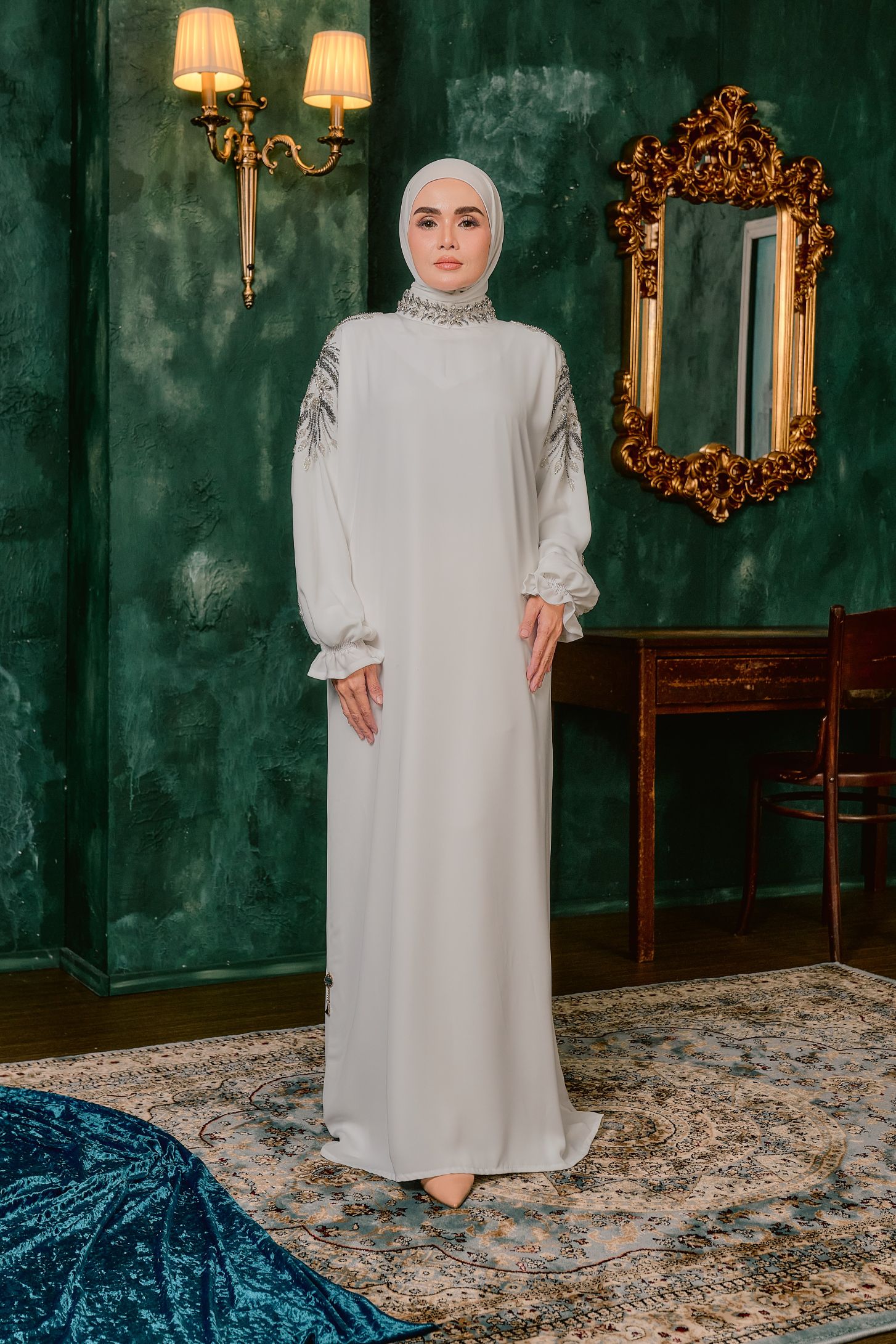 This refined abaya exudes effortless elegance with its clean, graceful silhouette and luxurious detailing. Crafted from a smooth, flowing nida fabric, it features exquisite handmade bead embellishments that delicately trace the shoulders and cascade down the sleeves in intricate, leaf-like patterns, adding a subtle shimmer with every movement. The high neckline is beautifully adorned with fine beaded accents, creating a regal finish, while the flounce sleeves with softly gathered cuffs add volume and a touch of femininity. Paired with a matching headscarf, this abaya is perfect for special occasions, offering a timeless look that blends sophistication with delicate sparkle.