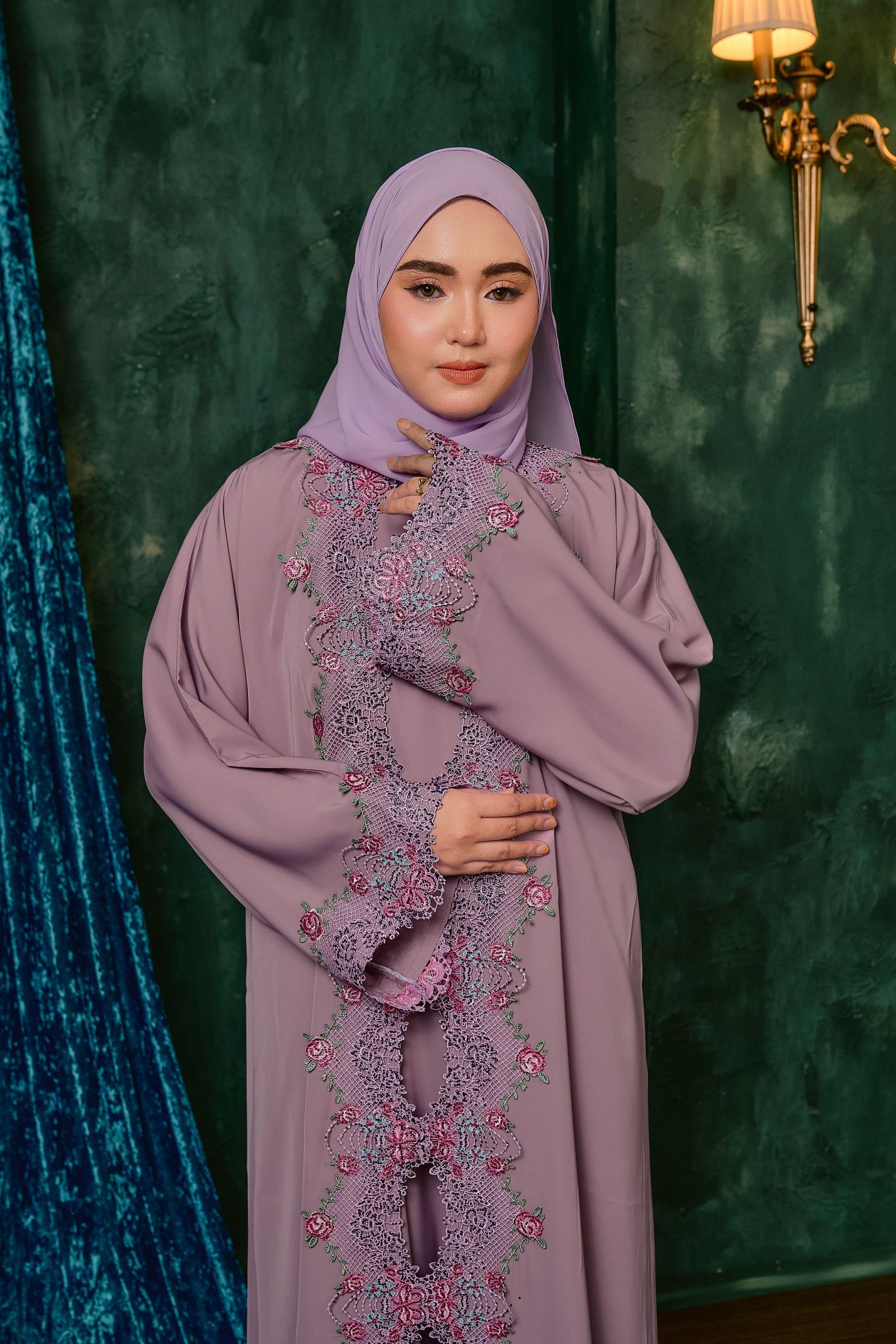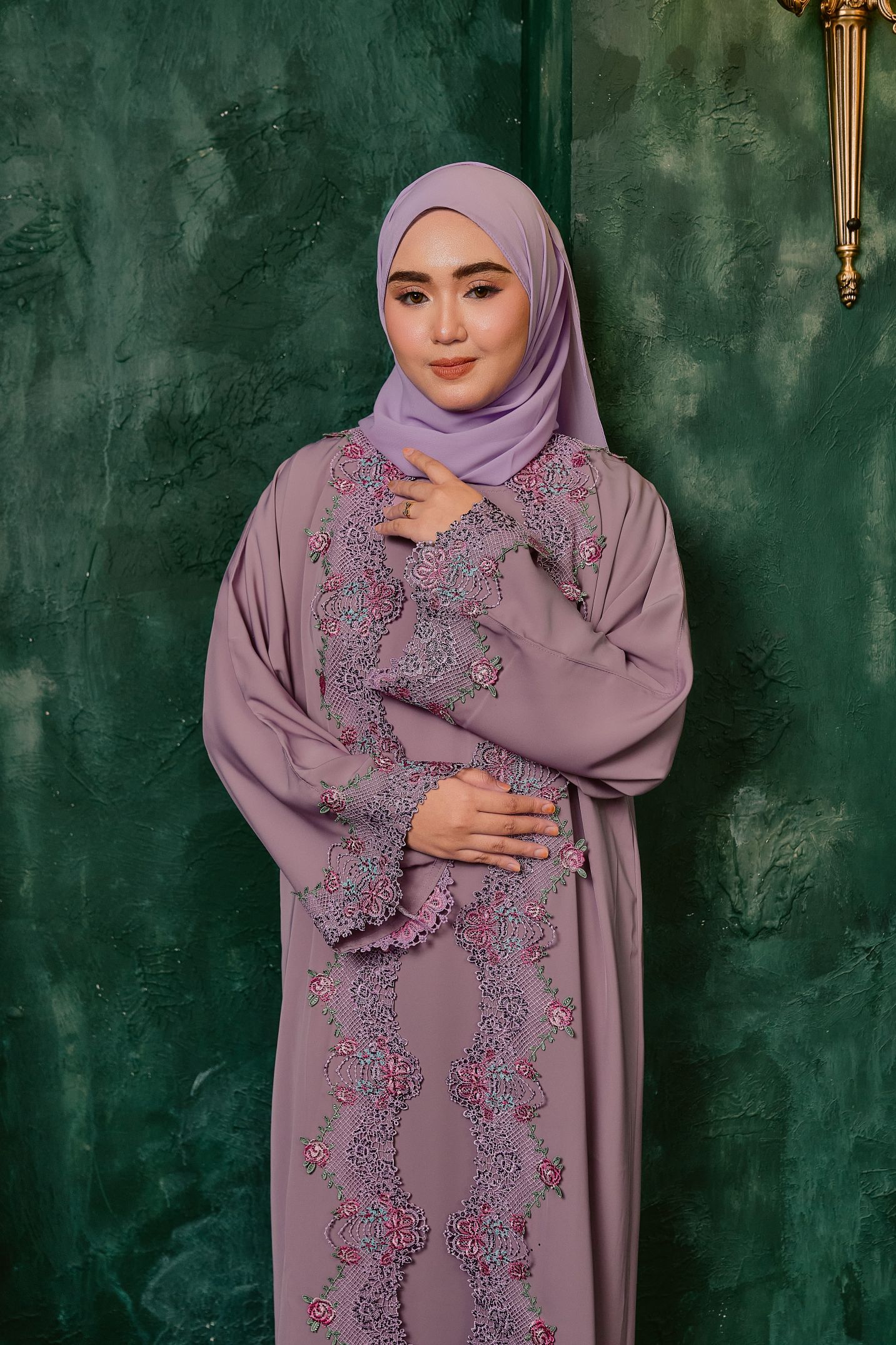 This abaya exudes understated elegance and timeless sophistication. Designed in a graceful, flowing silhouette, it features intricate floral embroidery lace embellishments that cascade along the front panel and sleeves, blending delicate contrasting colors for a refined, dimensional look. The detailed embroidery lace creates a vine-like motif that elongates the figure, while the wide sleeves add a touch of effortless luxury. Perfect for formal gatherings or special occasions, this piece balances modesty with exquisite craftsmanship, making it a standout addition to any wardrobe.