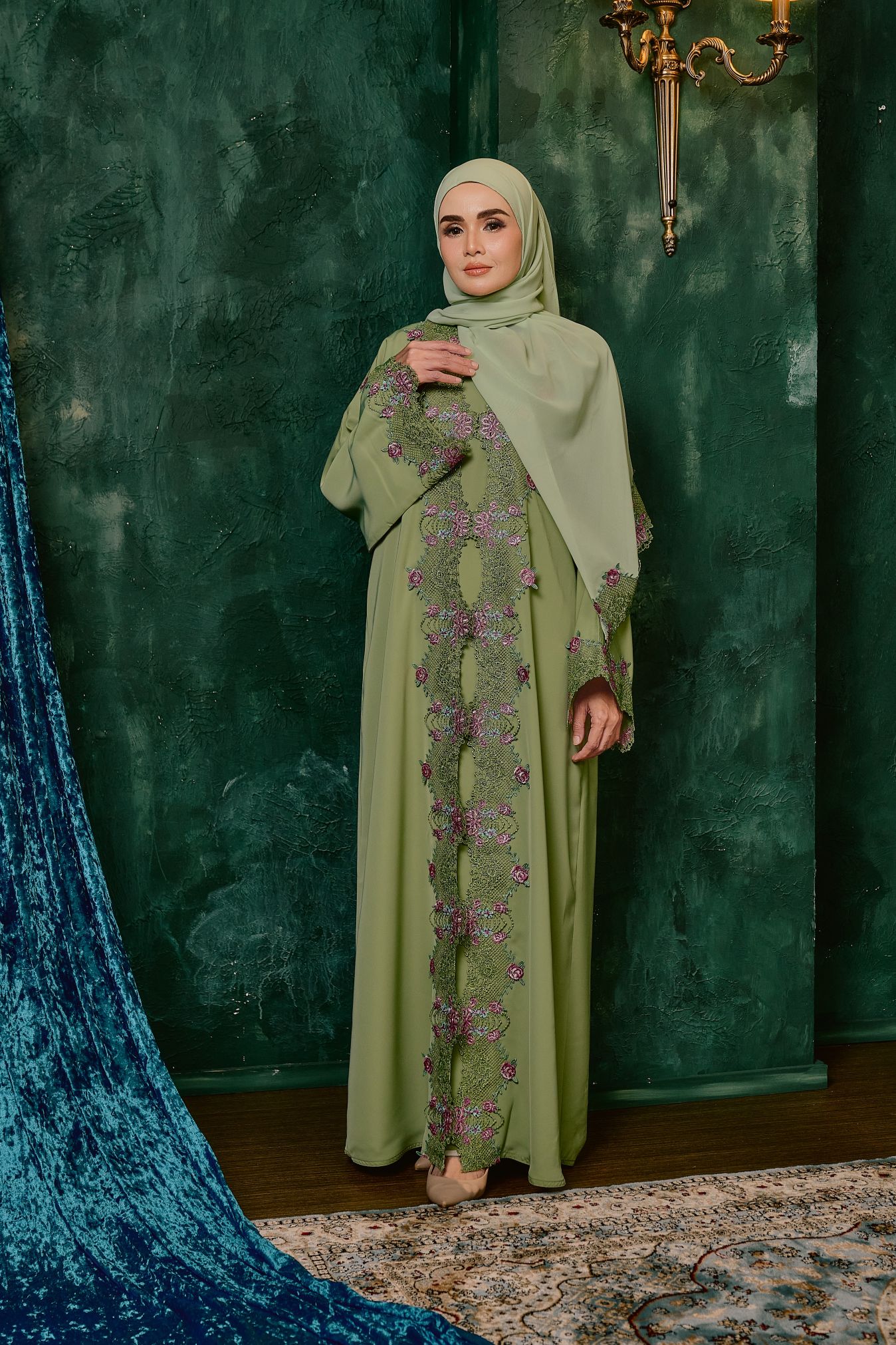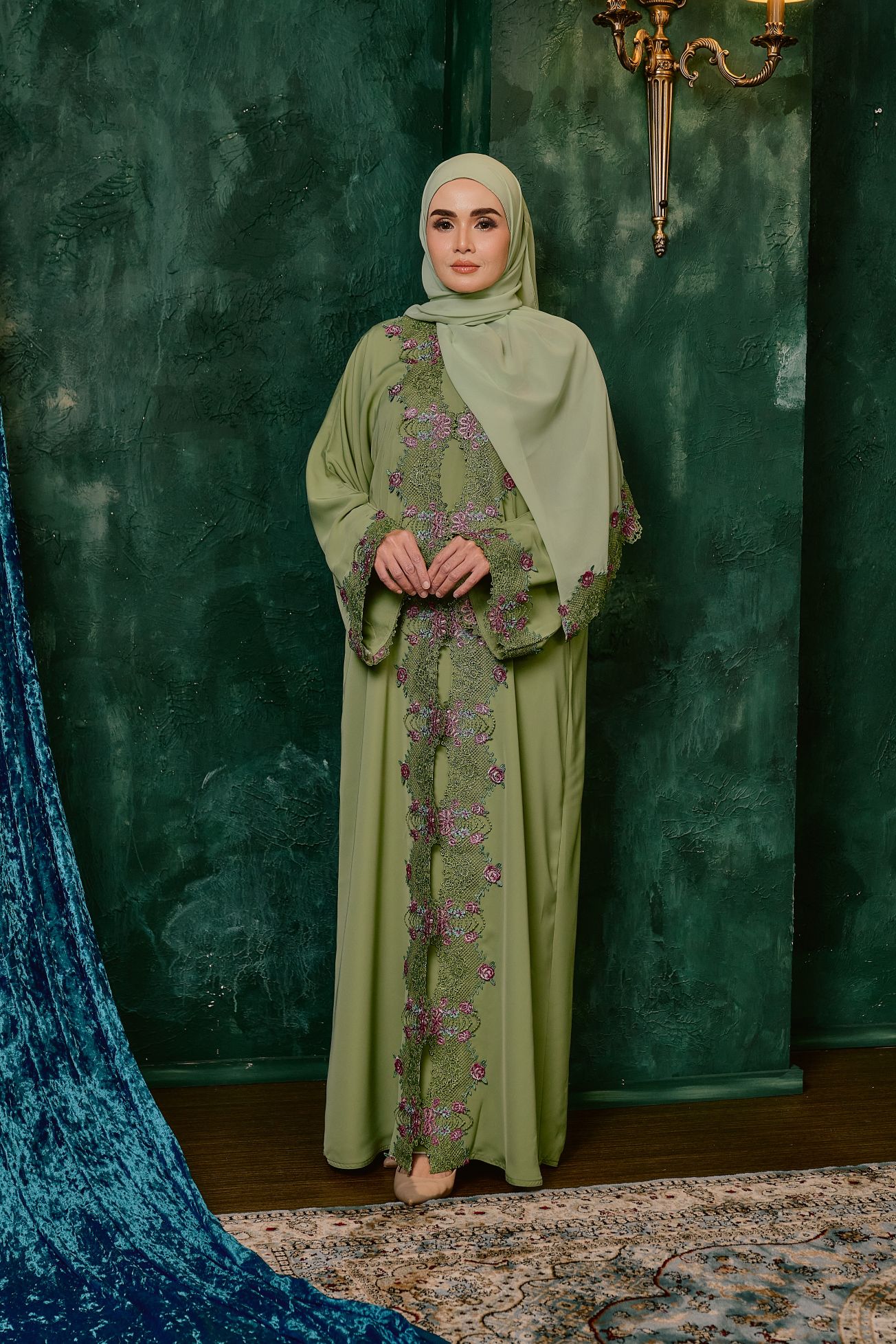 This abaya exudes understated elegance and timeless sophistication. Designed in a graceful, flowing silhouette, it features intricate floral embroidery lace embellishments that cascade along the front panel and sleeves, blending delicate contrasting colors for a refined, dimensional look. The detailed embroidery lace creates a vine-like motif that elongates the figure, while the wide sleeves add a touch of effortless luxury. Perfect for formal gatherings or special occasions, this piece balances modesty with exquisite craftsmanship, making it a standout addition to any wardrobe.