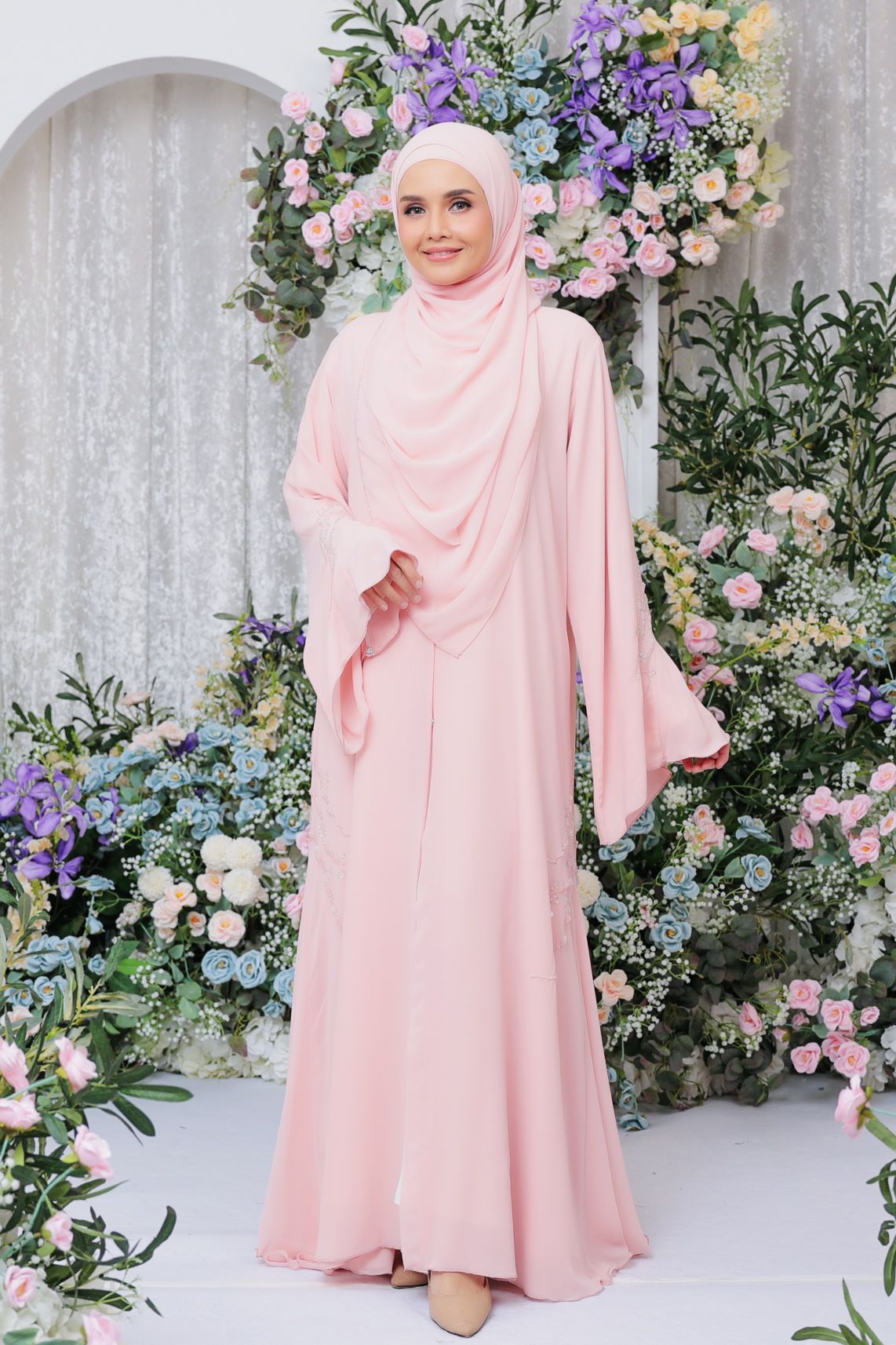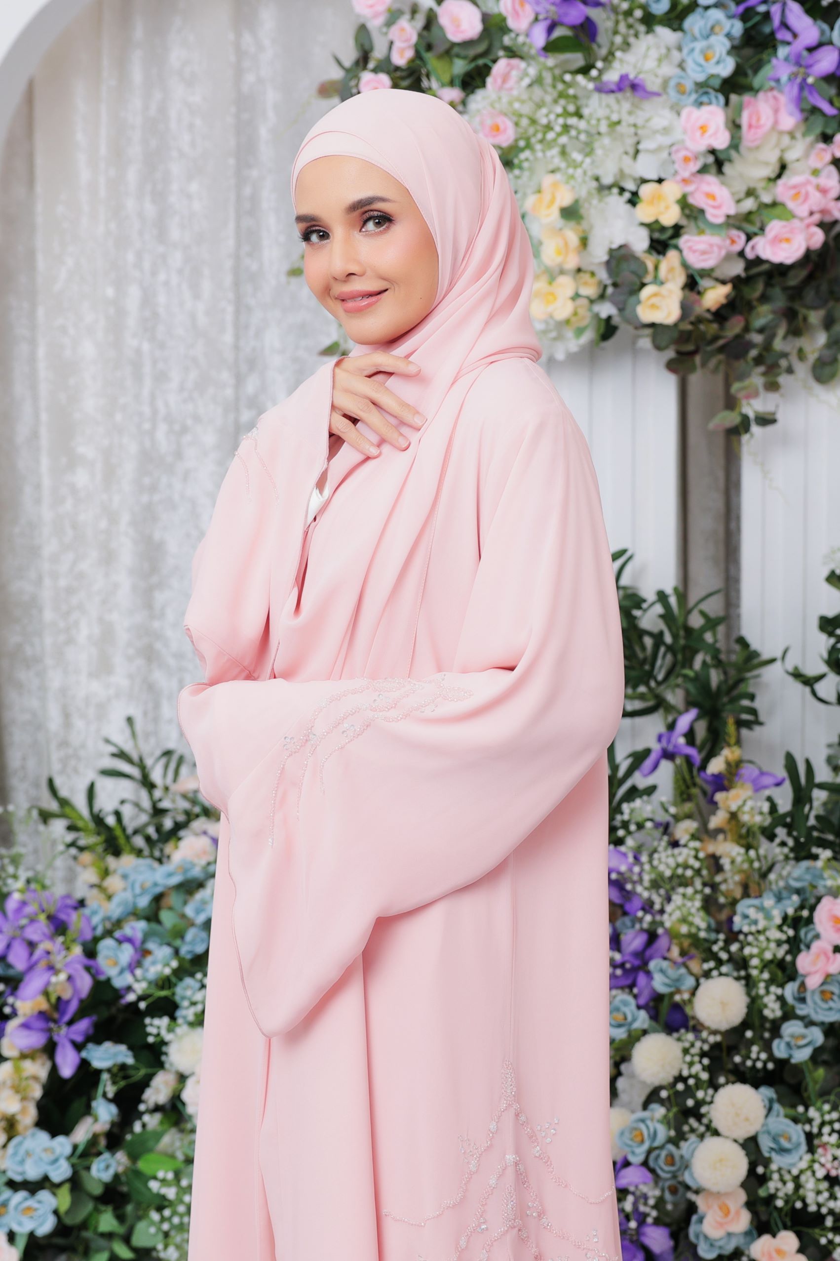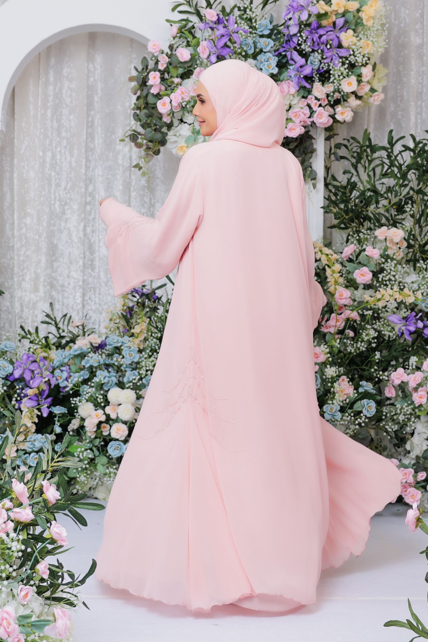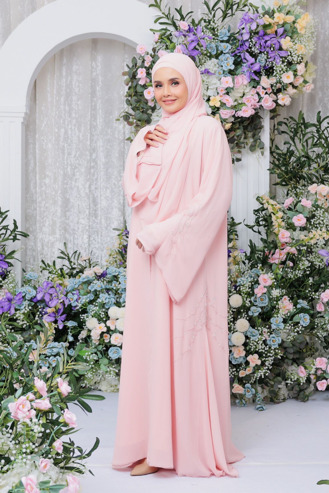 Ivy Abaya – embellished with intricate and sweet handmade beadings details, this abaya is surely a stunner! Made of double chiffon fabric, it is soft, flowy and comfortable to wear. Perfect for eid, special occasions and any festivity celebrations!