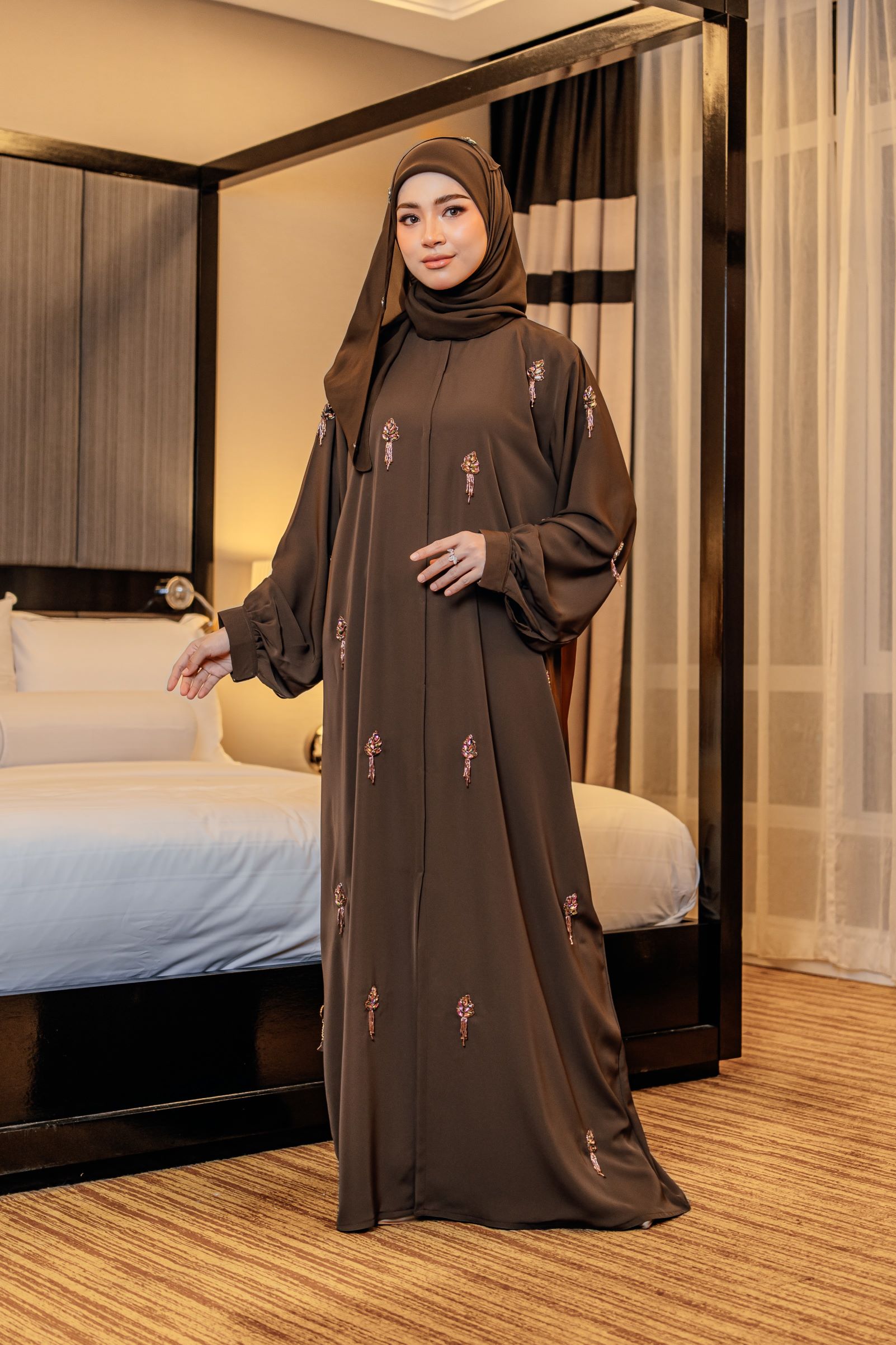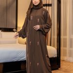 Kaia Abaya – this abaya features delicate shimmery beadworks in a subtle, repetitive pattern across the front and sleeves, adding a touch of elegance and femininity. Made from soft Nida fabric, this abaya drapes gracefully, offering both comfort and sophistication. This abaya also features bishop sleeves where it is voluminous along the arm and gather neatly at the wrist with a cuff, creating a billowy, elegant silhouette. This ensemble is perfect for formal occasions, special events or elegant everyday wear.