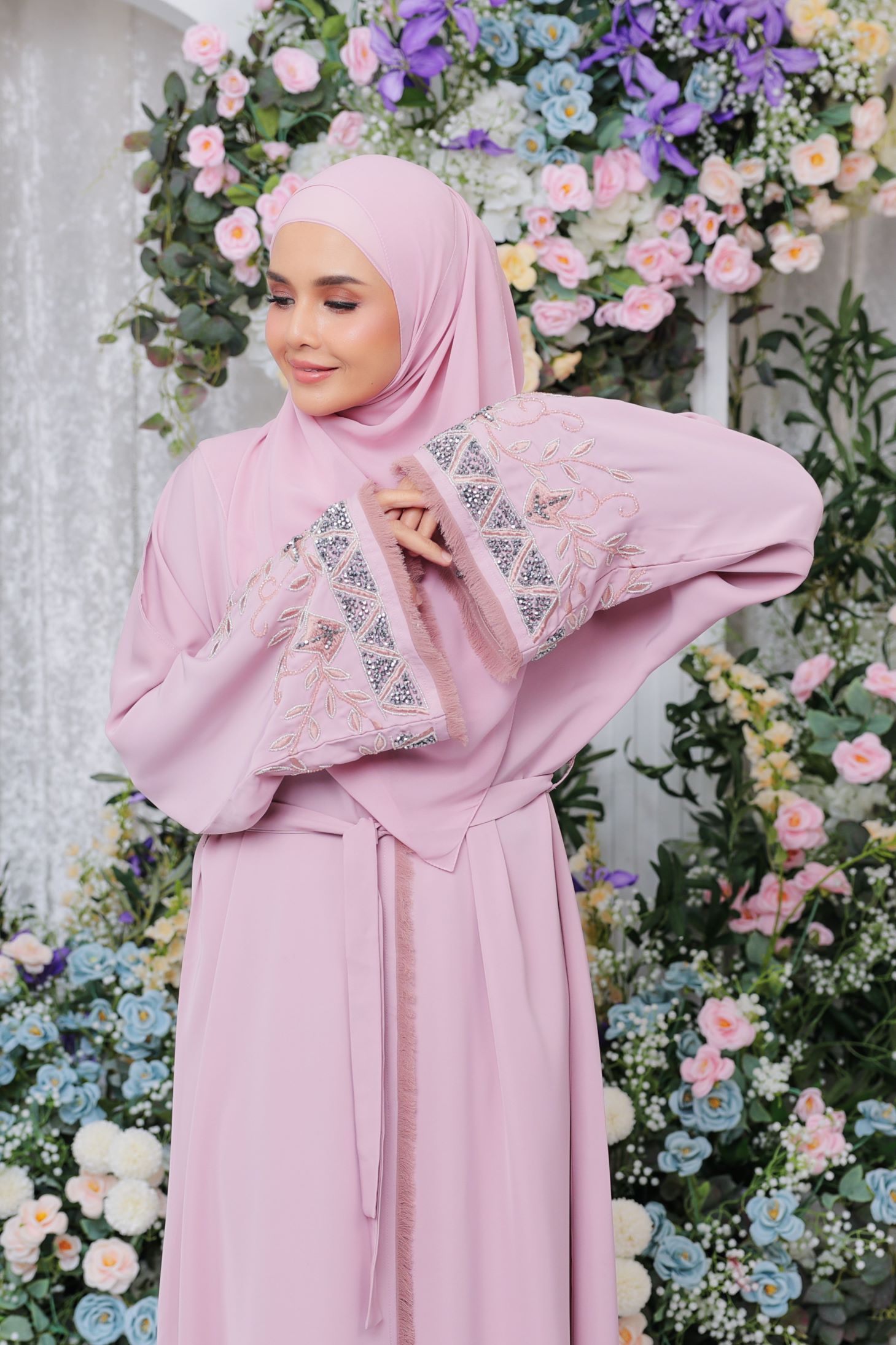 Enchant in this exquisite embroidery and beads abaya – Kiora Abaya. A must-have abaya for those who love neat and intricate embroidery with sparkly detailed beads. Soft little fluffs are also added at the hems of the sleeves and front opening. This abaya is made of high quality nida fabric which is soft and comfortable to wear anytime and anywhere, for any occasions and festivities!