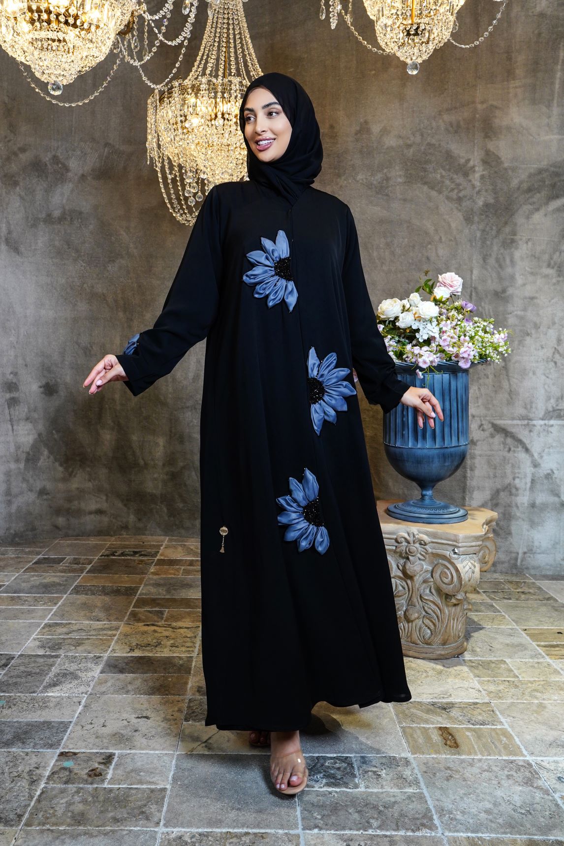 Matahari Abaya – enchant in this striking black abaya with combination of bold elegance. This abaya features large, eye-catching floral appliques with black centers made of sparkly handmade beads, thoughtfully placed on the front, sleeves, and lower half for a balanced and artistic design.  Crafted from a soft, flowing Nida fabric, this abaya offers a comfortable yet refined silhouette that drapes beautifully. Paired with a matching black hijab, this piece is perfect for both everyday sophistication and special occasions.