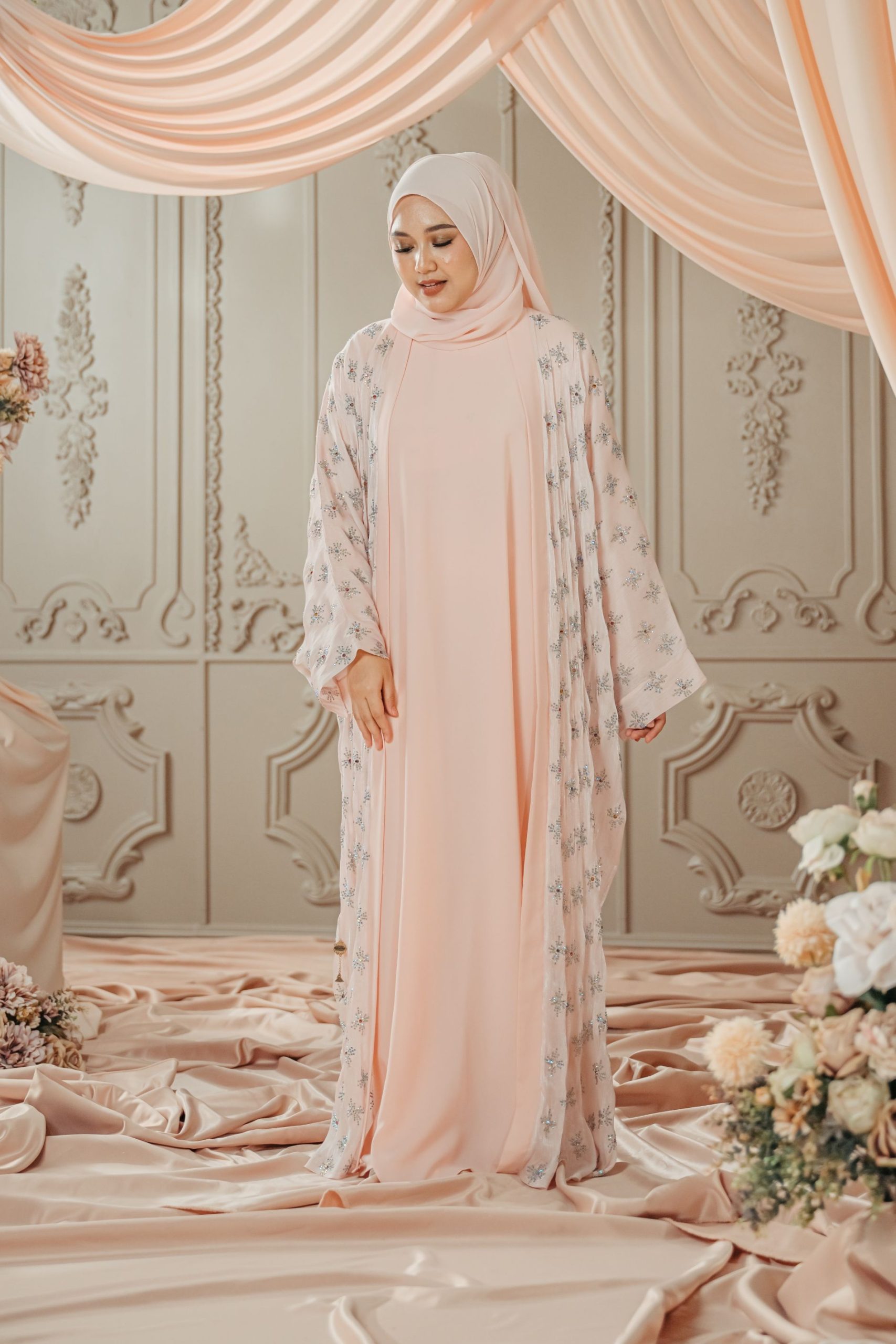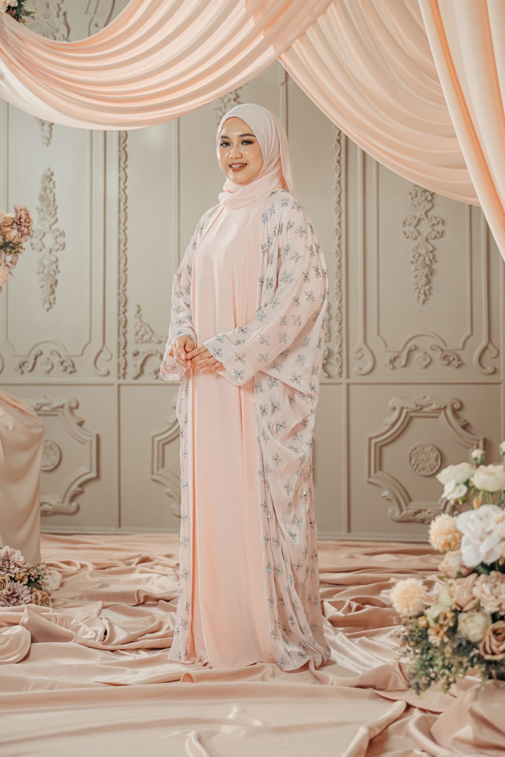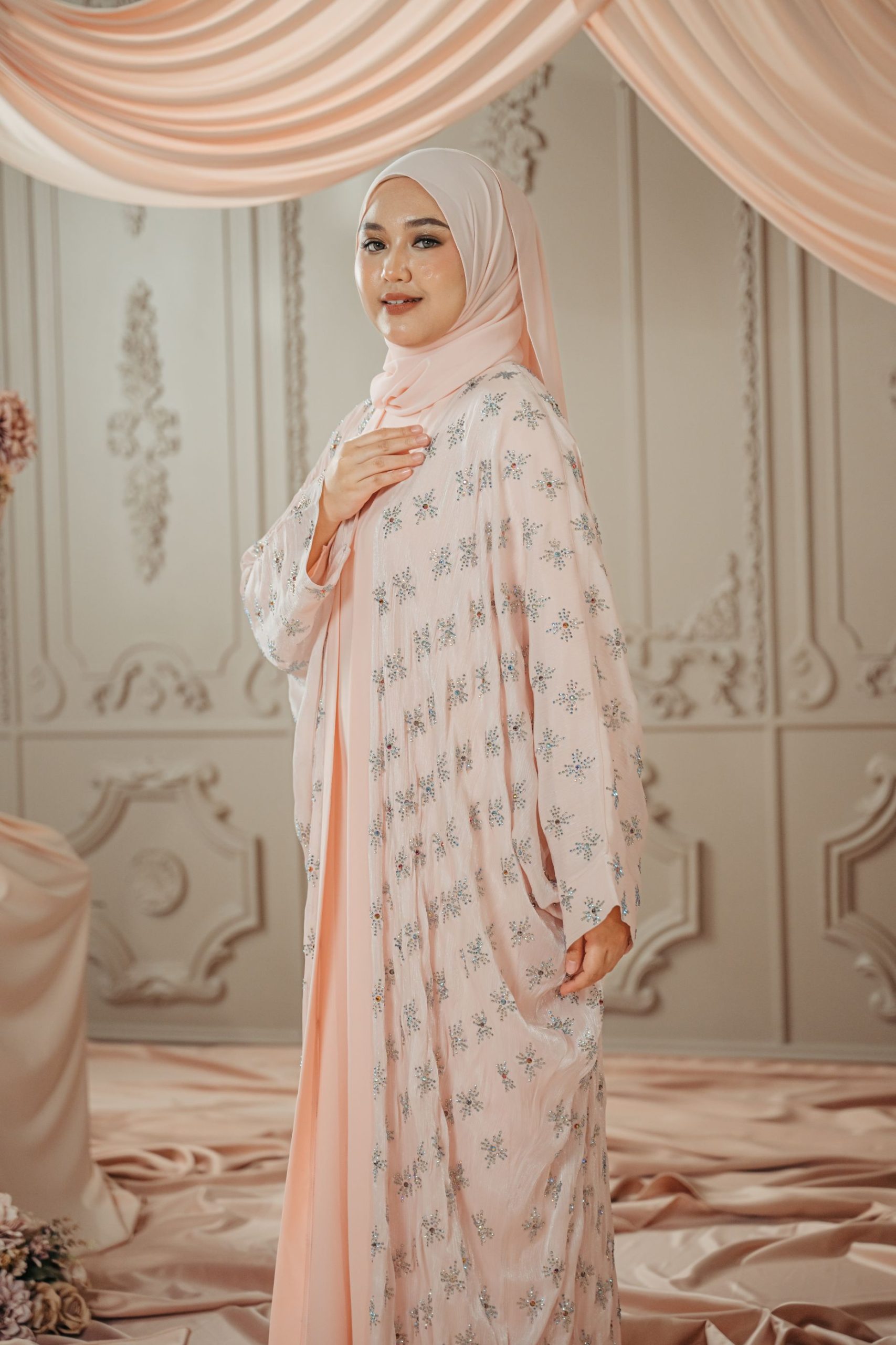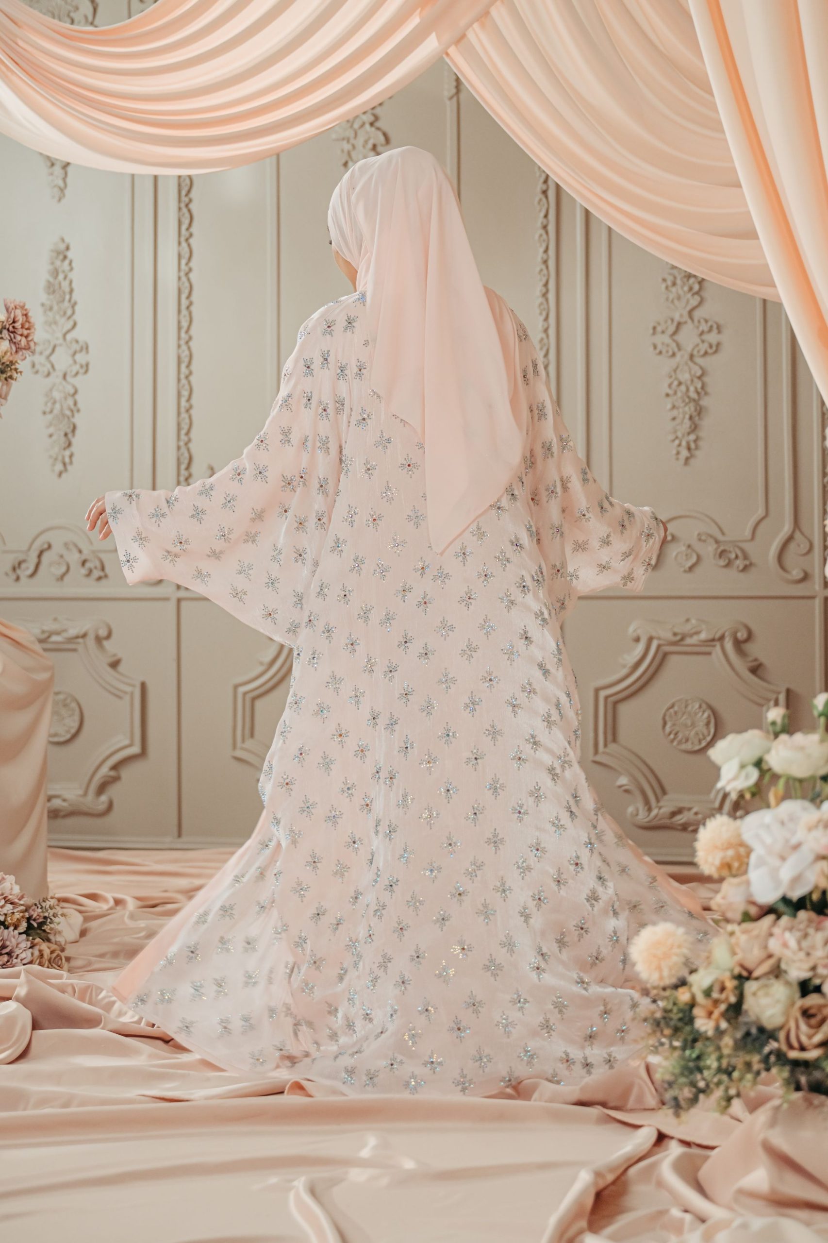 Snow Abaya – this abaya is a graceful and refined piece that blends classic elegance with intricate rhinestones detailing. Designed in soft Nida fabric for the inner and lightweight Rose Organza fabric for the outer, this abaya features a loose, flowing Farasha silhouette that drapes beautifully to the floor, exuding both modesty and sophistication. This overlay is adorned with shimmery rhinestones in a snowflakes pattern, adding a touch of shimmer and opulence to the overall look. Definitely ideal for formal occasions or festive celebrations, offering a look that is both traditional and contemporary, with an emphasis on understated beauty and detailed craftsmanship.