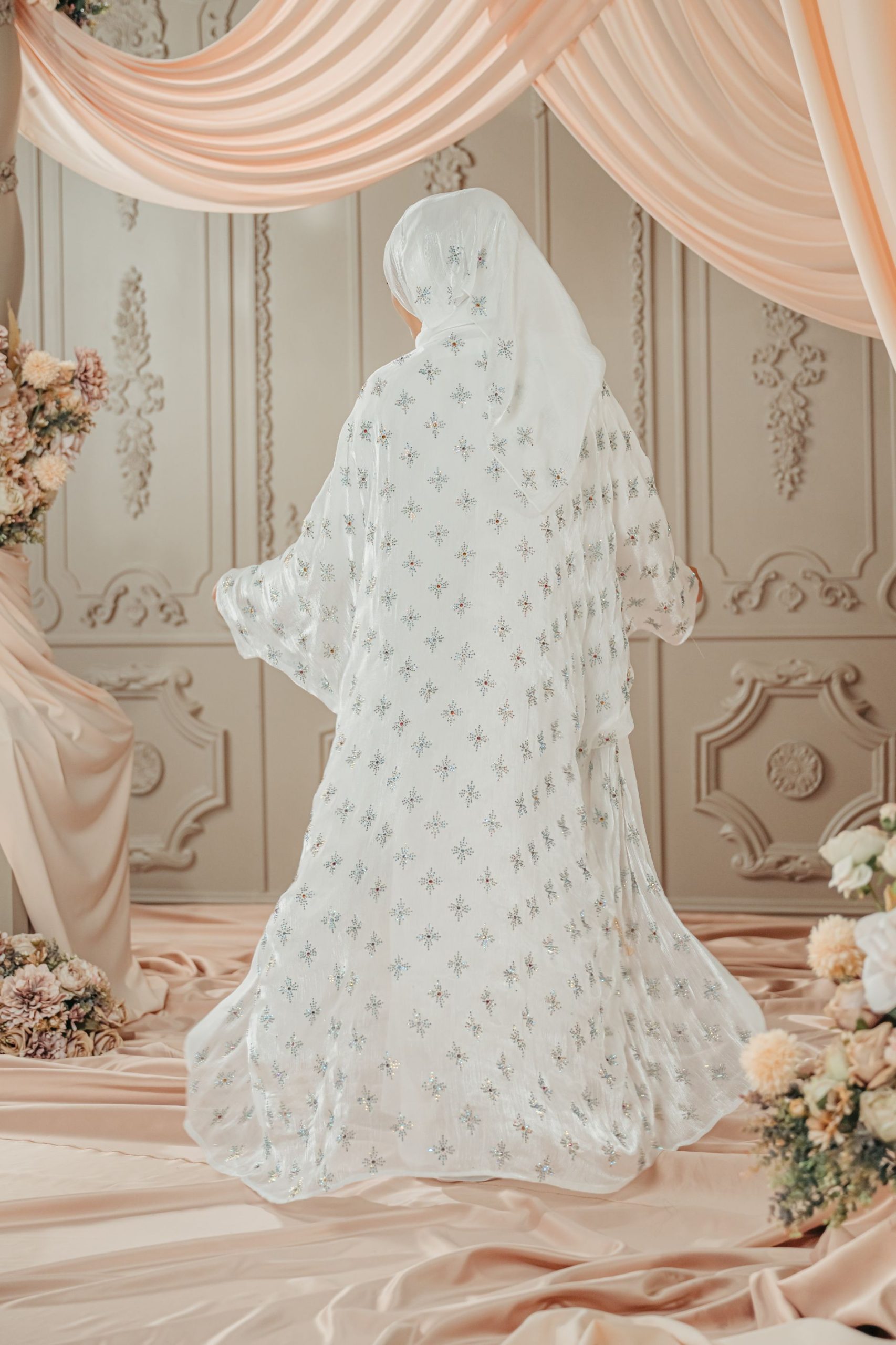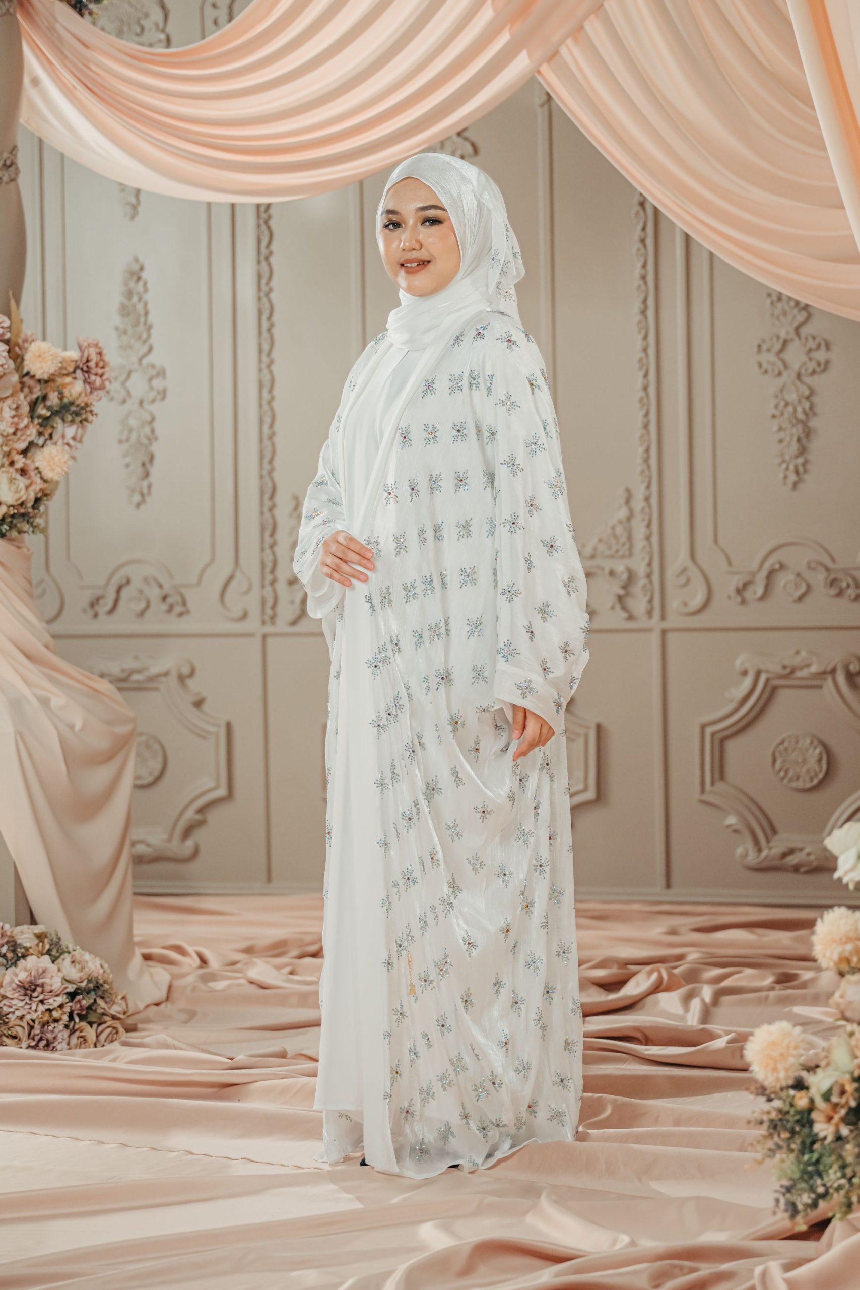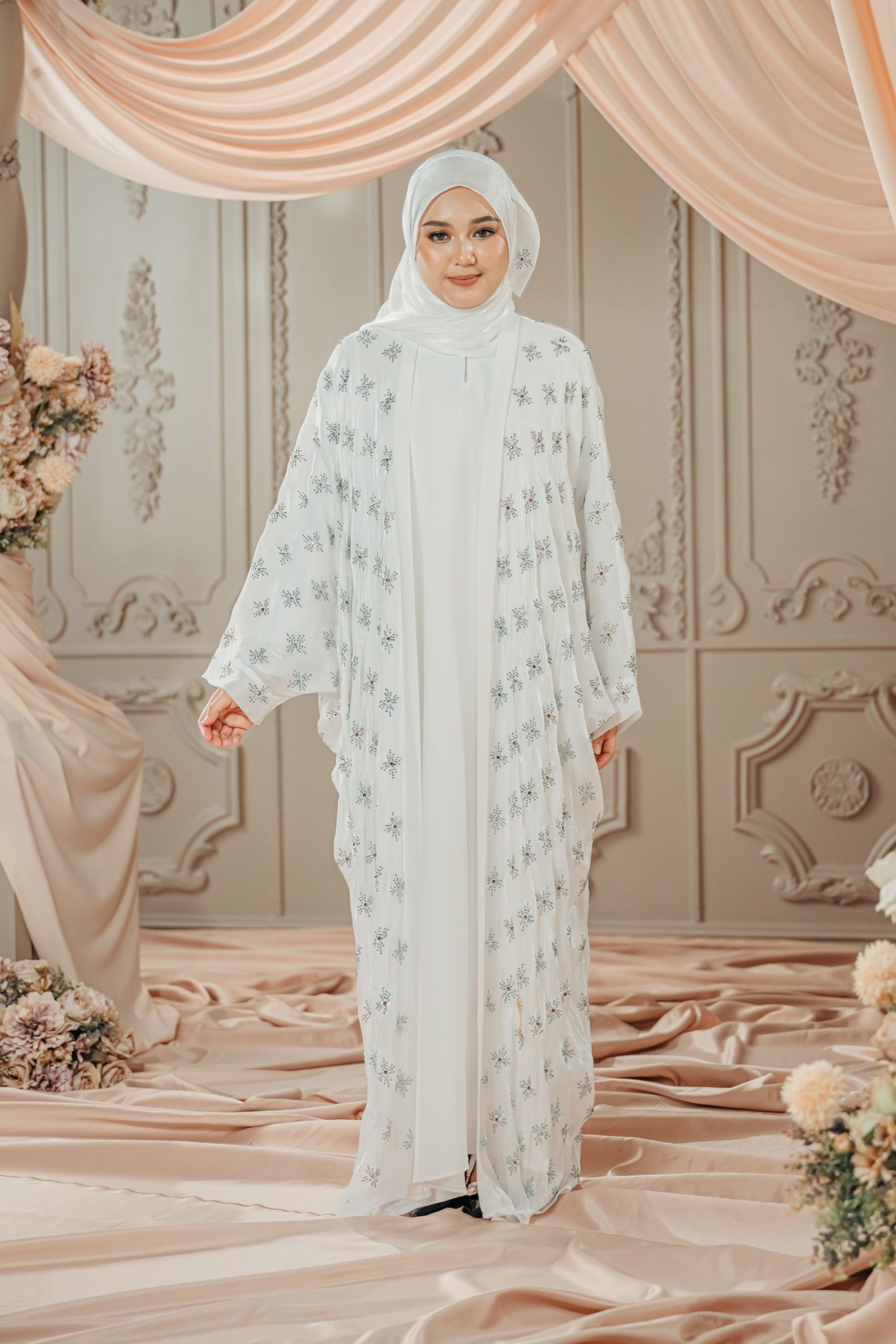 Snow Abaya – this abaya is a graceful and refined piece that blends classic elegance with intricate rhinestones detailing. Designed in soft Nida fabric for the inner and lightweight Rose Organza fabric for the outer, this abaya features a loose, flowing Farasha silhouette that drapes beautifully to the floor, exuding both modesty and sophistication. This overlay is adorned with shimmery rhinestones in a snowflakes pattern, adding a touch of shimmer and opulence to the overall look. Definitely ideal for formal occasions or festive celebrations, offering a look that is both traditional and contemporary, with an emphasis on understated beauty and detailed craftsmanship.