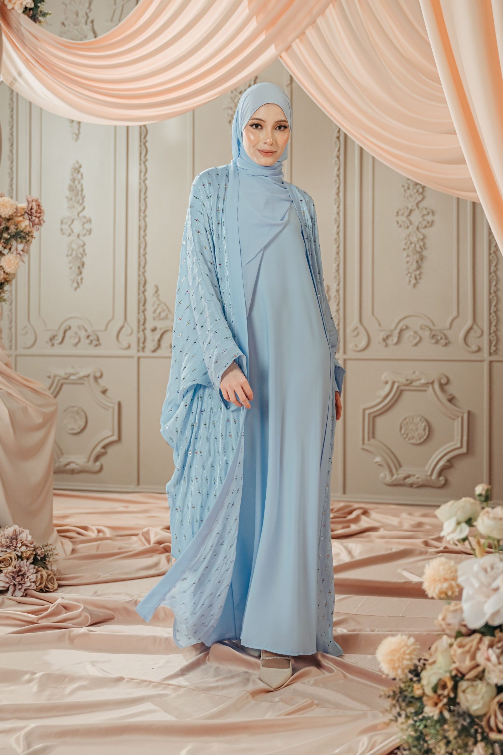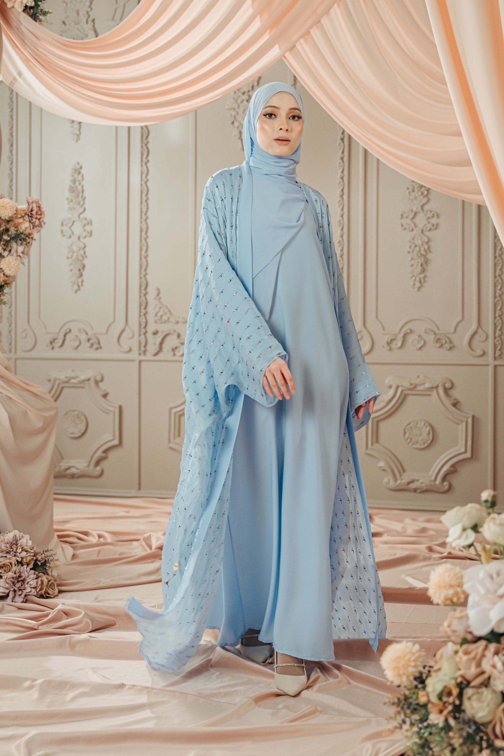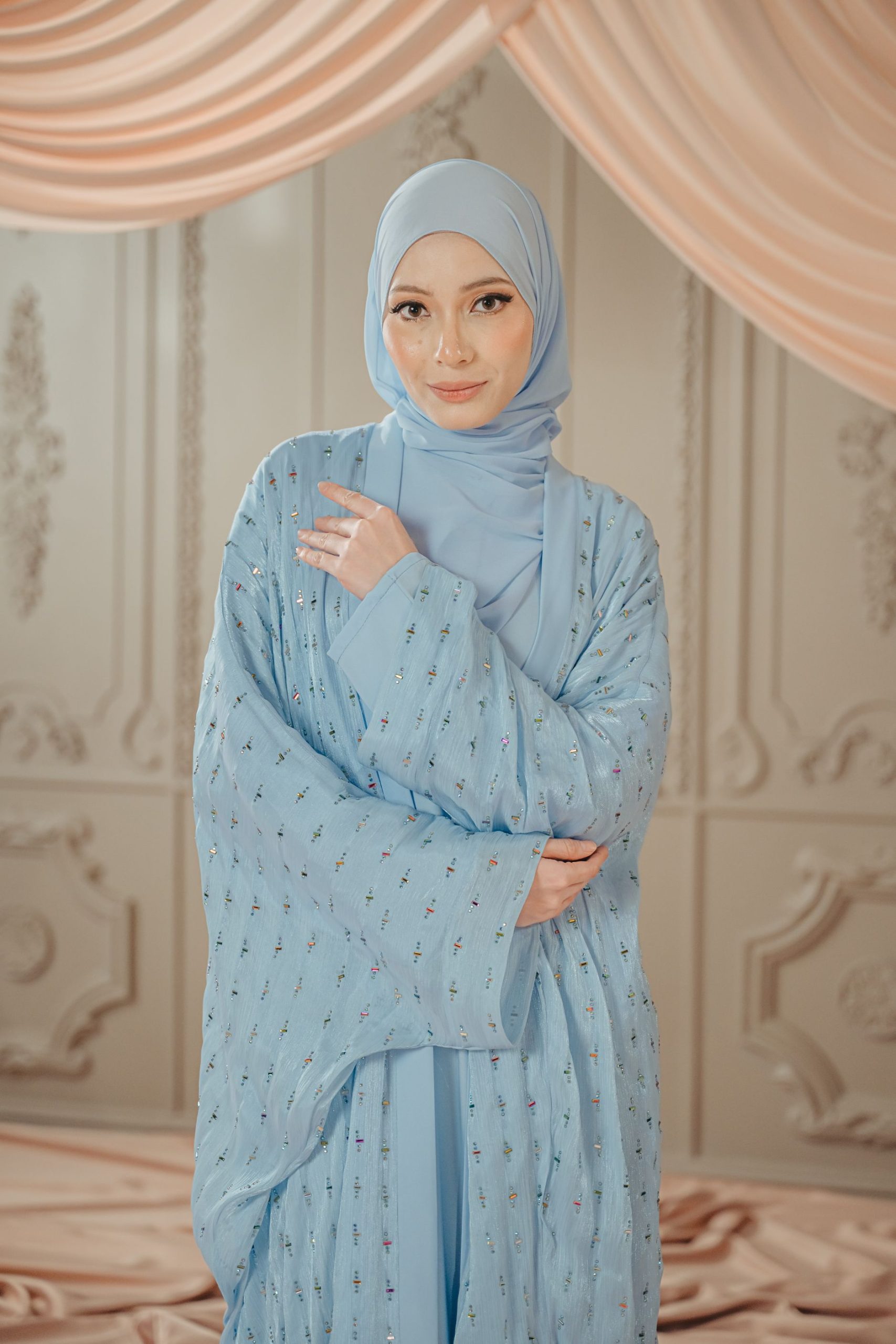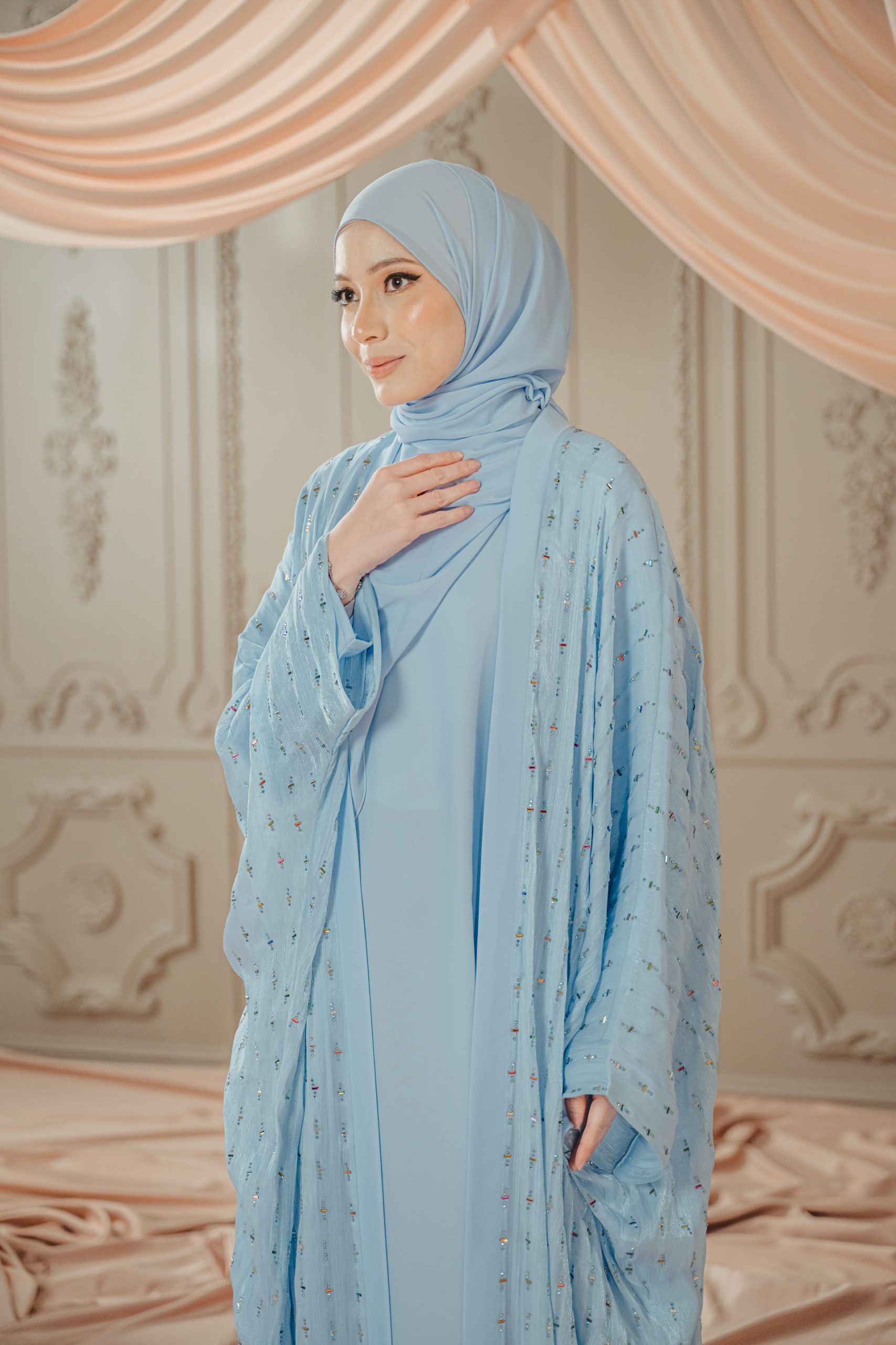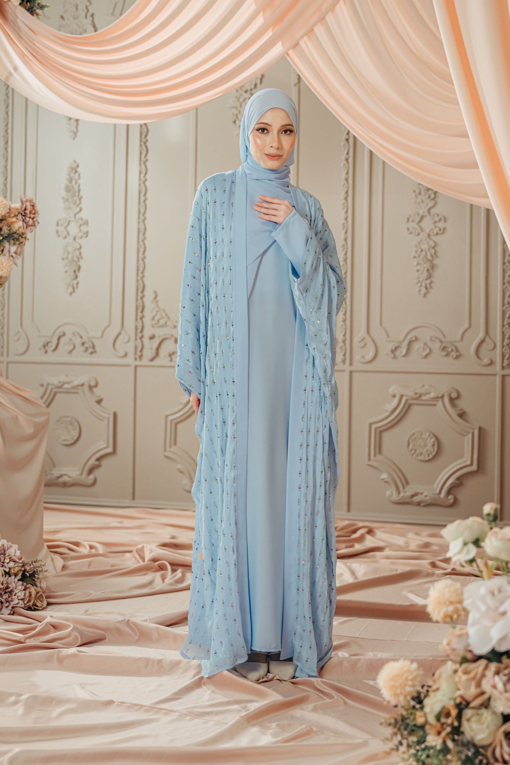 Starlet Abaya – abaya that enchants with its shimmers and glitters! This is a 2-piece set abaya with a combination of two different fabrics – nida for the inner & rose organza for the outer. It is a farasha cut abaya adorned with lavish sprinkles of shiny stones. Soft and comfortable to wear for any occasions and festivities!