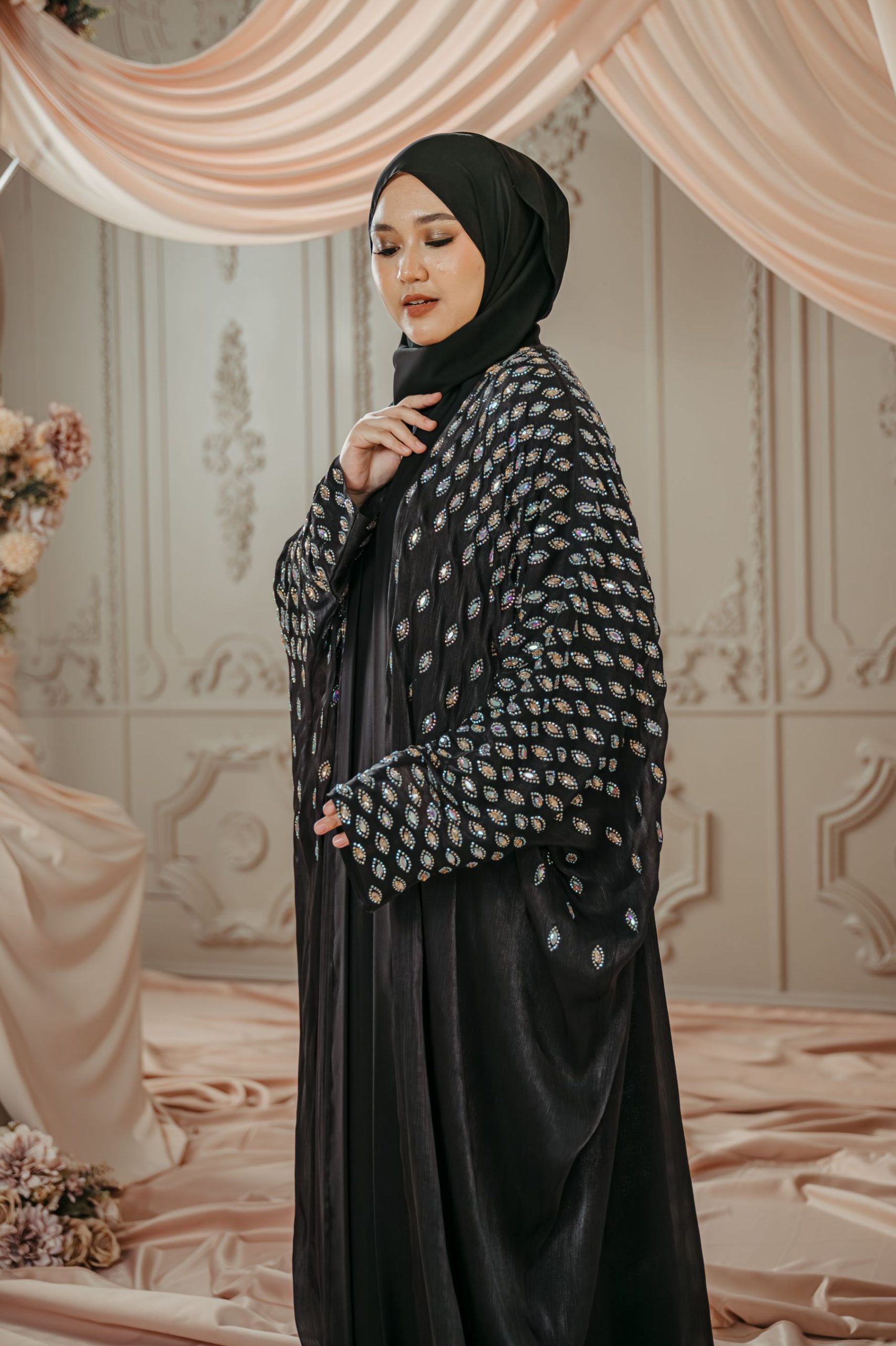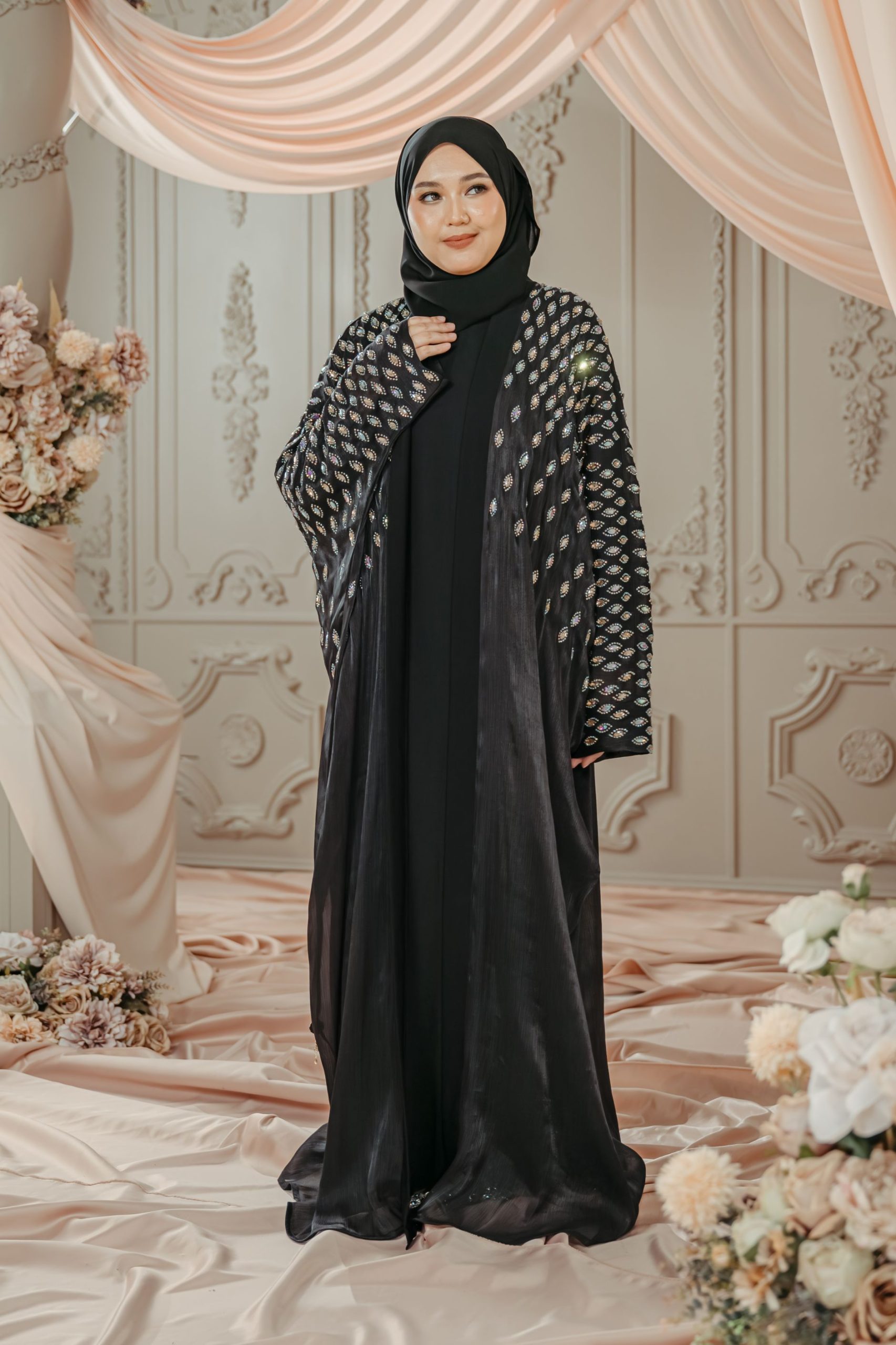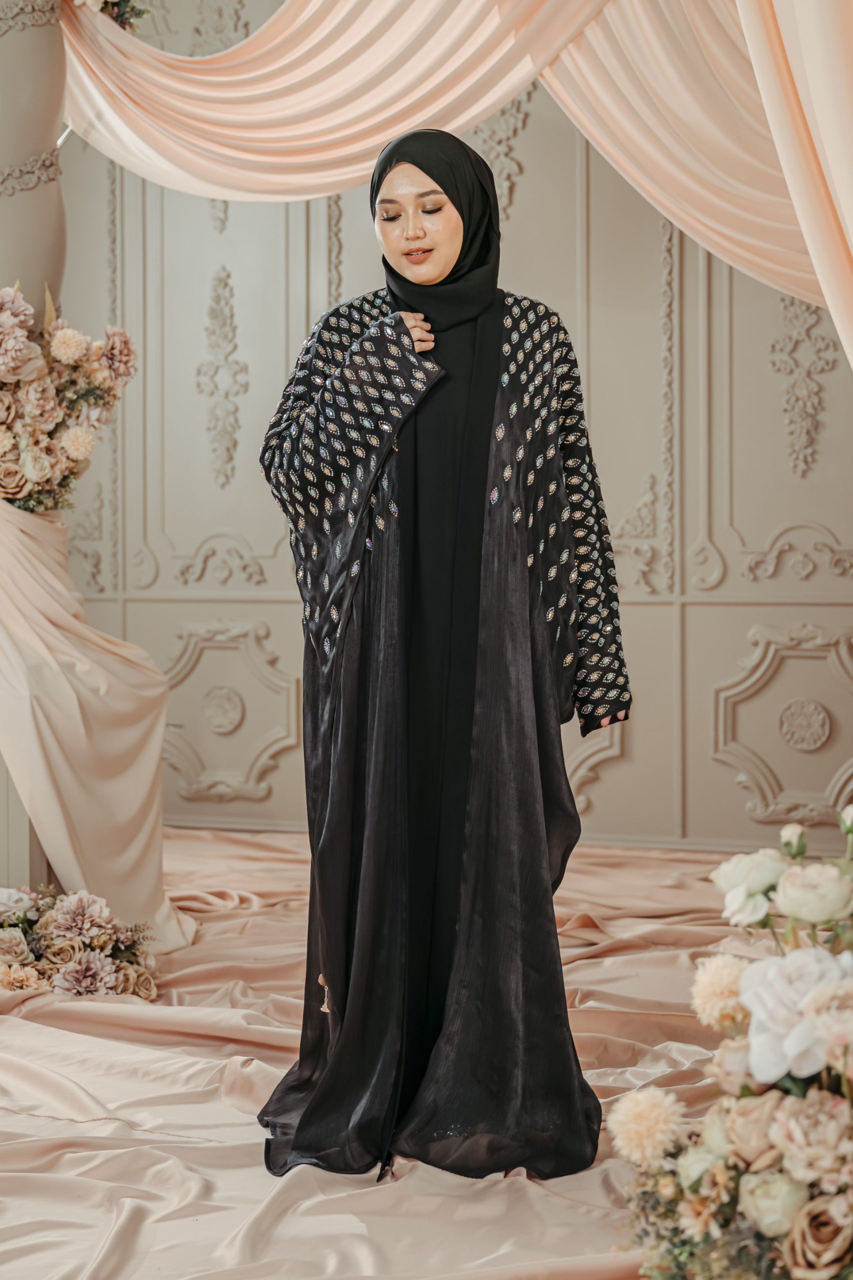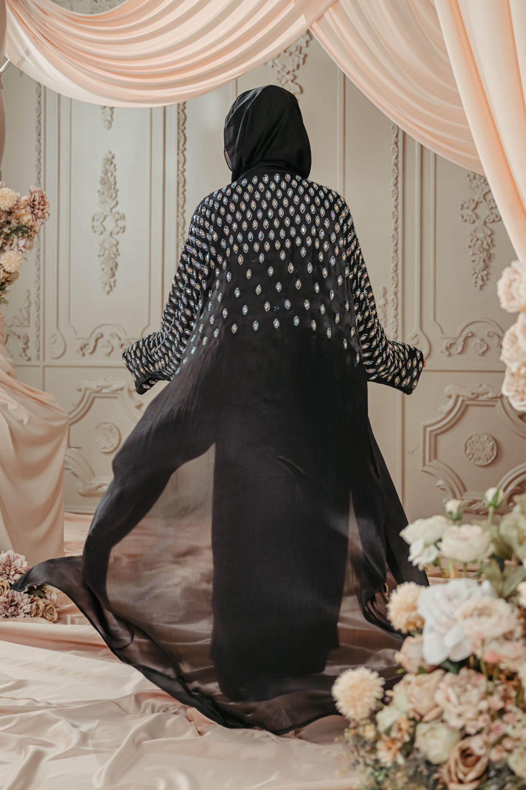 This elegant abaya is crafted with a flowing Farasha silhouette and adorned with delicate stone embellishments that shimmer beautifully with every movement. Designed with soft, comfortable Nida inner and lightweight open-front Rose Organza outer, it offers both structure and grace for a refined look. The soft drape enhances comfort while maintaining a luxurious feel, making it suitable for special occasions and formal gatherings.