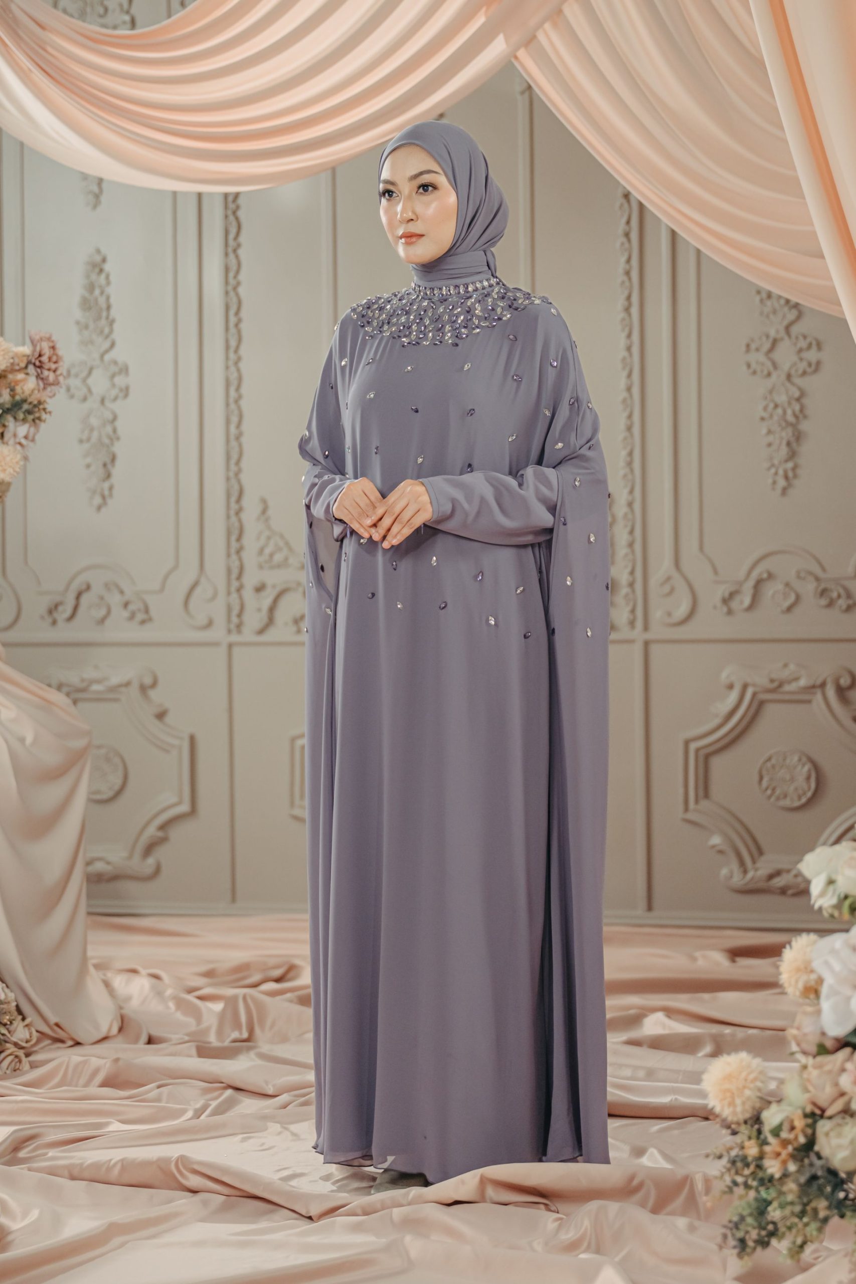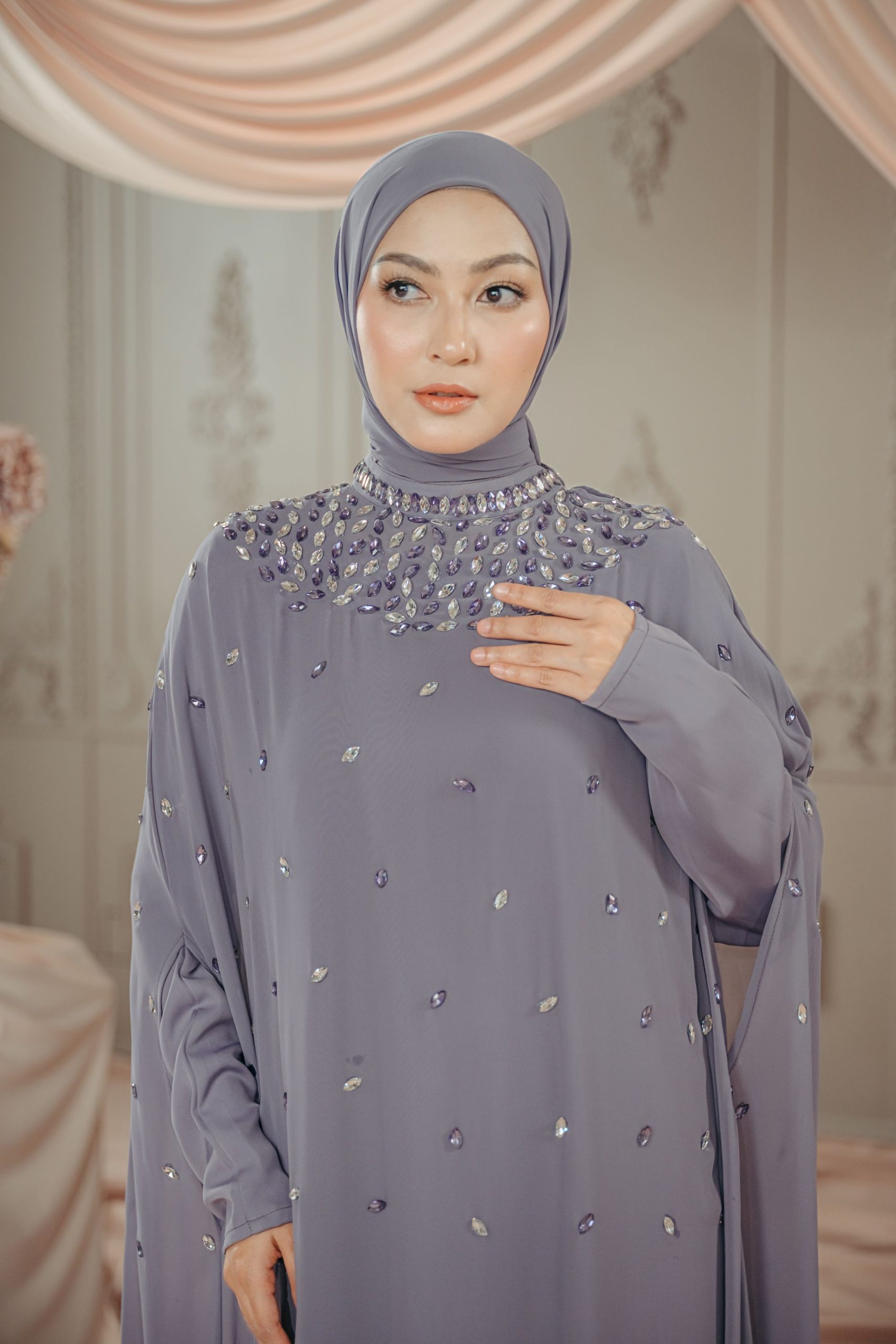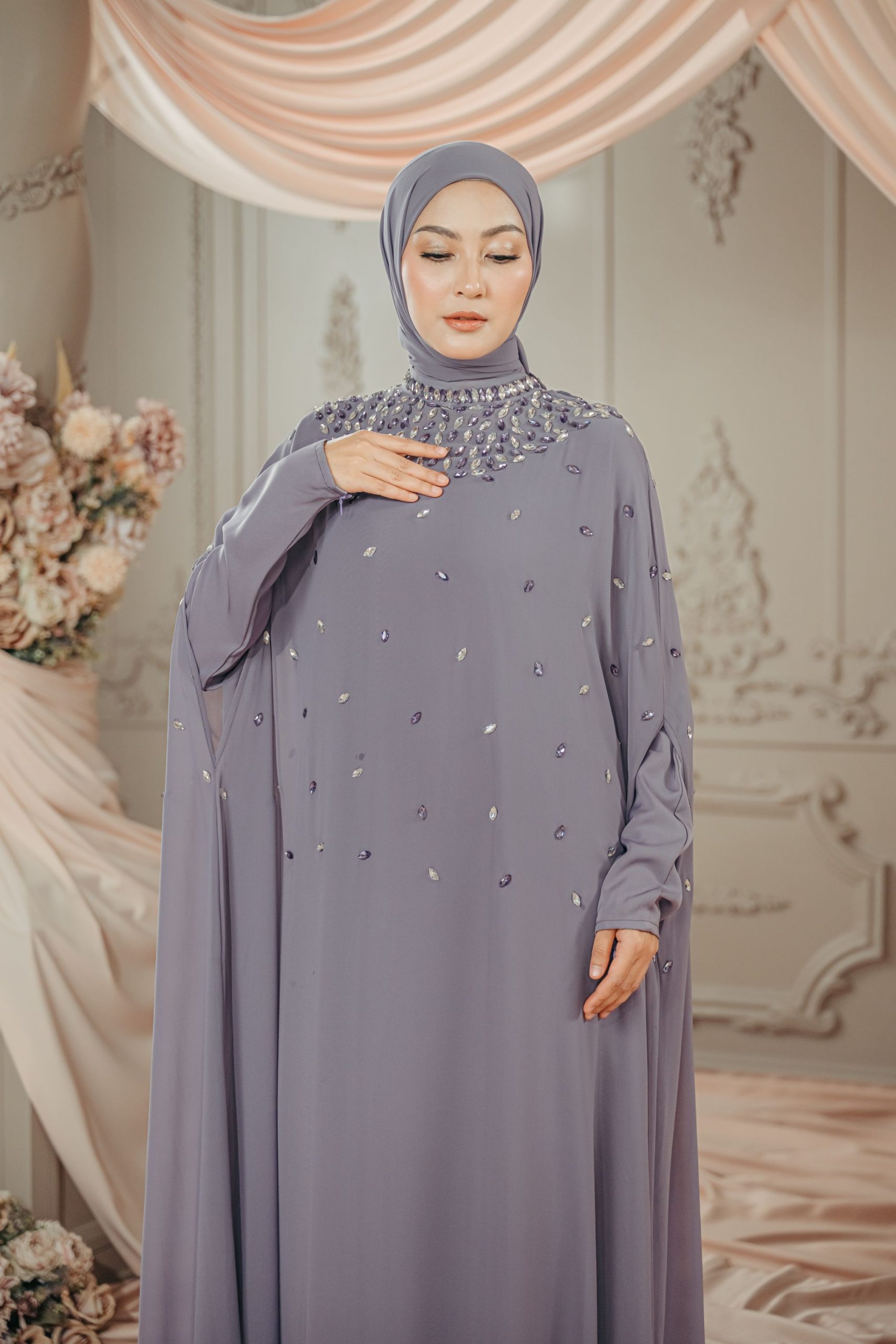 Step into timeless elegance with this stunning cape abaya, designed with a fluid, floor-length silhouette that moves beautifully with every step. This elegant abaya is crafted from two beautifully layered fabrics, featuring a soft nida inner lining for comfort and coverage, paired with a flowing chiffon outer layer that creates a light, graceful drape.  The high neckline is adorned with intricate beadwork and shimmering embellishments, creating a jeweled, elegant collar effect. Small scattered beads across the front add a subtle sparkle, enhancing the overall femininity of the design. Completed with a matching headscarf, this abaya brings together modesty, comfort, and luxury in one beautiful design.