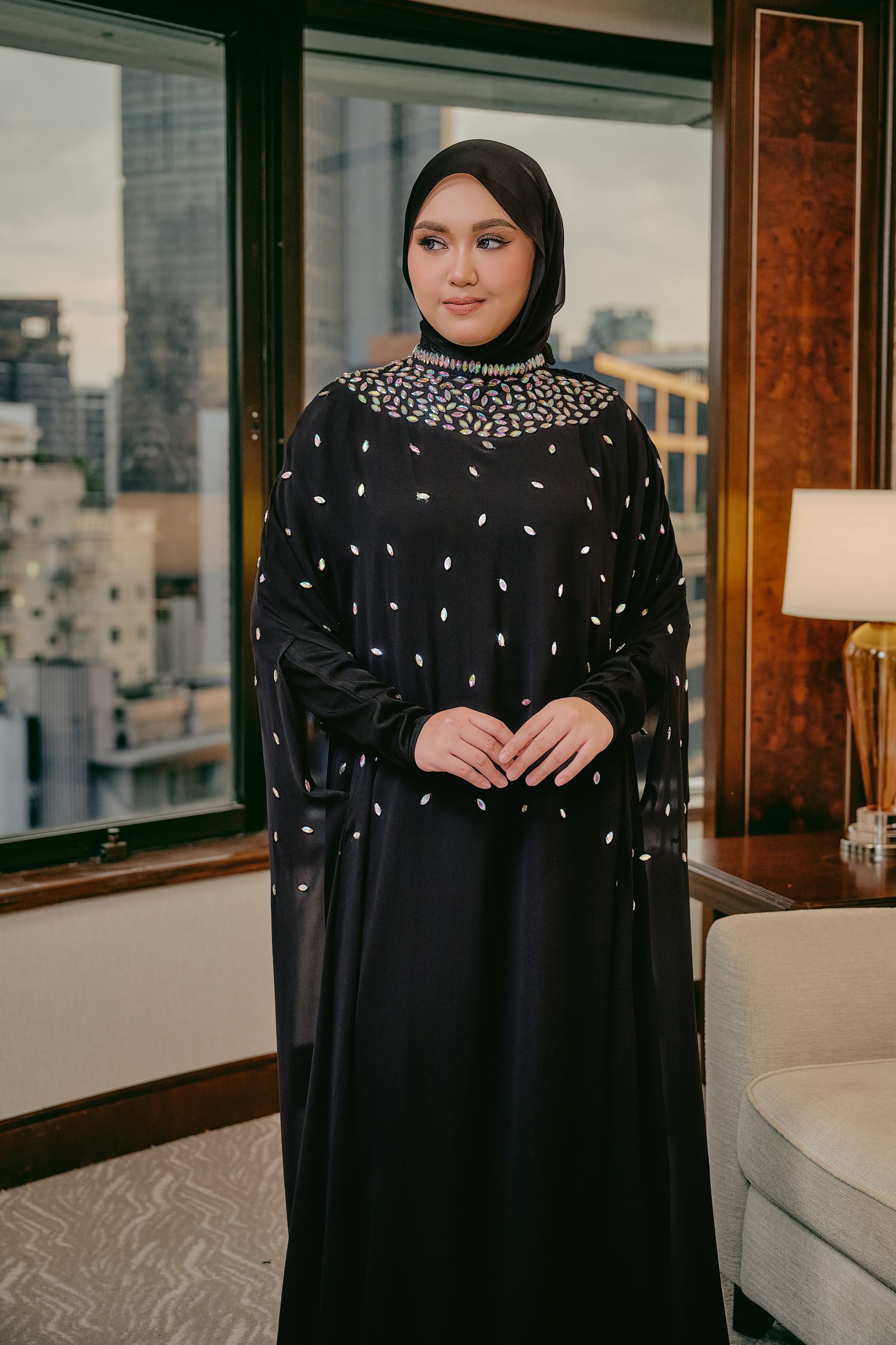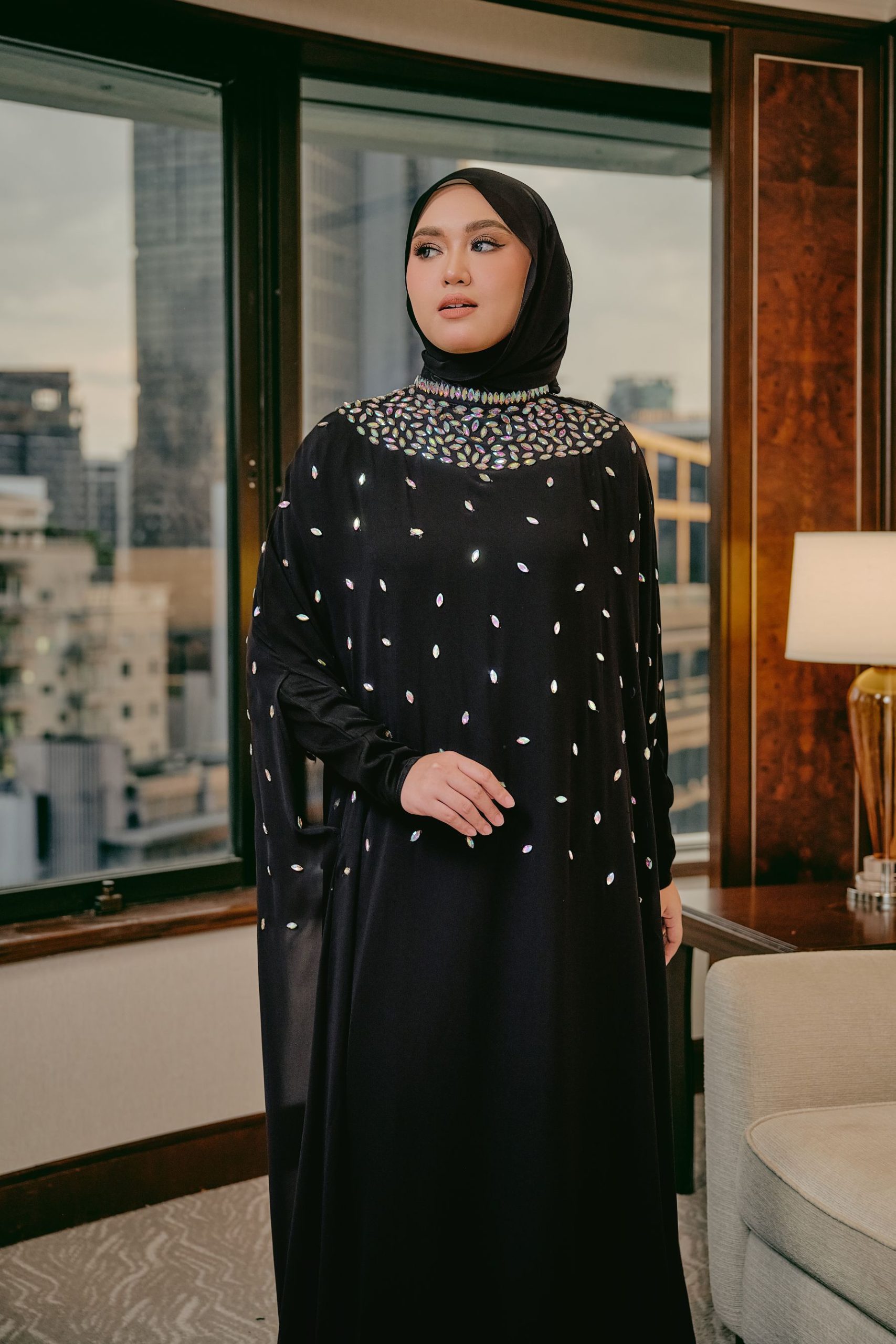 Step into timeless elegance with this stunning cape abaya, designed with a fluid, floor-length silhouette that moves beautifully with every step. This elegant abaya is crafted from two beautifully layered fabrics, featuring a soft nida inner lining for comfort and coverage, paired with a flowing chiffon outer layer that creates a light, graceful drape. Â The high neckline is adorned with intricate beadwork and shimmering embellishments, creating a jeweled, elegant collar effect. Small scattered beads across the front add a subtle sparkle, enhancing the overall femininity of the design. Completed with a matching headscarf, this abaya brings together modesty, comfort, and luxury in one beautiful design.