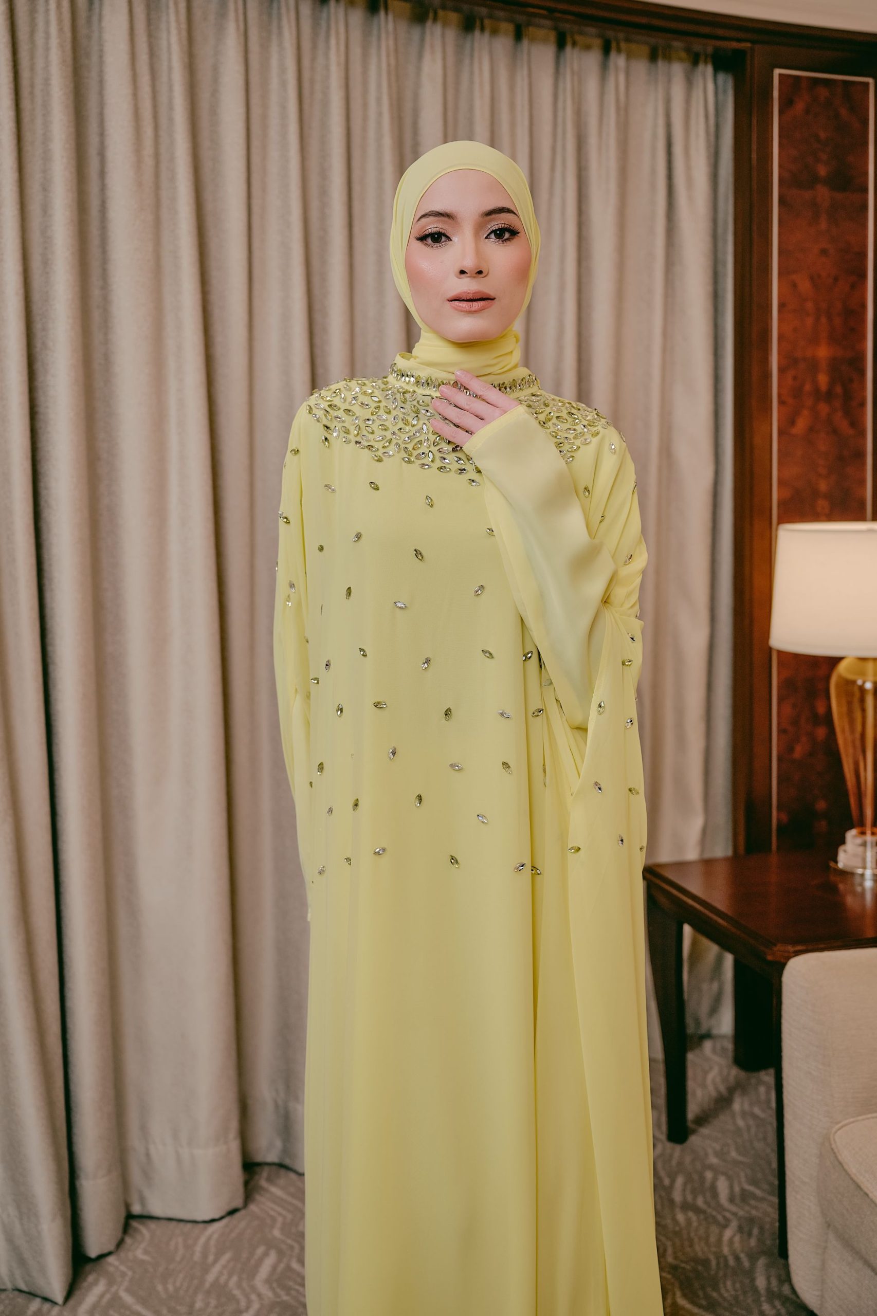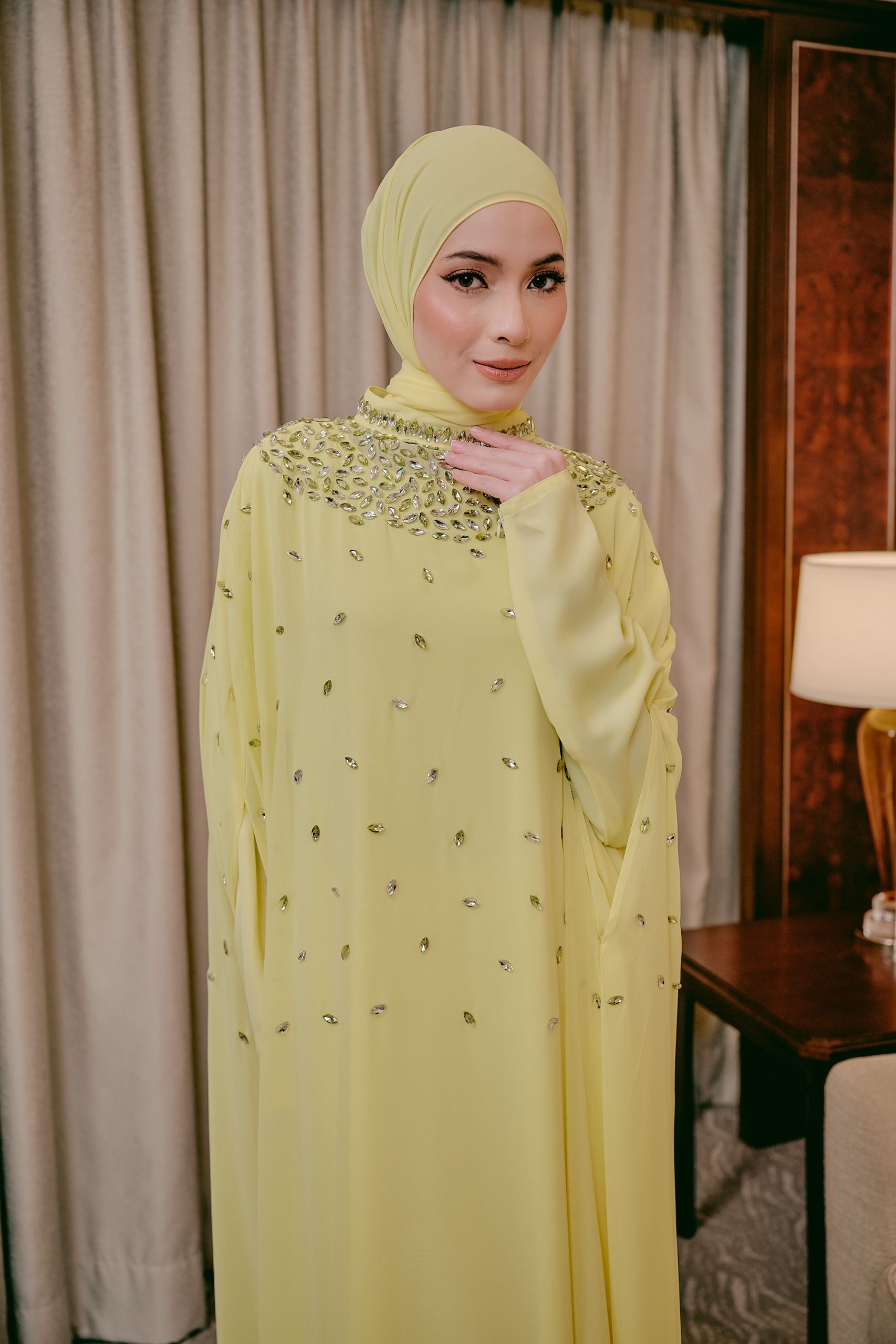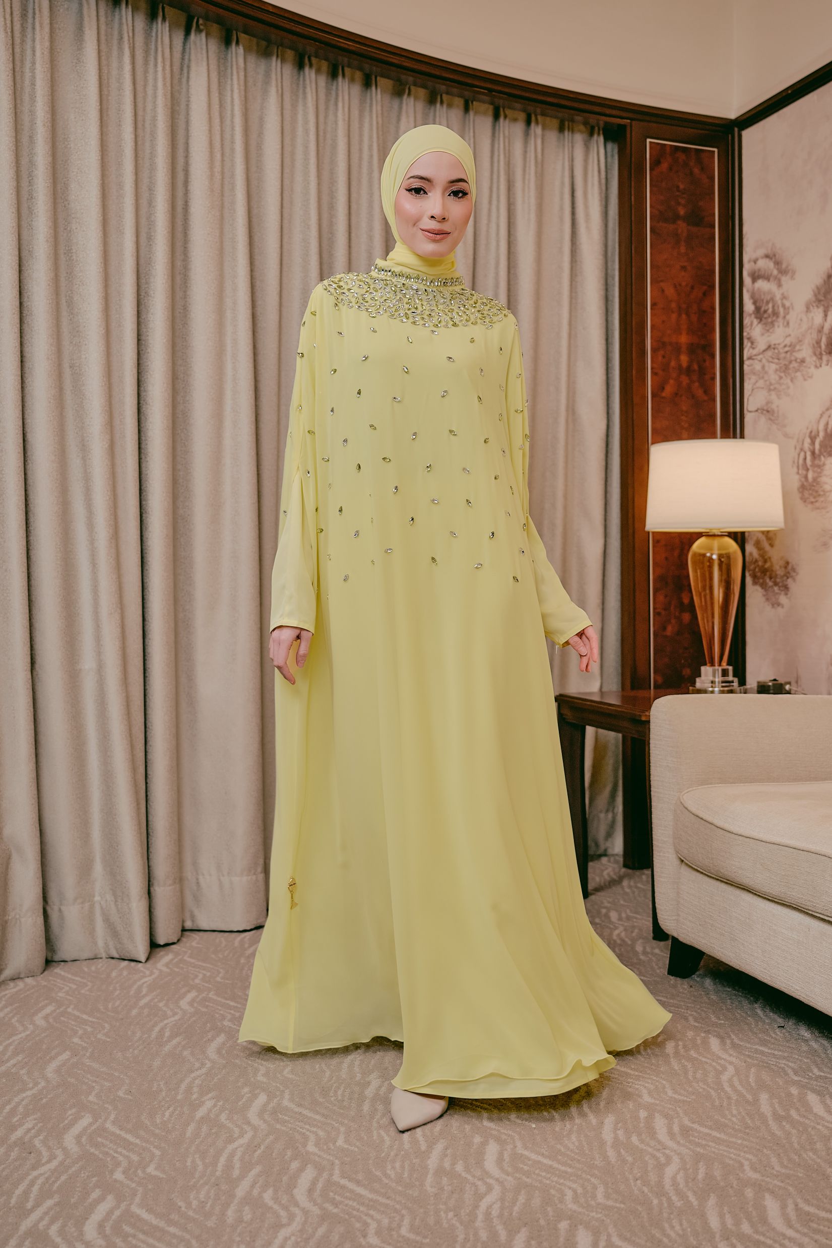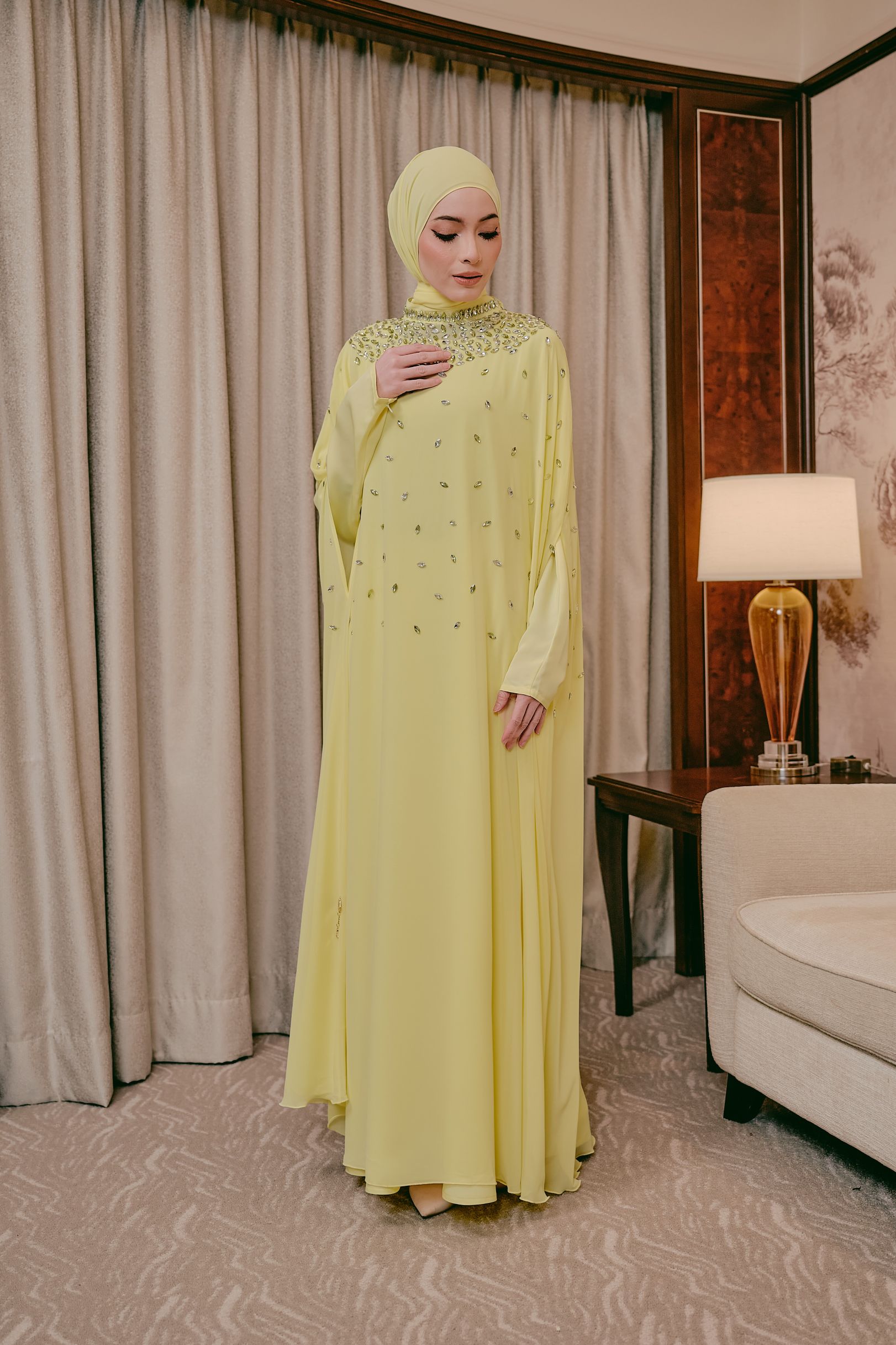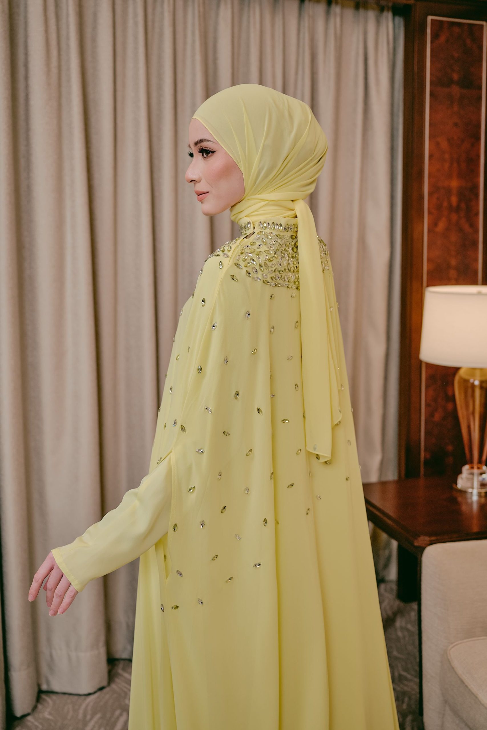 Step into timeless elegance with this stunning cape abaya, designed with a fluid, floor-length silhouette that moves beautifully with every step. This elegant abaya is crafted from two beautifully layered fabrics, featuring a soft nida inner lining for comfort and coverage, paired with a flowing chiffon outer layer that creates a light, graceful drape.  The high neckline is adorned with intricate beadwork and shimmering embellishments, creating a jeweled, elegant collar effect. Small scattered beads across the front add a subtle sparkle, enhancing the overall femininity of the design. Completed with a matching headscarf, this abaya brings together modesty, comfort, and luxury in one beautiful design.