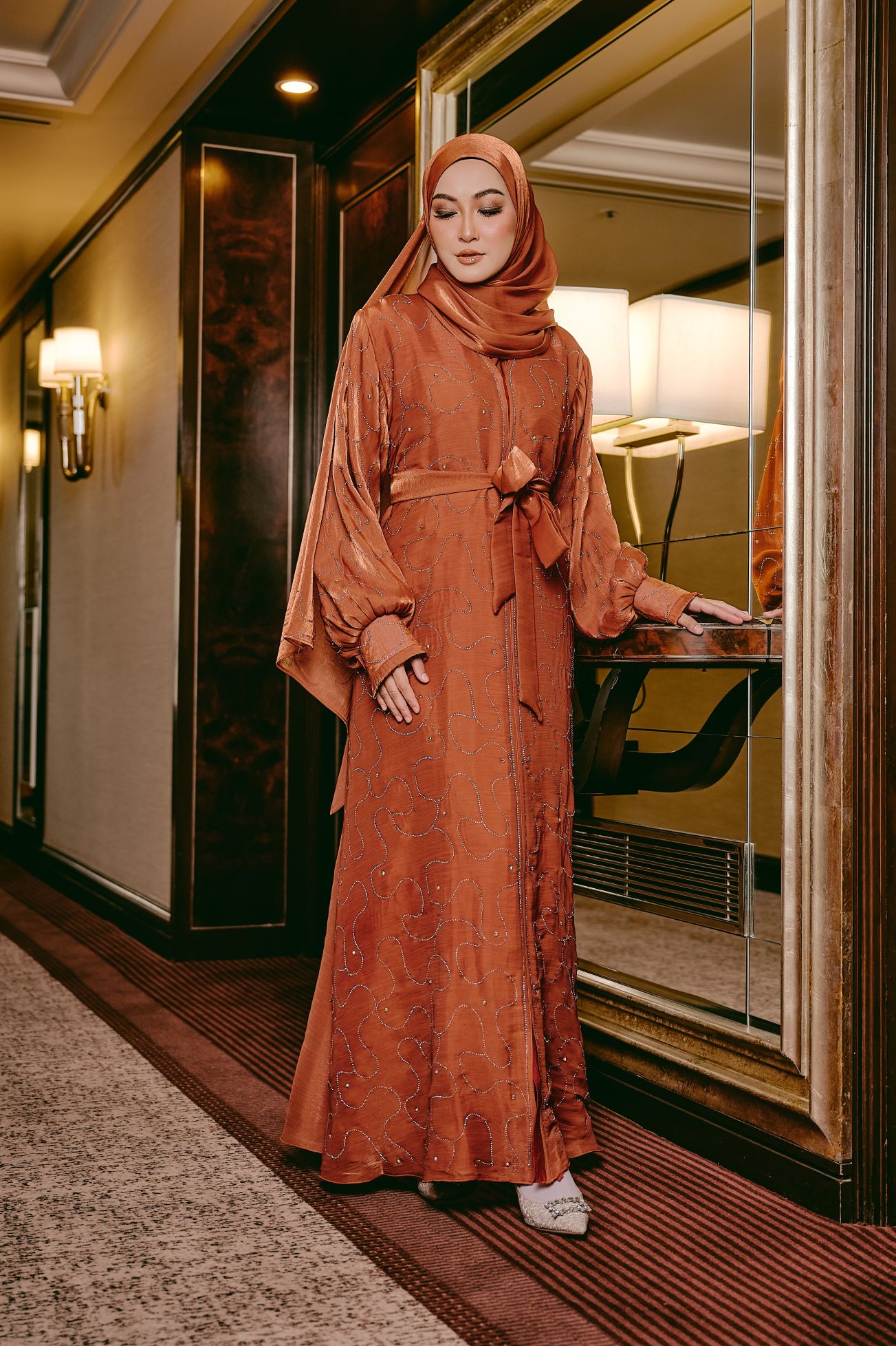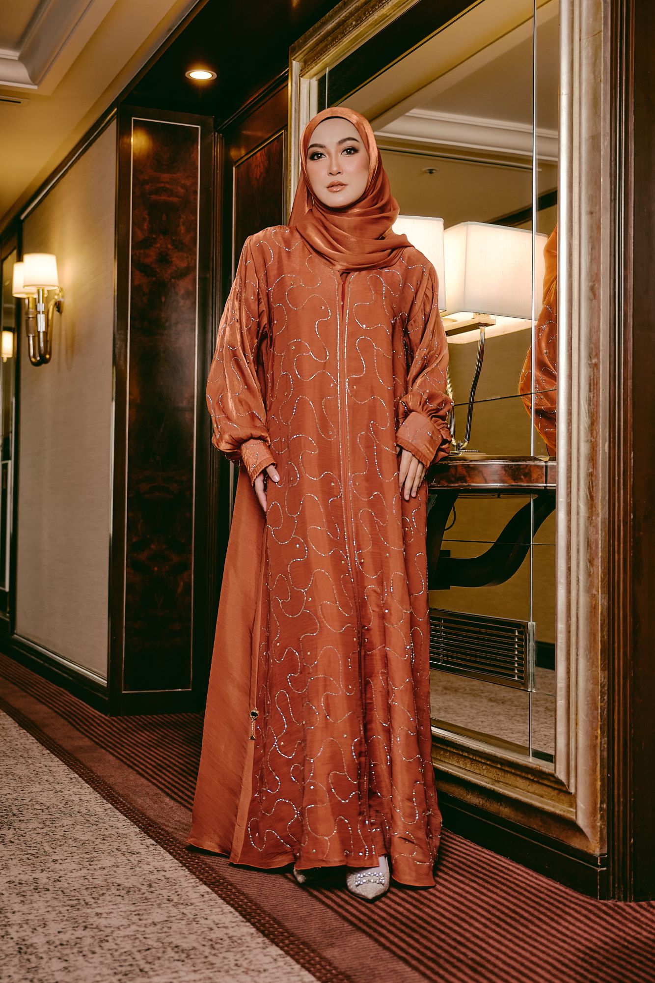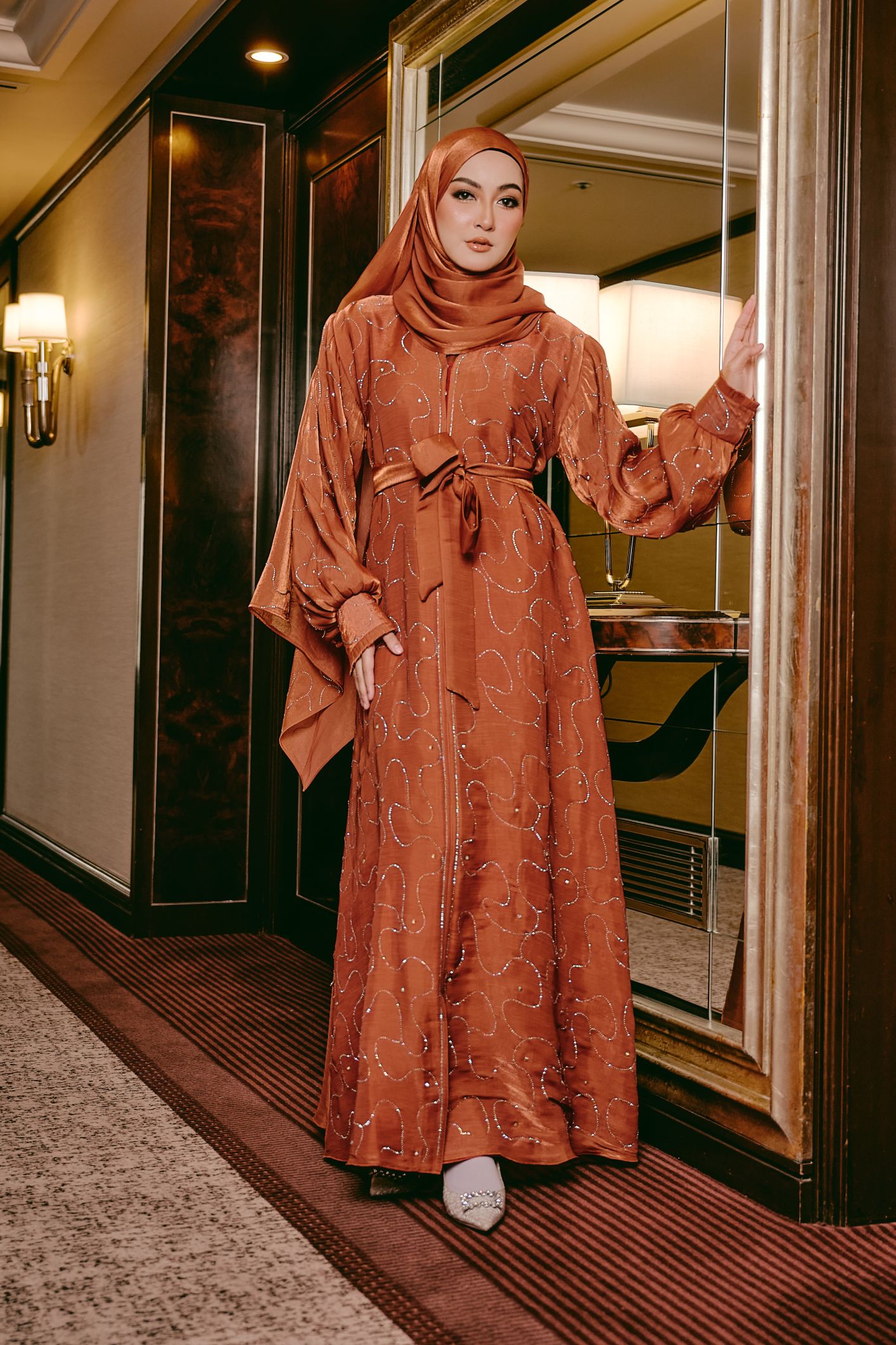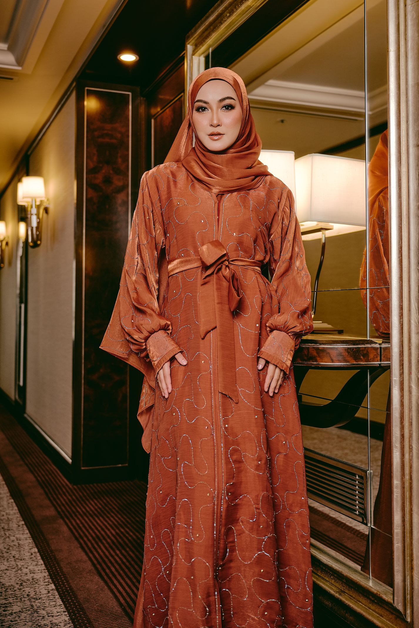 This elegant abaya is enhanced with delicate stone detailing that adds a soft, subtle shimmer. Designed with soft, sheer Rose Organza fabric and bishop sleeves, this abaya features a matching fabric belt that can be worn to cinch the waist or removed for a relaxed, flowy look. The full-length silhouette drapes beautifully, offering both comfort and effortless elegance for special occasions or everyday wear. Paired with a matching hijab, this abaya embodies timeless sophistication with versatile styling options.