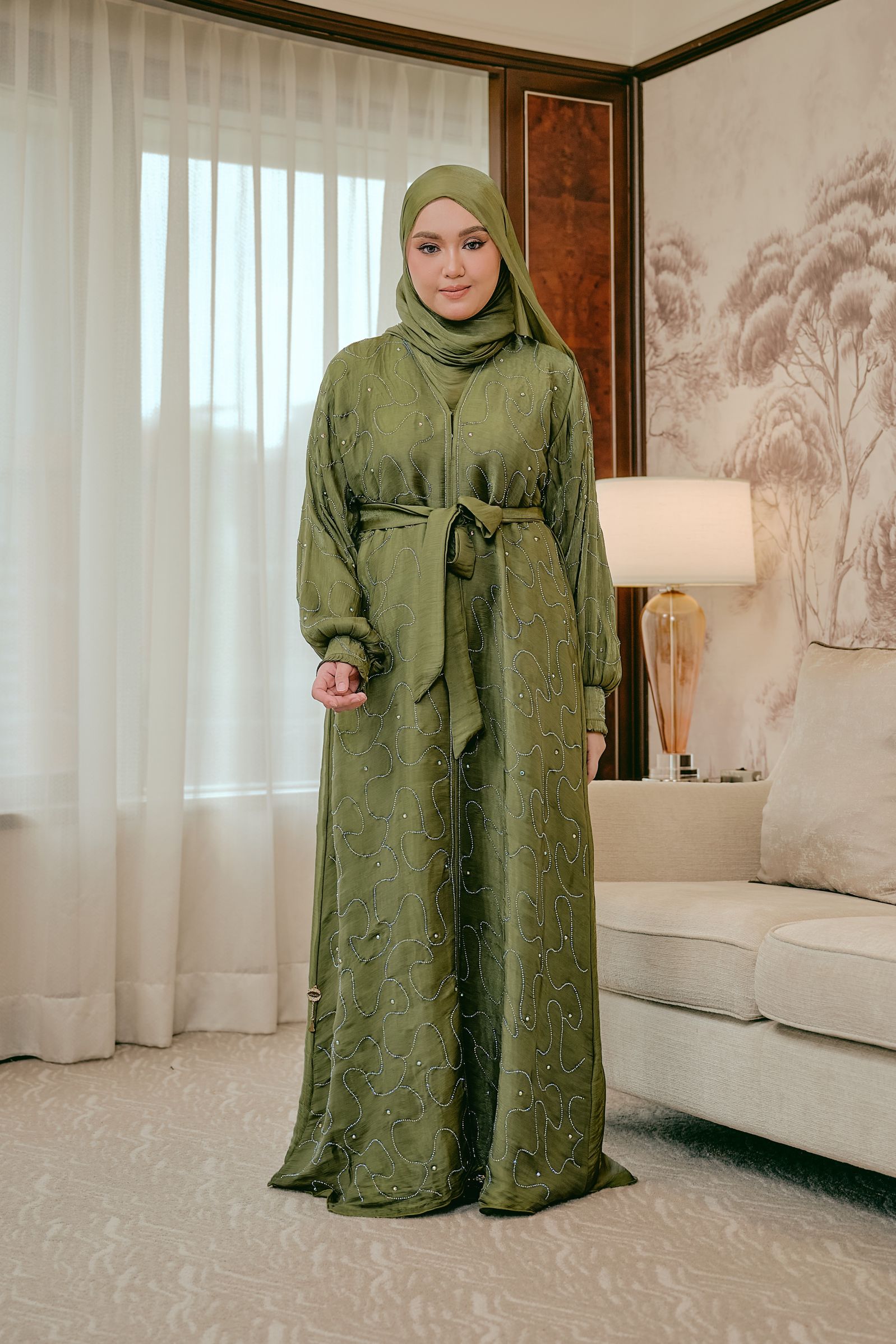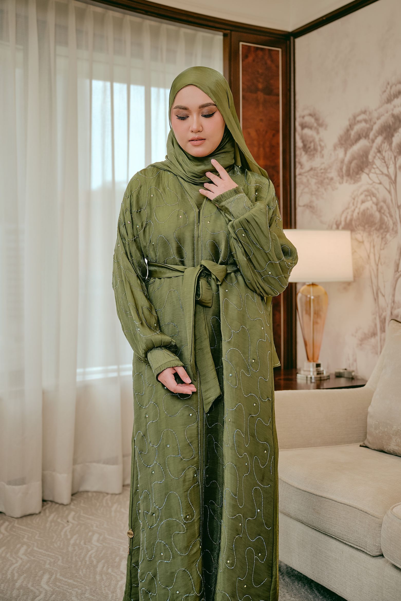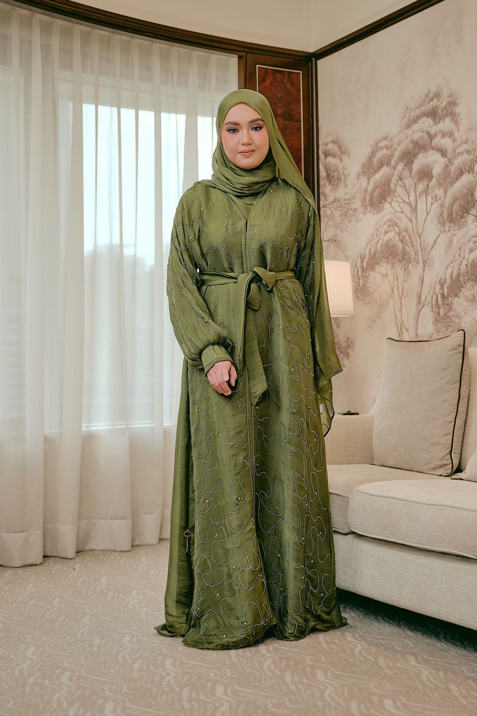 This elegant abaya is enhanced with delicate stone detailing that adds a soft, subtle shimmer. Designed with soft, sheer Rose Organza fabric and bishop sleeves, this abaya features a matching fabric belt that can be worn to cinch the waist or removed for a relaxed, flowy look. The full-length silhouette drapes beautifully, offering both comfort and effortless elegance for special occasions or everyday wear. Paired with a matching hijab, this abaya embodies timeless sophistication with versatile styling options.