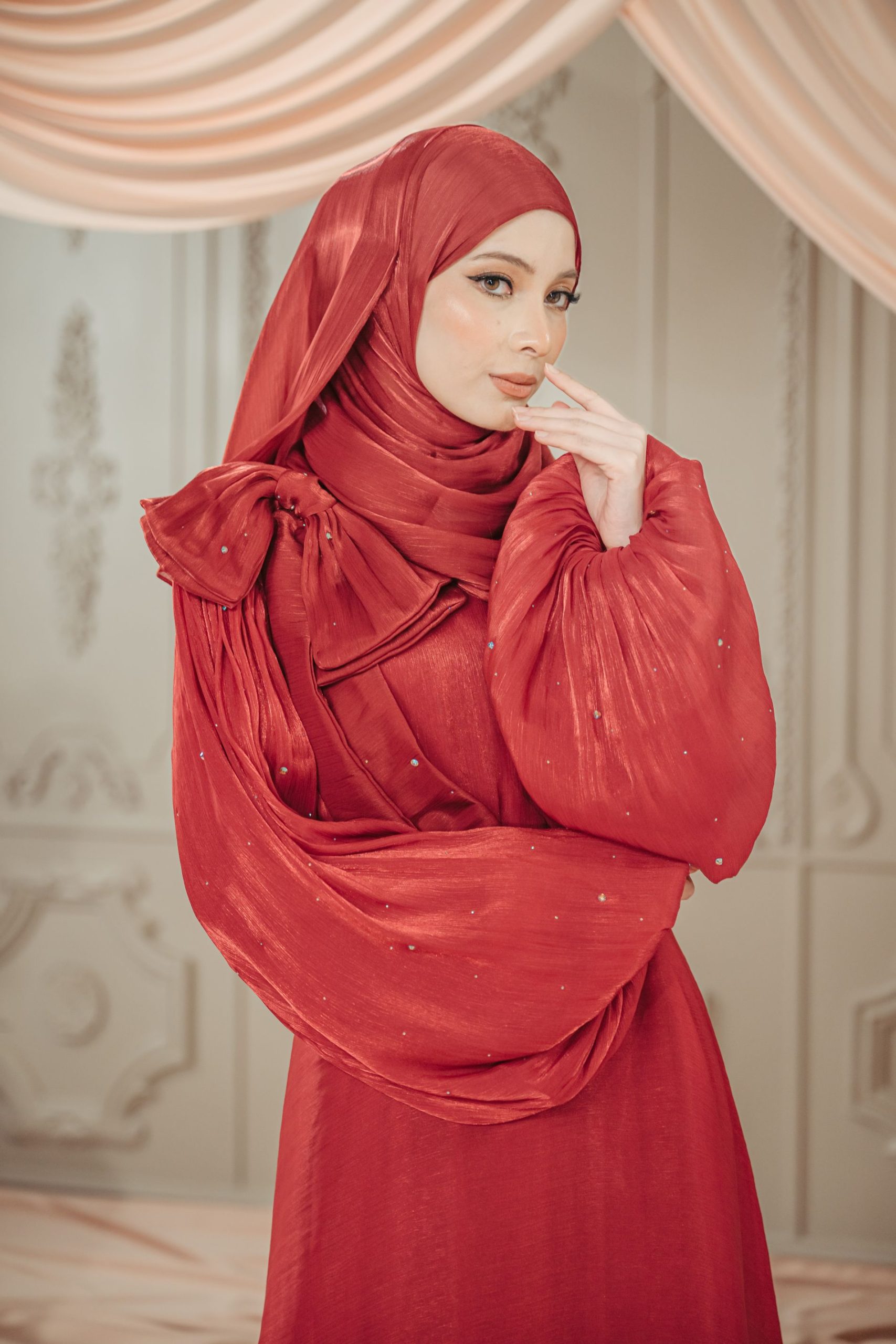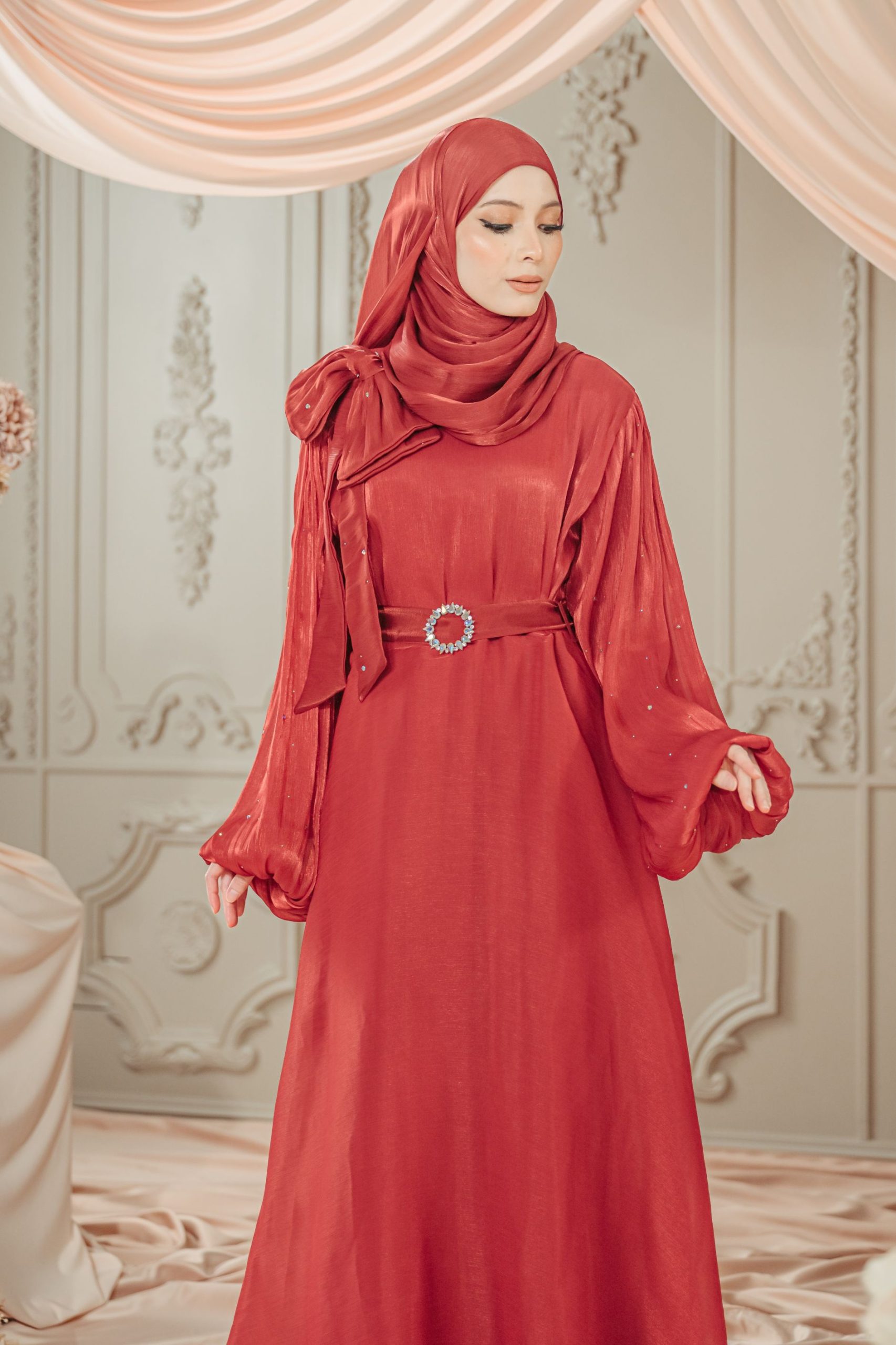 This elegant abaya is crafted from a soft, shimmery Rose Organza fabric that flows beautifully with every movement. The design features voluminous sleeves adorned with delicate stone embellishments, adding a subtle touch of sparkle. A charming ribbon detail sits gracefully on one shoulder, enhancing the feminine and refined look. The abaya is finished with a statement belt featuring a crystal-embellished buckle, creating a flattering silhouette perfect for special occasions.