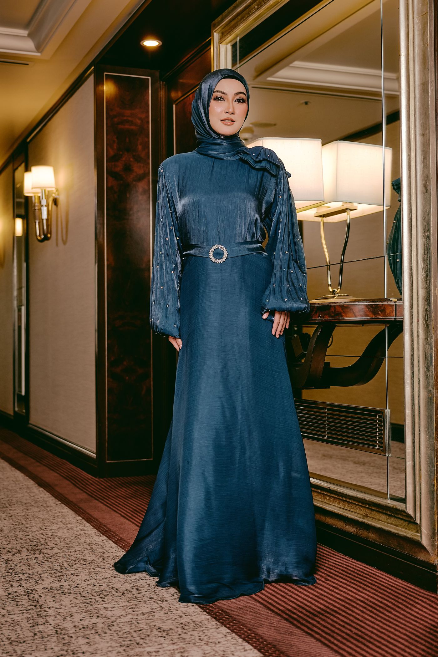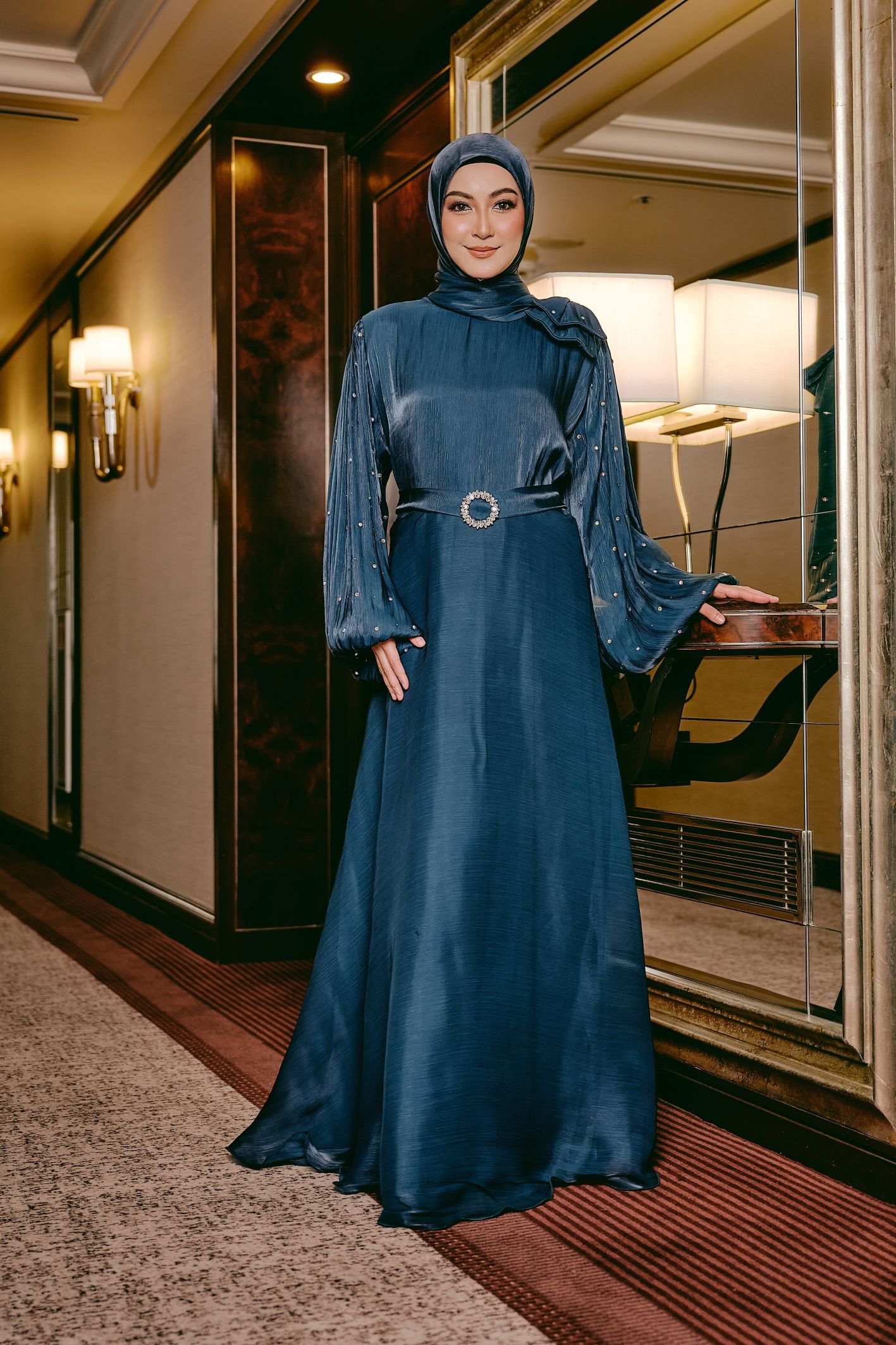 This elegant abaya is crafted from a soft, shimmery Rose Organza fabric that flows beautifully with every movement. The design features voluminous sleeves adorned with delicate stone embellishments, adding a subtle touch of sparkle. A charming ribbon detail sits gracefully on one shoulder, enhancing the feminine and refined look. The abaya is finished with a statement belt featuring a crystal-embellished buckle, creating a flattering silhouette perfect for special occasions.