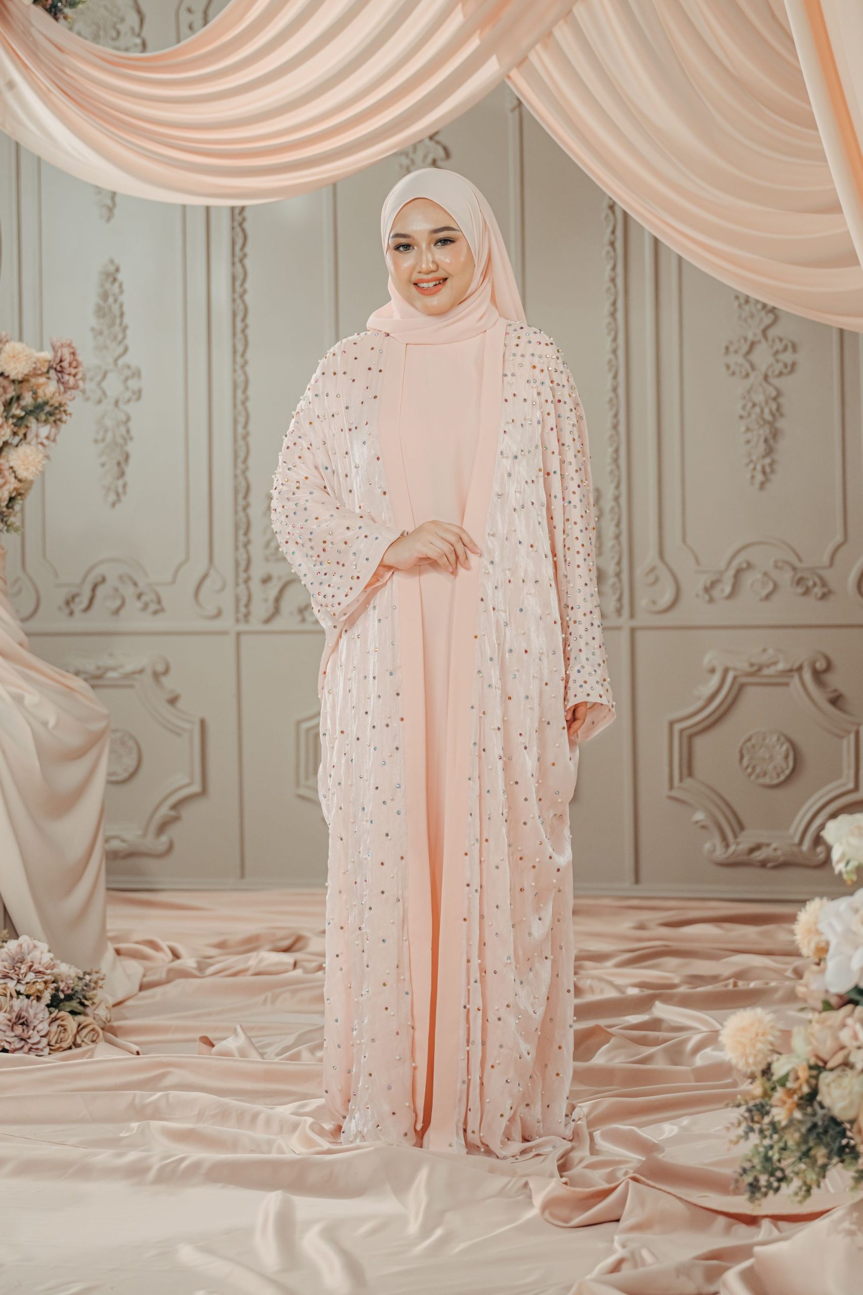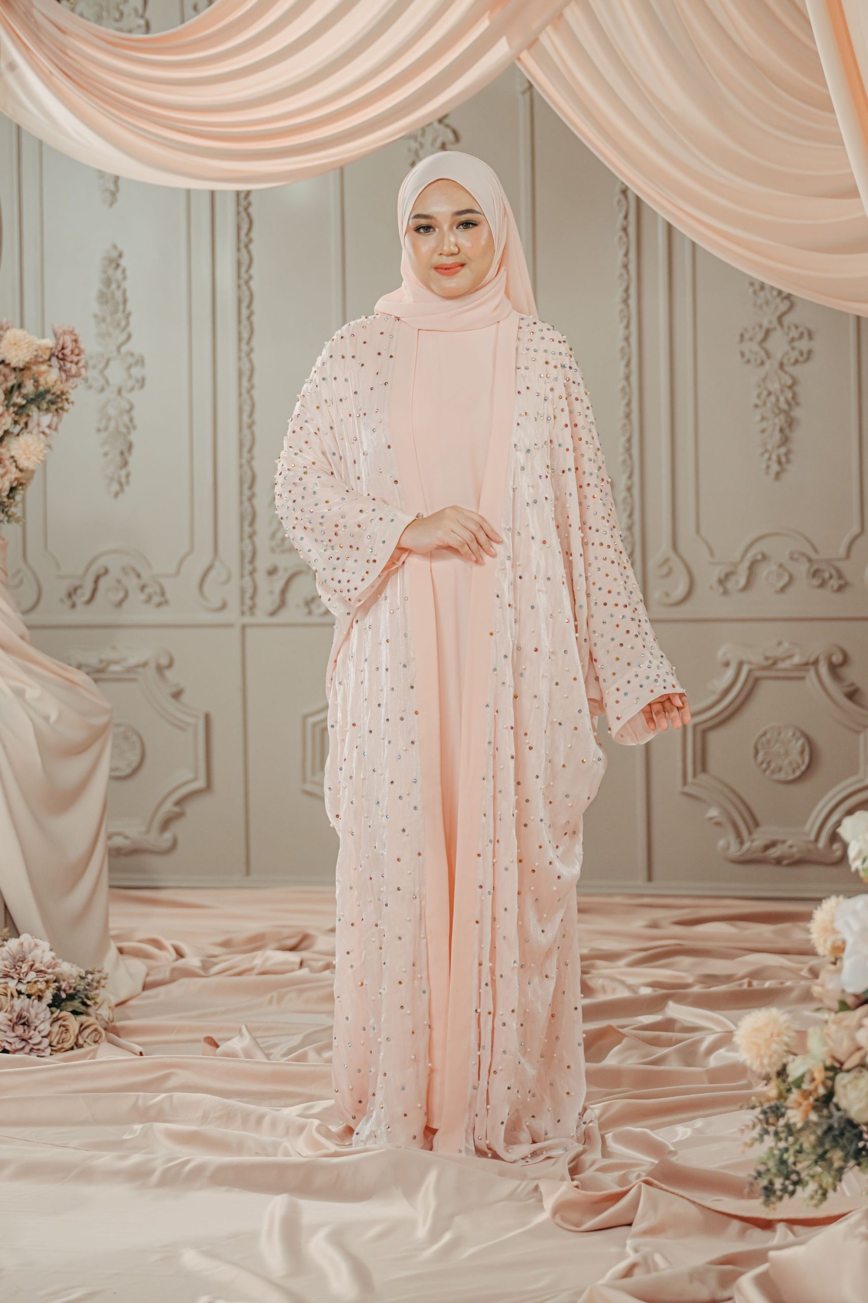 This elegant abaya is designed in a graceful farasha cut, offering a flowing and modest silhouette with beautiful movement. It features a refined nida fabric inner layer that provides comfort and structure, paired with a delicate outer layer of rose organza that drapes softly over the design. The outer layer is adorned with intricate stone and pearl details, adding a touch of shimmer and understated luxury. With its wide, airy sleeves and layered construction, this abaya is perfect for special occasions, combining timeless elegance with modern sophistication.
