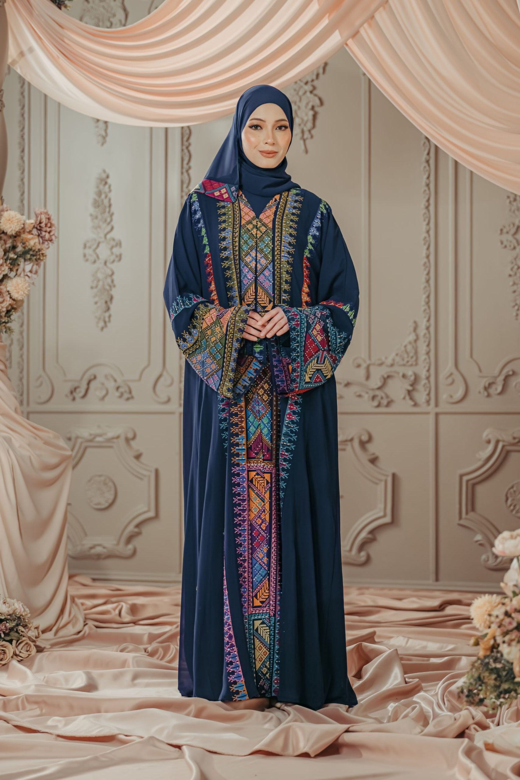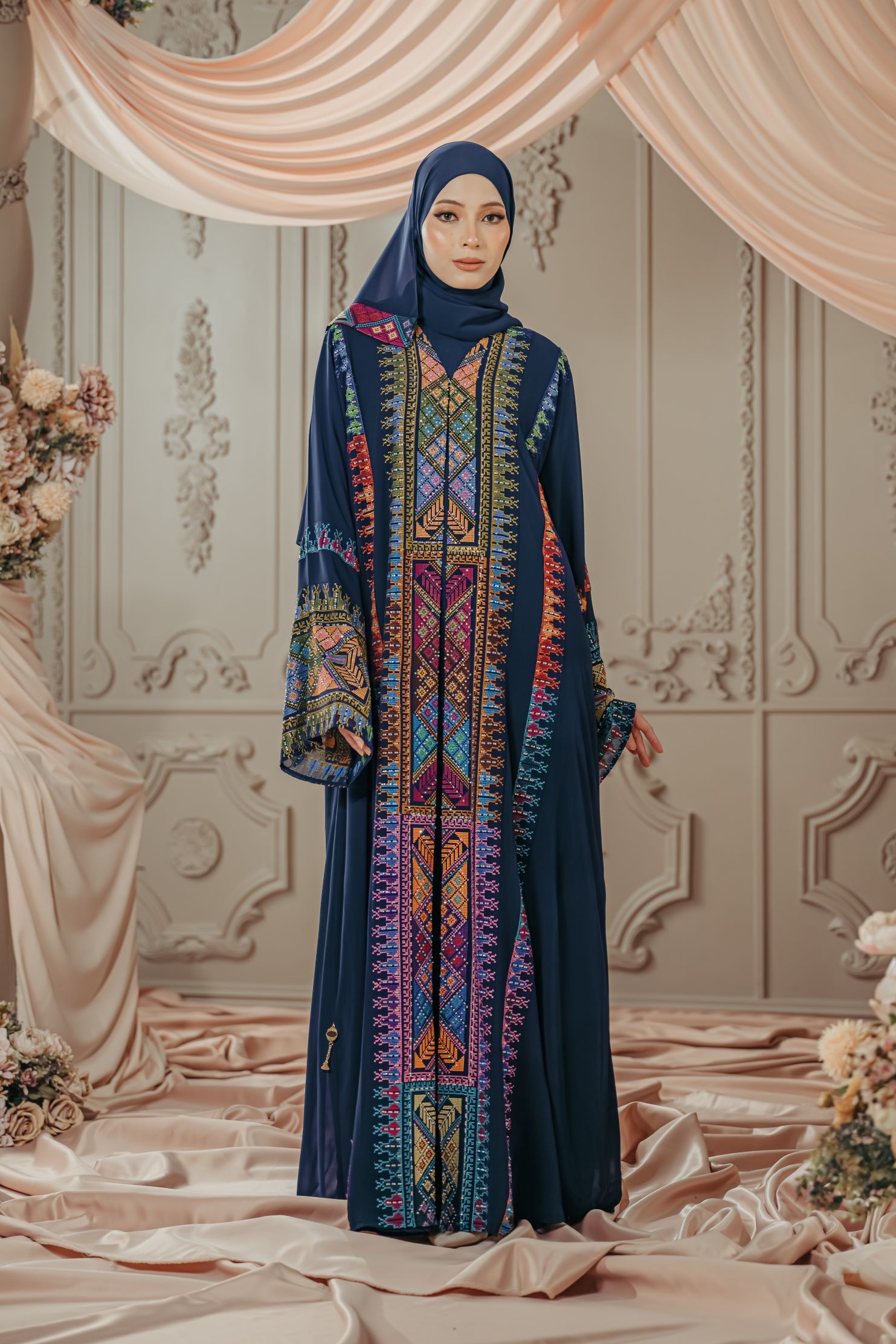 This exquisite abaya showcases beautiful Palestine lace embroidery that adorns the front, sleeves, and back. The intricate patterns feature vibrant geometric motifs in bursts of colors—highlighting the rich cultural artistry of traditional Palestinian craftsmanship. Made from lightweight, flowy nida/satin for the inner and chiffon for the outer, this abaya drapes gracefully and moves effortlessly with every step. The relaxed silhouette and wide laced sleeves offer both comfort and striking elegance, making this piece perfect for festive occasions, cultural celebrations, and special events.