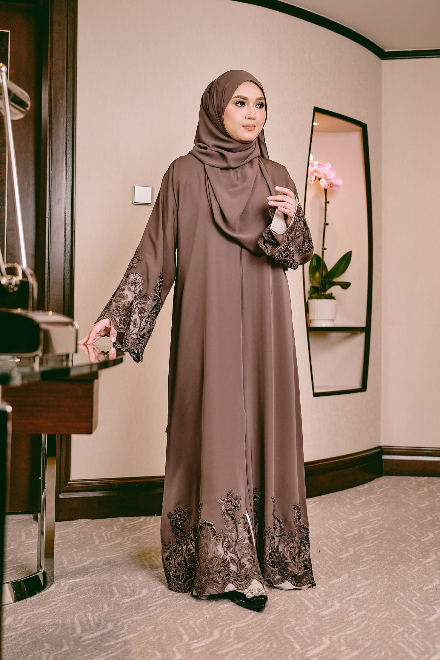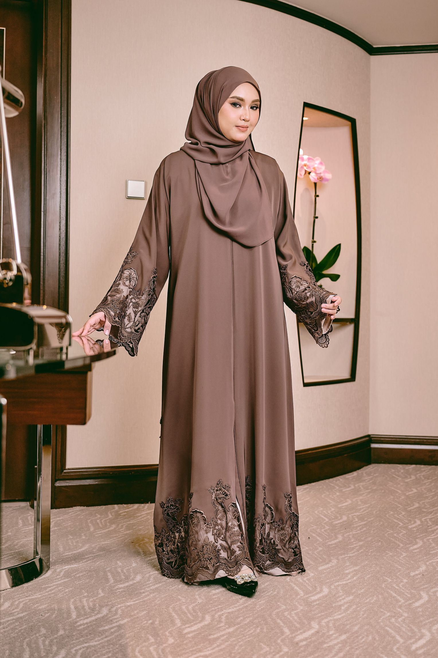 This abaya features a fluid, drapey silhouette that falls effortlessly for a refined and elegant look. Its standout detail is the intricate embroidered lace adorning the sleeve cuffs and hem, adding texture, femininity and a touch of sophistication without overpowering the design. The nida fabric used to design this abaya has a smooth, premium finish that gives it a graceful flow with every movement. A timeless piece that blends modesty with couture-level detailing.