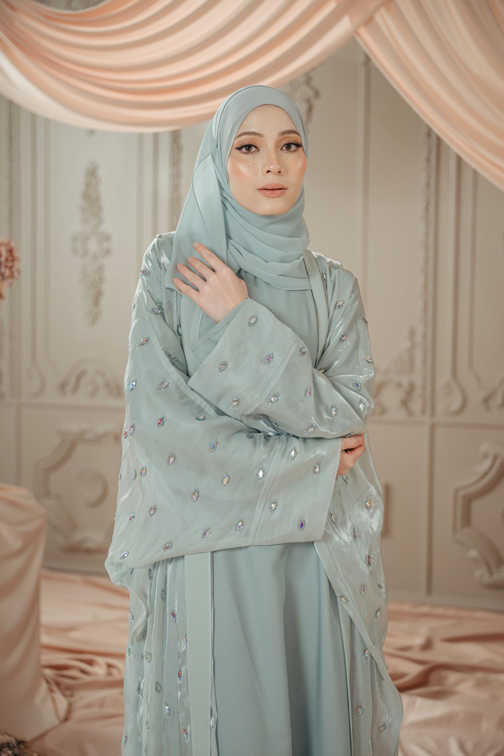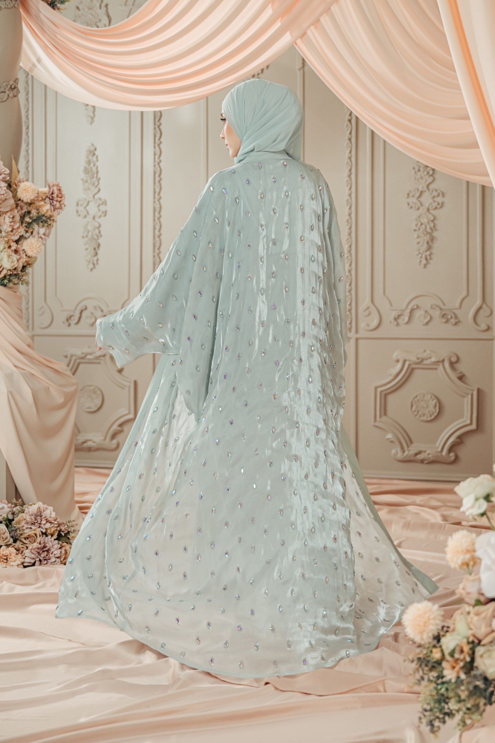 This elegant abaya features a graceful layered design with a smooth inner dress paired with a lightweight, sheer outer layer. The outer layer is adorned with delicate stone embellishments scattered throughout, adding a subtle shimmer and refined charm. Designed with flowing, wide sleeves, it drapes beautifully to create a soft, airy silhouette that moves effortlessly with every step. Perfect for special occasions, this abaya combines modesty with understated luxury for a timeless and sophisticated look.