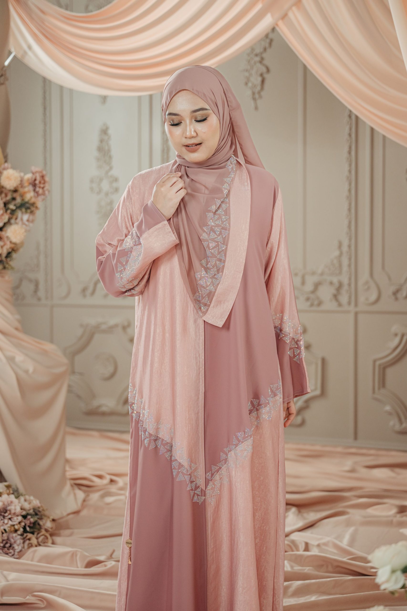 This statement abaya embodies refined elegance and exceptional craftsmanship. Designed with a flowing, graceful silhouette, it features contrasting textured panels that add depth and a luxurious finish. Intricate geometric stone embellishments along the sleeves and hem enhance the design with a sophisticated, contemporary touch. Crafted from fluid fabric for a smooth, elegant drape, it offers both comfort and style, perfectly paired with a coordinating hijab. Ideal for festive occasions and formal evenings, this abaya reflects timeless glamour and modern refinement.