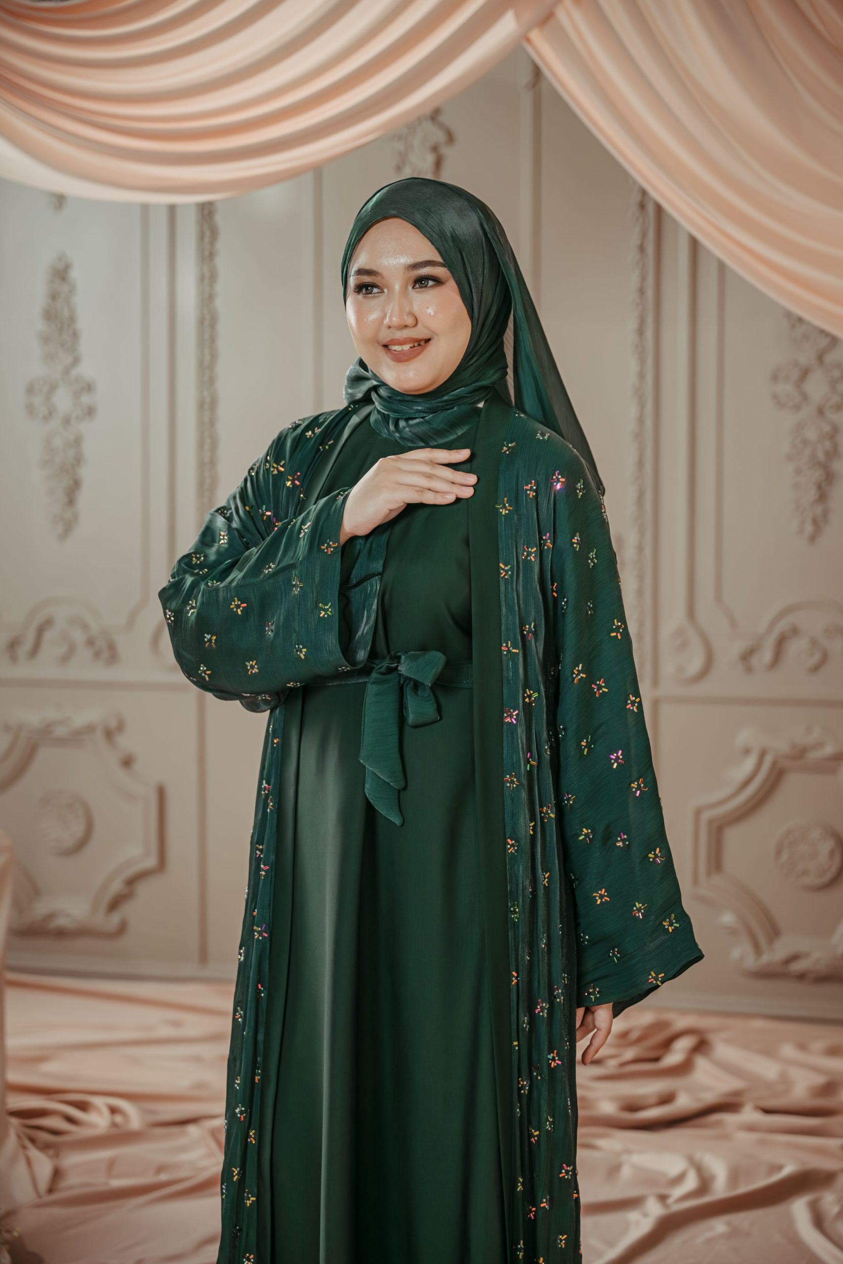 Enchant in this beautiful shimmery abaya – Stargaze Abaya. Sparkle from far, this abaya is made of two different fabrics; lightweight Rose Organza fabric for the outer and soft Nida fabric for the inner. Lavish sparkles of stones are adorned on top of the outer to make you shine like a star! Perfect for Eids, special occasions and any festivity celebrations!