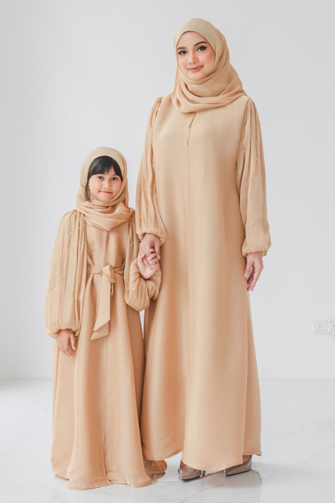 Happiness is matching outfits! Incorporate soft shimmers into your daily look with this Maya Abaya which is available for both adults and kids. This abaya is made from a lightweight and sheer Rose Organza fabric that is delicate, graceful and comfortable to wear. The bishop sleeves for Maya Stones are adorned with beautiful and bright stones while Maya Net is embellished with stretchable net cuff with colourful and sparkly stones on top. Perfect for this eid, special occassions and any festivity celebrations!